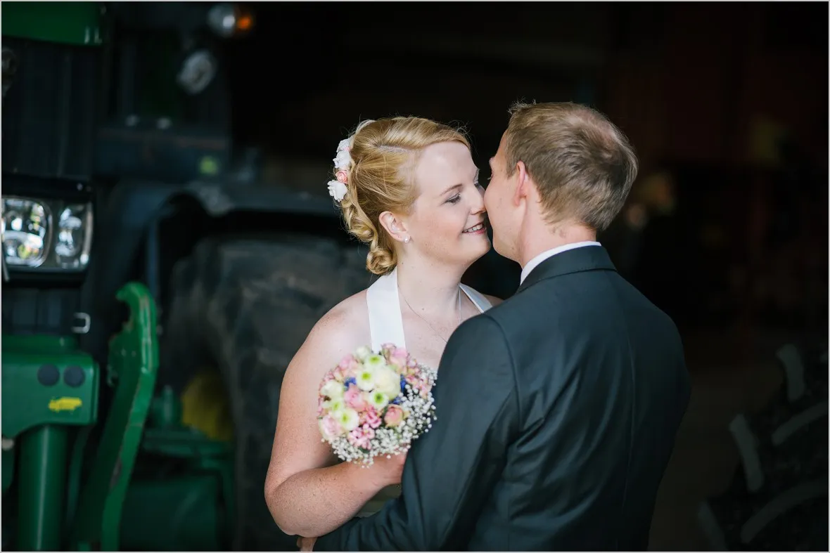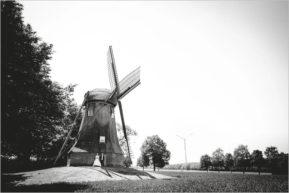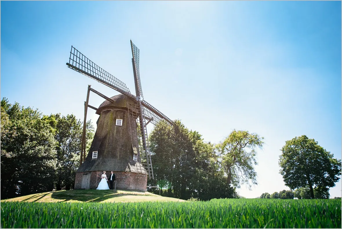 Stadtkind trifft Hobbybauern. Ein Brautpaar mit ganz viel Herz und Hund. Ja, ein Hund, und der ist für die Beiden sehr wichtig. Das merkte ich schnell. Es war so herrlich einfach und sympathisch und wir haben viel gelacht. Ein tolles Paar! Drahthaar Baloo war noch kurz vor den Bildern im Graben und sah noch etwas anders aus ????. Aber das hat er ja noch mal hinbekommen. Wunderbare Paarbilder auf dem Bauernhof in Ahaus Quantwick und Windmühle entstanden.