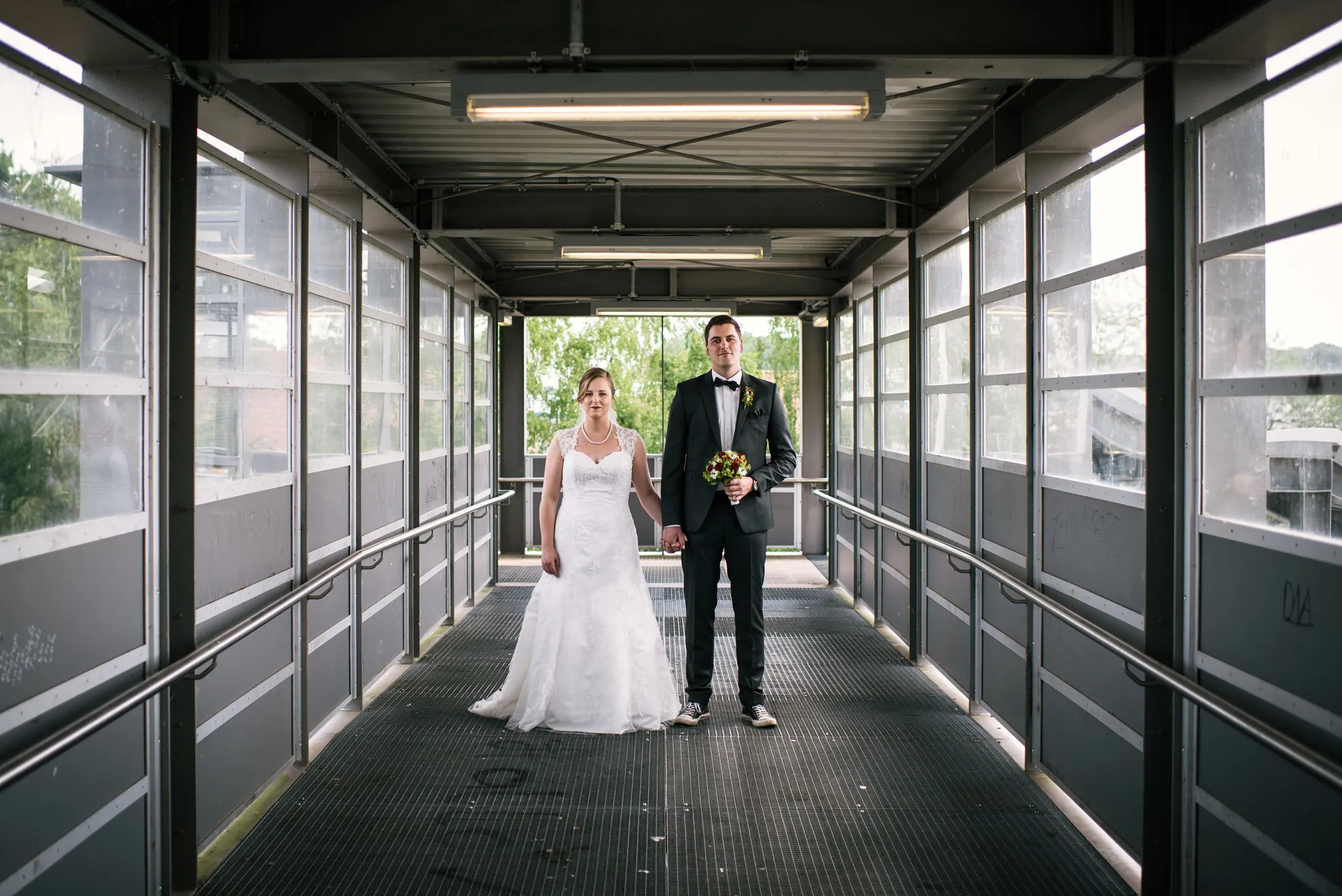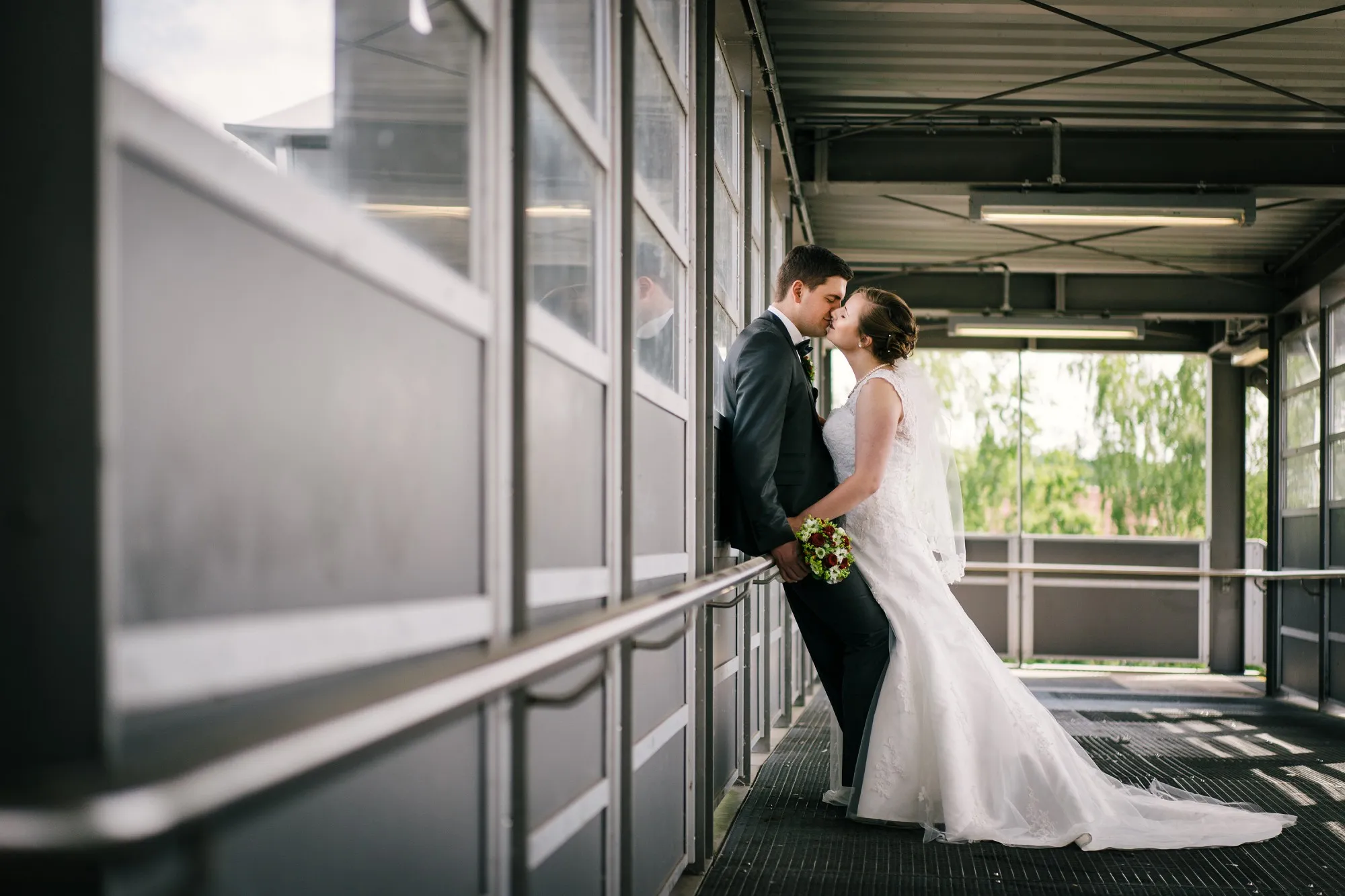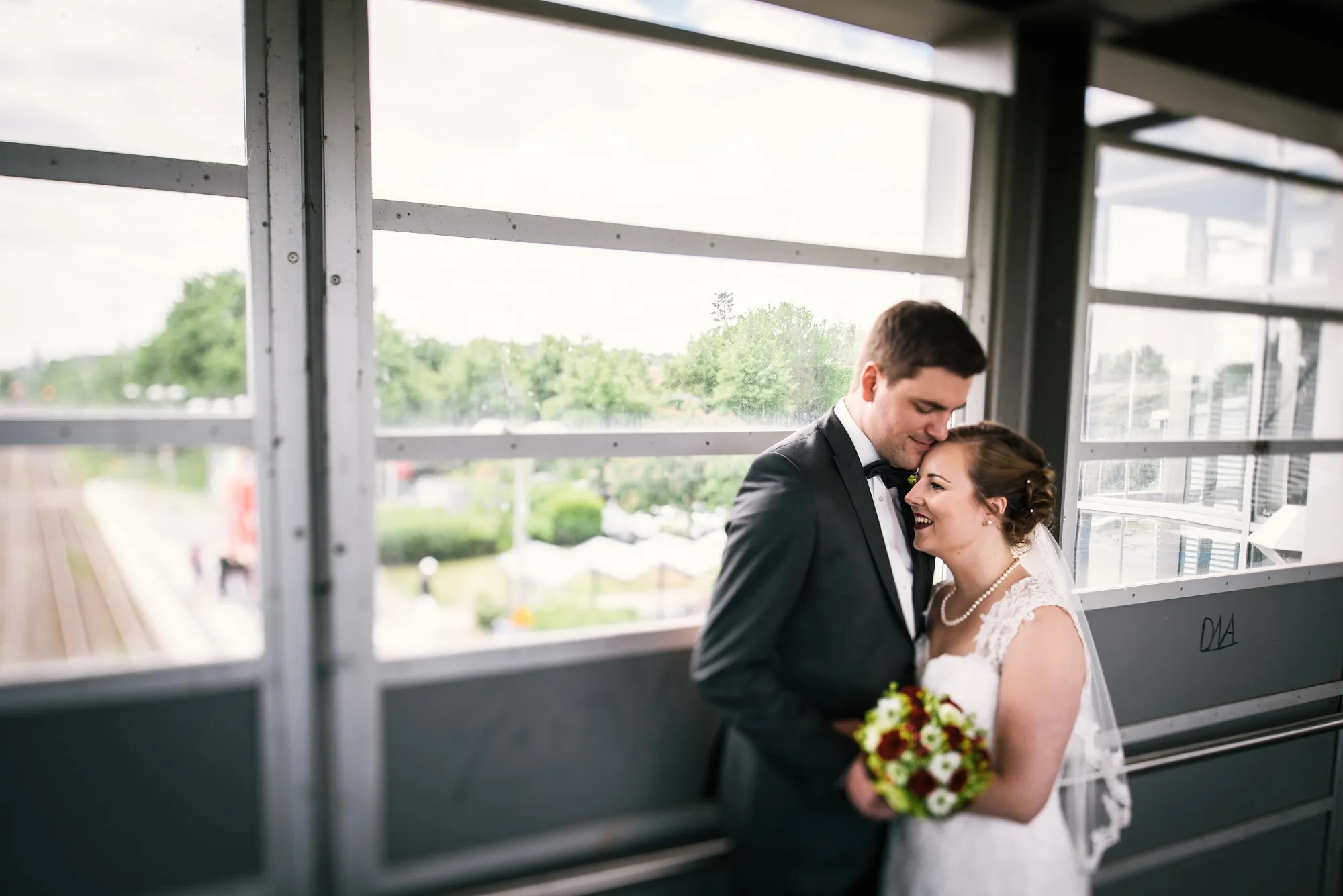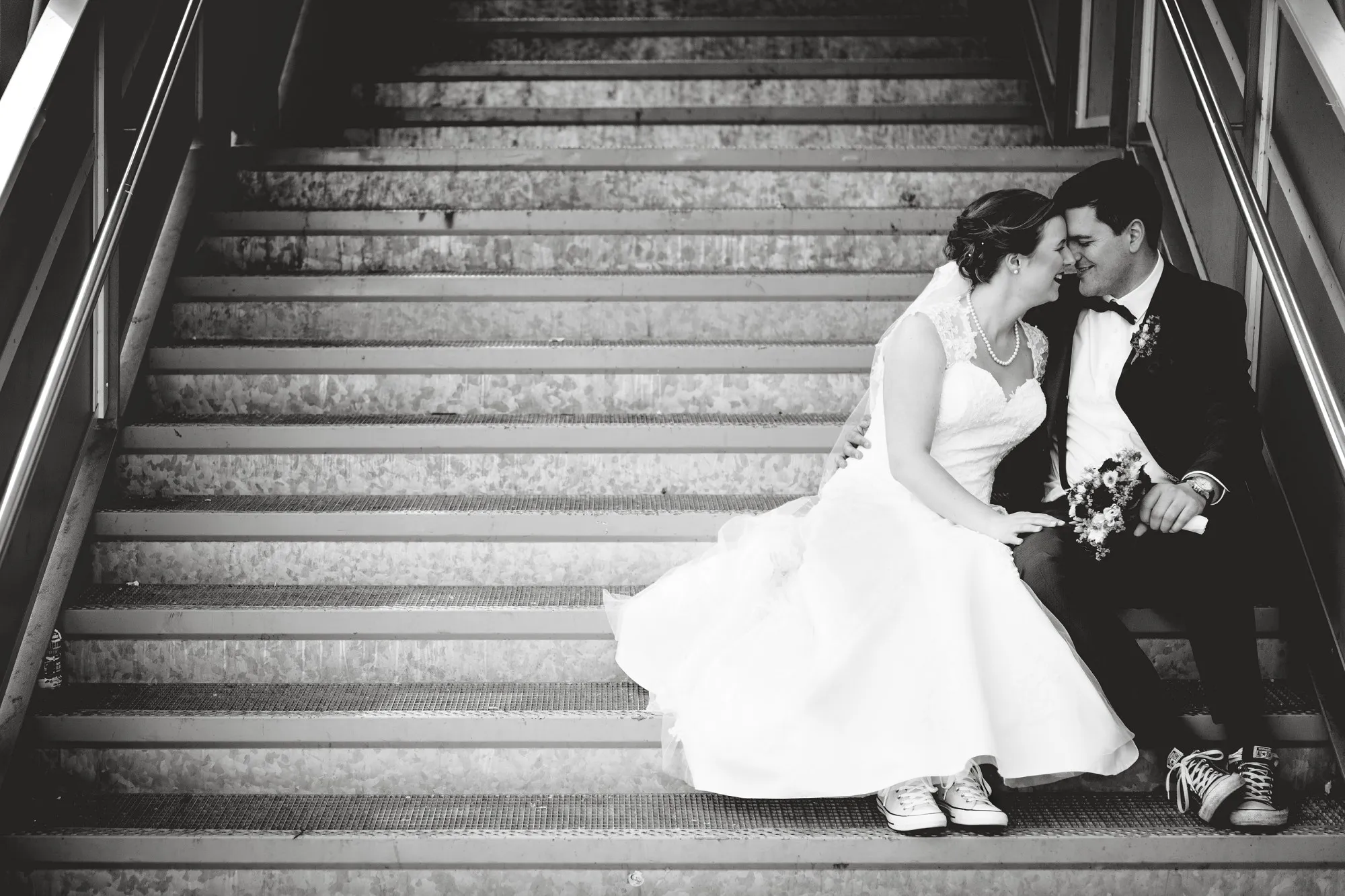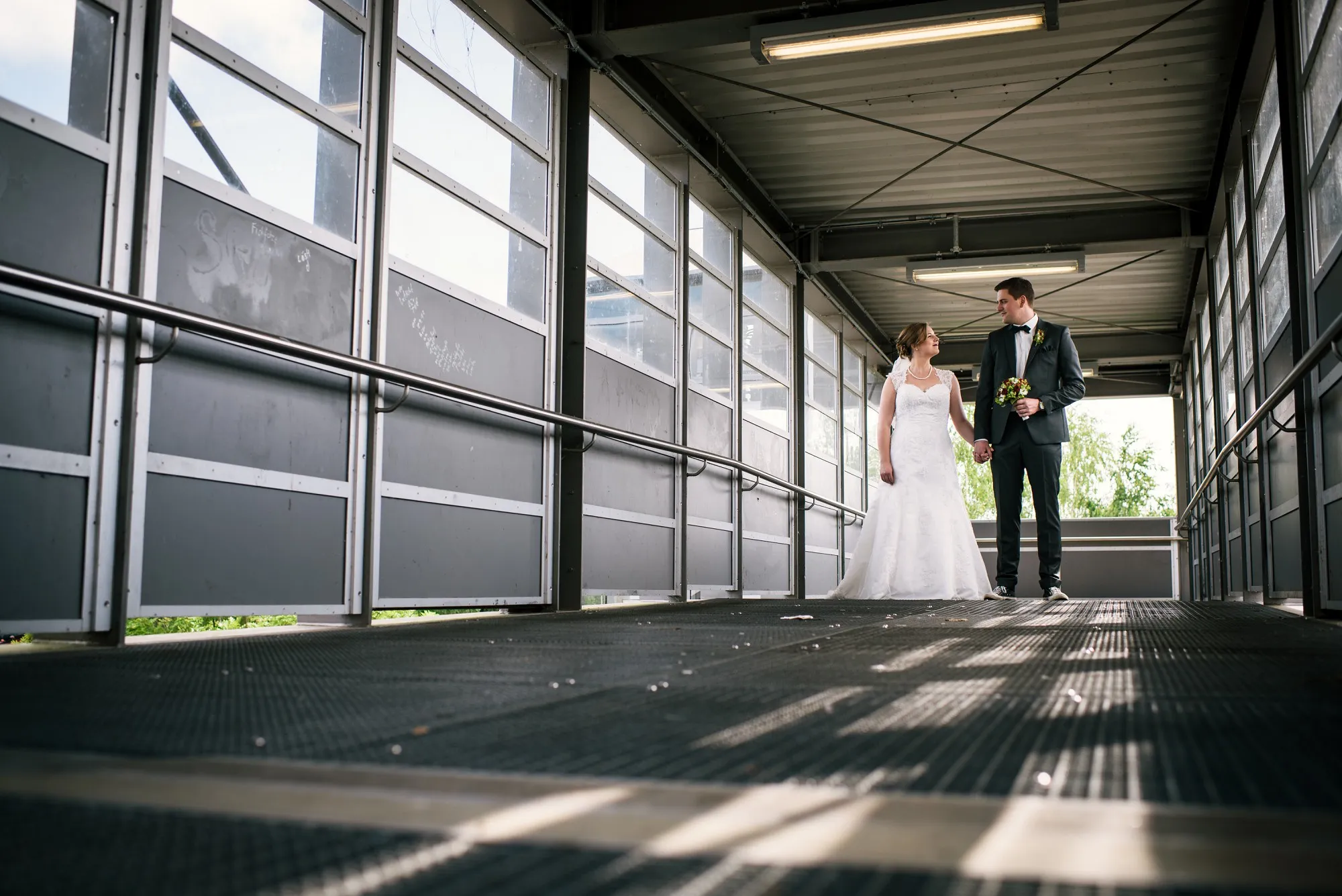 Mein Brautpaar ist damals nach der Schule immer zum „Logo“ Jugendtreff am Ahauser Bahnhof (heute: https://www.copacabana-logo.de/) gegangen um auf den Bus zu warten und dort haben sie sich kennen gelernt. An ihrem Hochzeitstag waren sie genau an diesem Ort zum First Look verabredet. Wunderbare, liebevolle Bilder in einer tollen Location. Sogar den Tisch von damals haben sie wiedergefunden und die runden Fenster sind fürs Logo sehr charakteristisch. Da der Bahnhof so nahe ist, haben wir ihn auch in die Bilder eingebaut. Chucks und diese Metalltreppe mit gelben Streifen. Cool. Und immer wieder haben die Beiden mich als Hochzeitsfotografen vergessen und sich als Paar, wunderbar liebevoll miteinander gezeigt.
