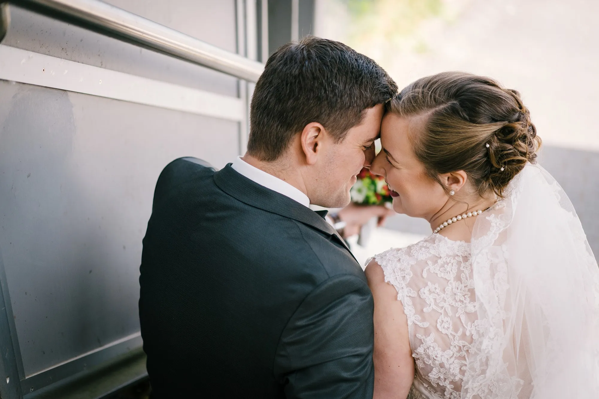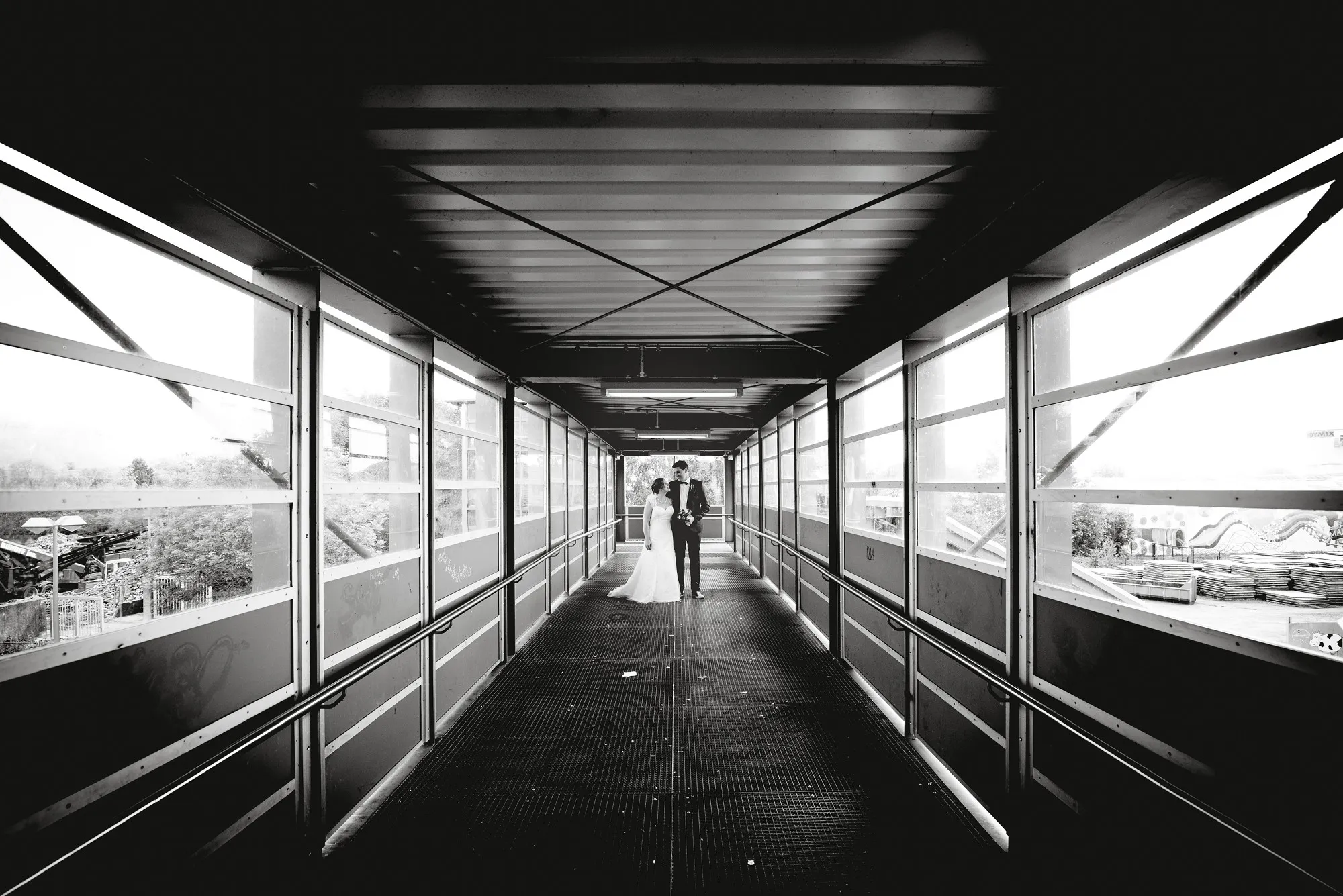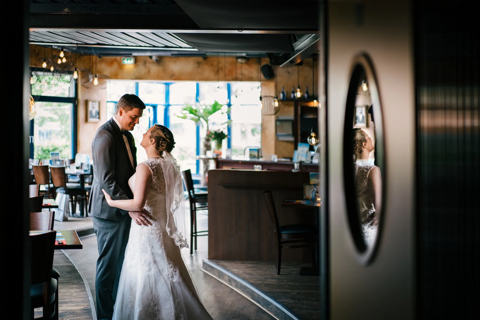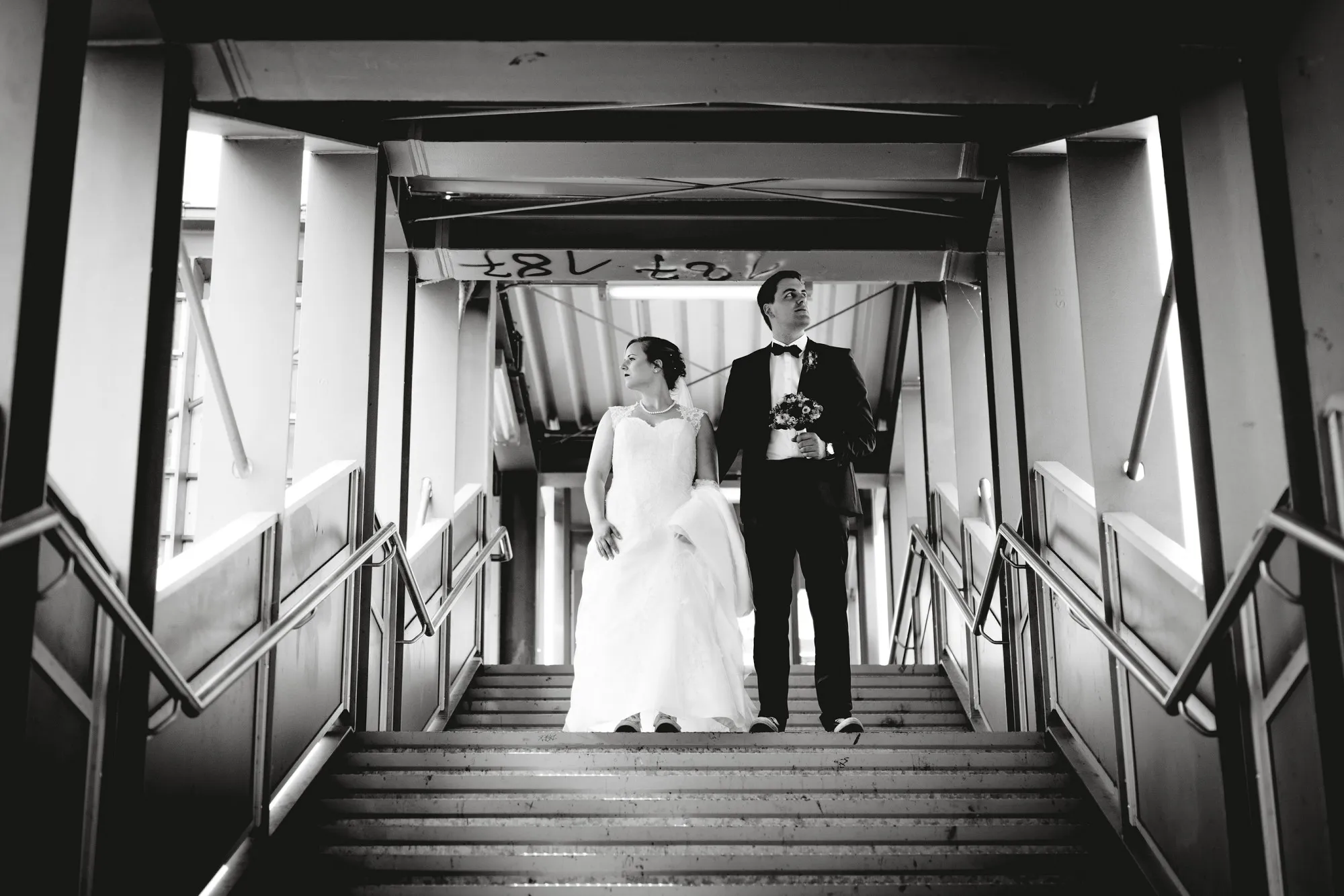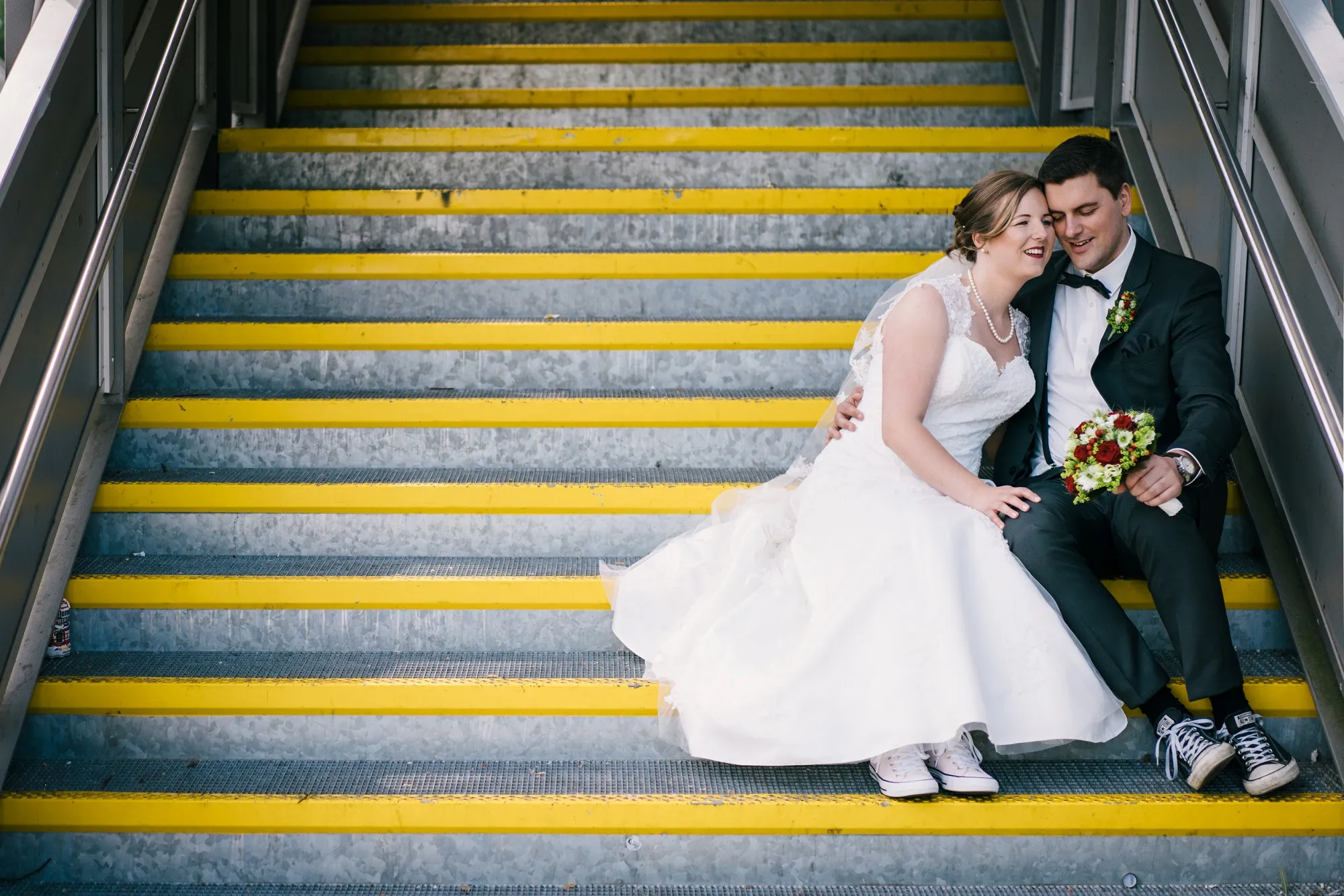 Mein Brautpaar ist damals nach der Schule immer zum „Logo“ Jugendtreff am Ahauser Bahnhof (heute: https://www.copacabana-logo.de/) gegangen um auf den Bus zu warten und dort haben sie sich kennen gelernt. An ihrem Hochzeitstag waren sie genau an diesem Ort zum First Look verabredet. Wunderbare, liebevolle Bilder in einer tollen Location. Sogar den Tisch von damals haben sie wiedergefunden und die runden Fenster sind fürs Logo sehr charakteristisch. Da der Bahnhof so nahe ist, haben wir ihn auch in die Bilder eingebaut. Chucks und diese Metalltreppe mit gelben Streifen. Cool. Und immer wieder haben die Beiden mich als Hochzeitsfotografen vergessen und sich als Paar, wunderbar liebevoll miteinander gezeigt.
