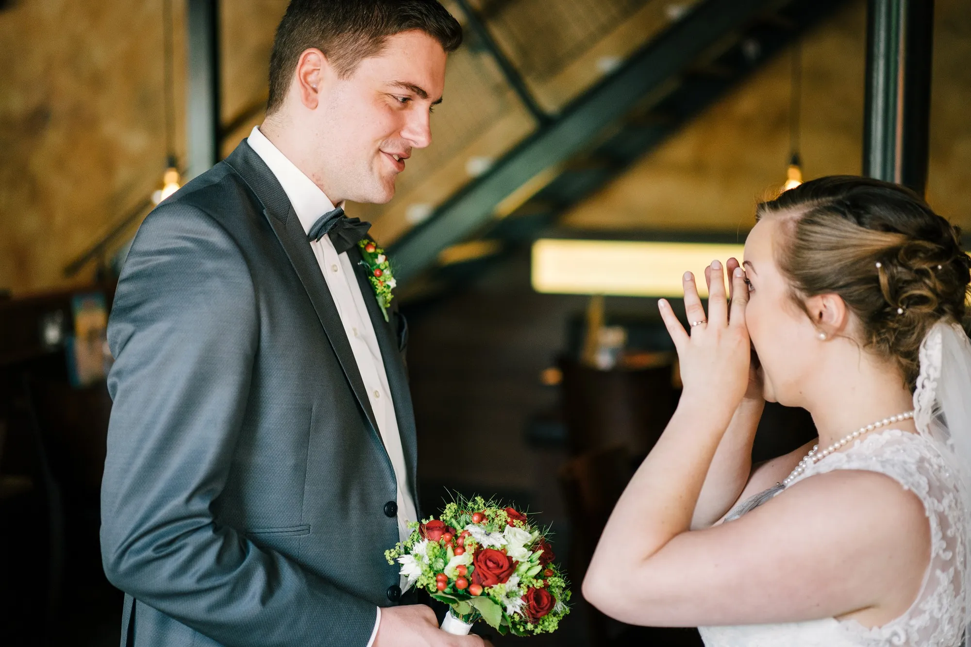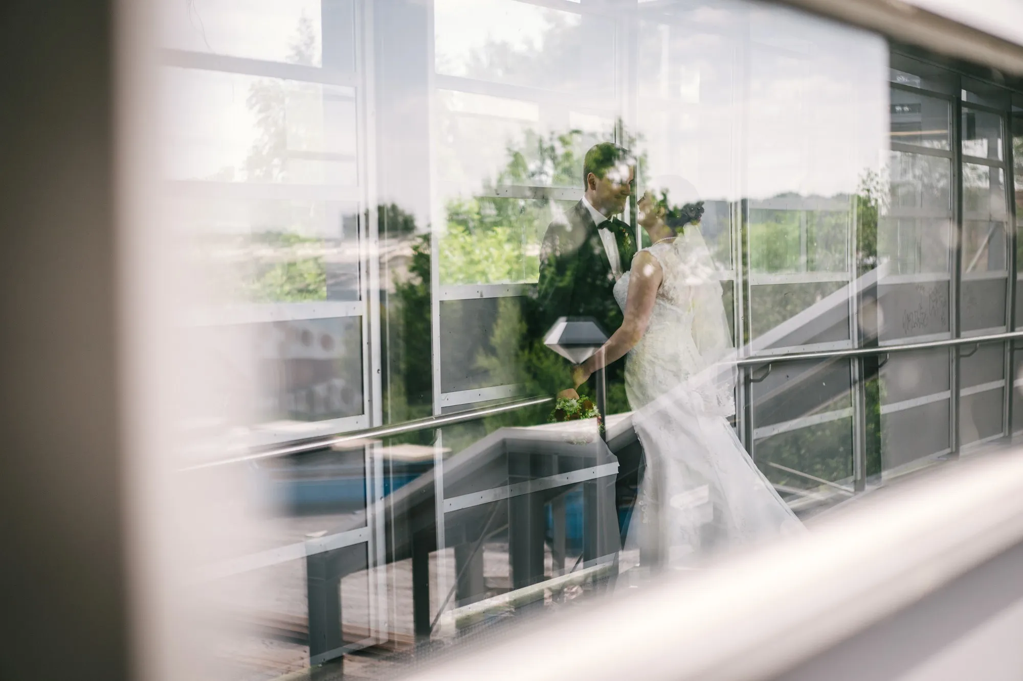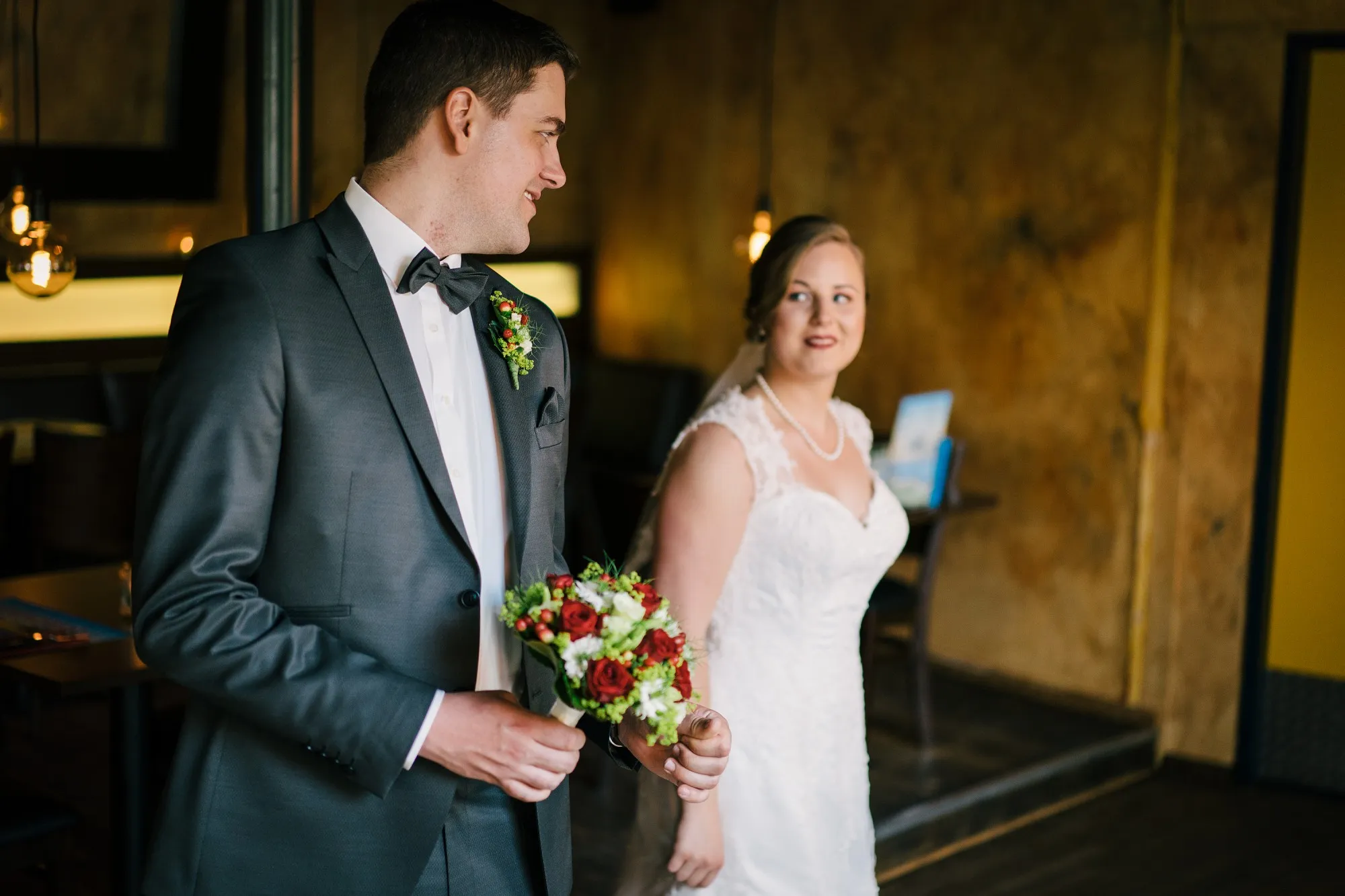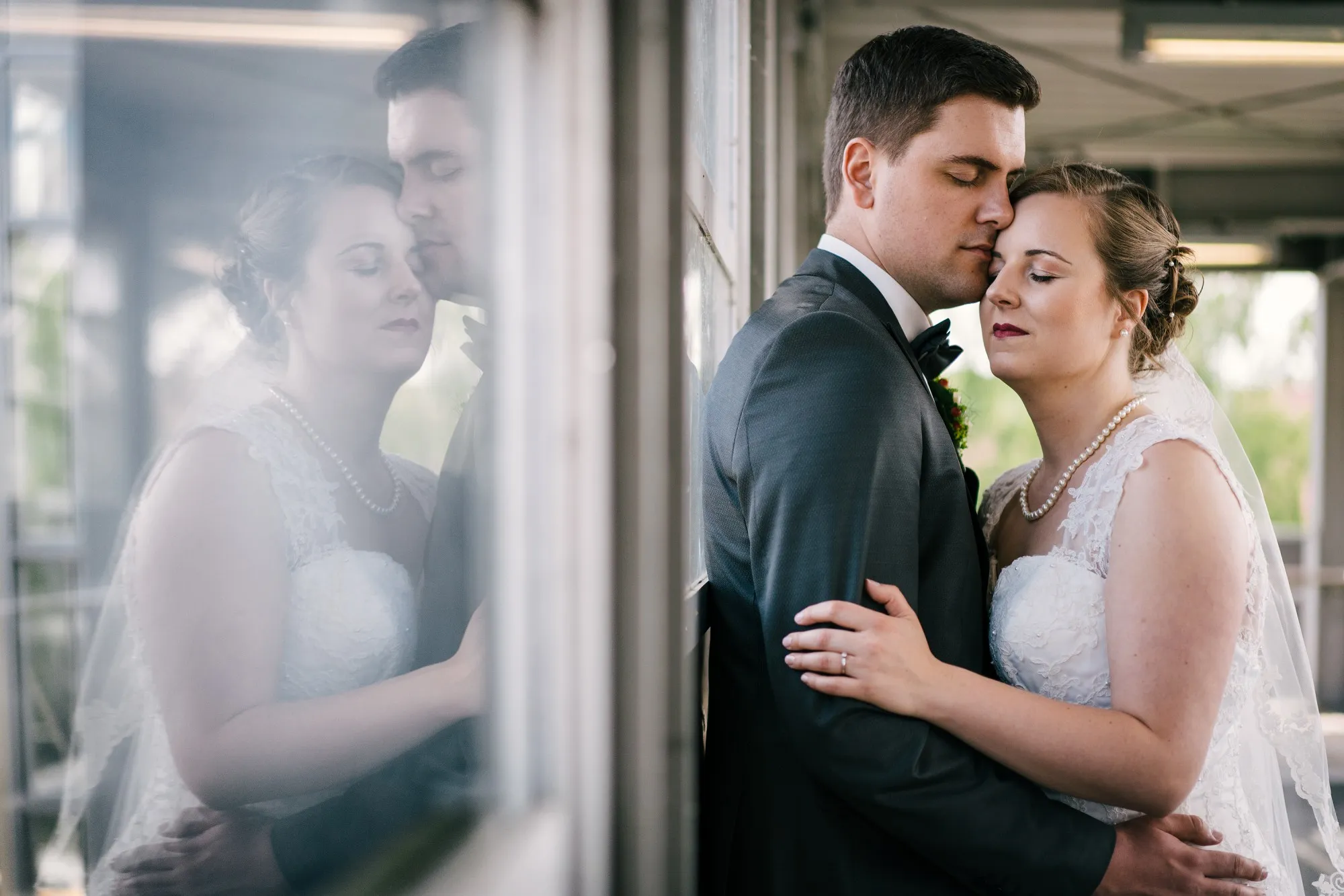 Mein Brautpaar ist damals nach der Schule immer zum „Logo“ Jugendtreff am Ahauser Bahnhof (heute: https://www.copacabana-logo.de/) gegangen um auf den Bus zu warten und dort haben sie sich kennen gelernt. An ihrem Hochzeitstag waren sie genau an diesem Ort zum First Look verabredet. Wunderbare, liebevolle Bilder in einer tollen Location. Sogar den Tisch von damals haben sie wiedergefunden und die runden Fenster sind fürs Logo sehr charakteristisch. Da der Bahnhof so nahe ist, haben wir ihn auch in die Bilder eingebaut. Chucks und diese Metalltreppe mit gelben Streifen. Cool. Und immer wieder haben die Beiden mich als Hochzeitsfotografen vergessen und sich als Paar, wunderbar liebevoll miteinander gezeigt.