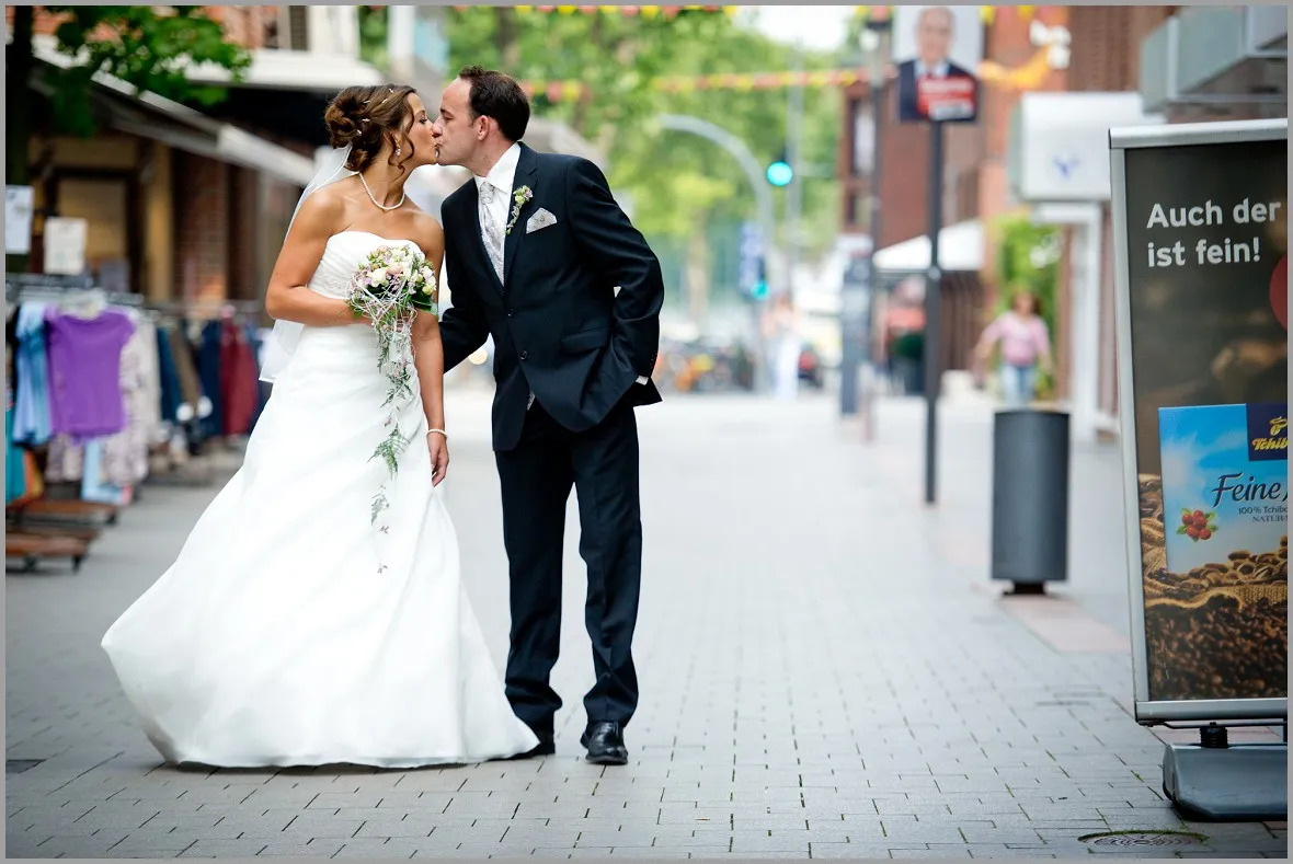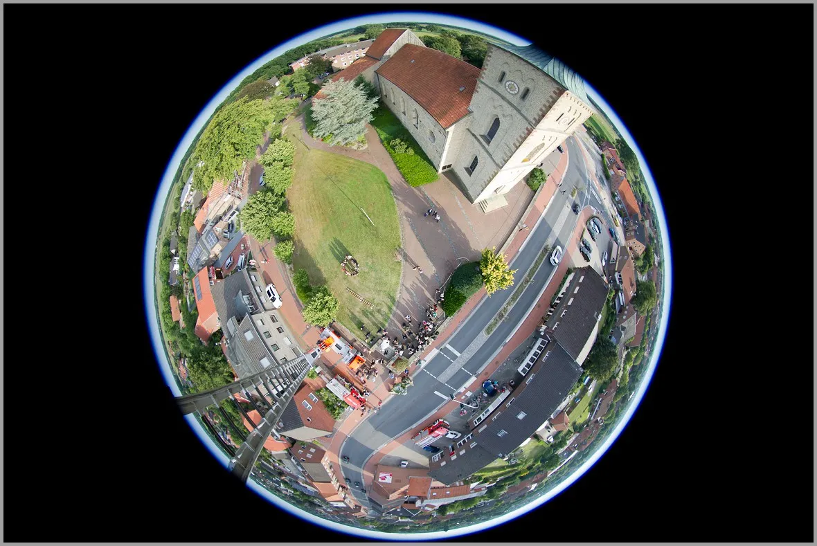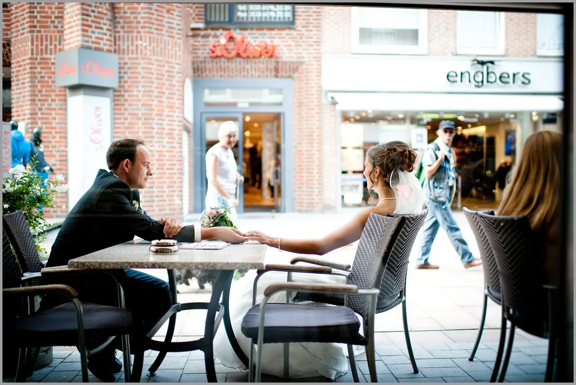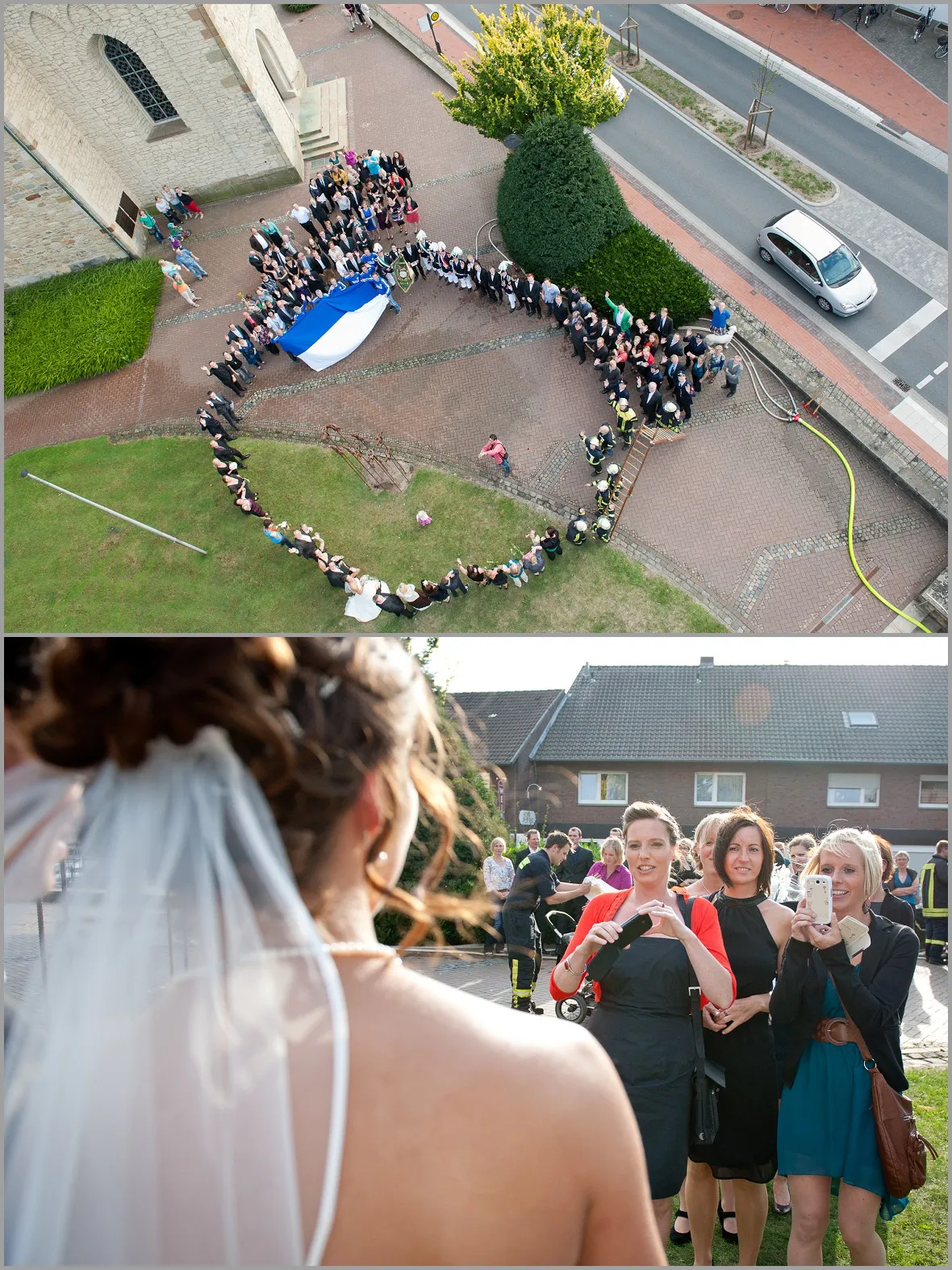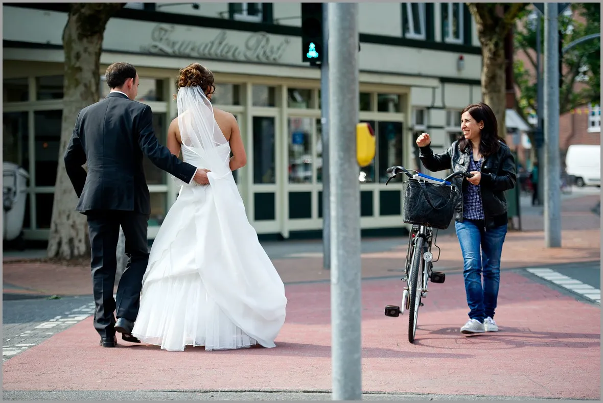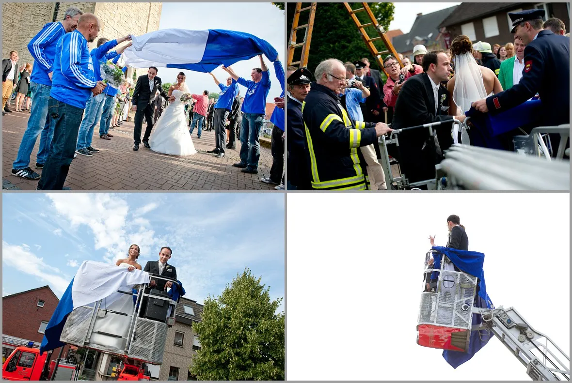 Street-Hochzeitsfotografie! Ja, das beschreibt es am Besten, was mein Brautpaar und ich in Ahaus gemacht haben. Ja genau. Wir waren in der Ahauser Innenstadt unterwegs um Hochzeitsbilder zu machen. Mitten in diesem hektischen Alltag, mein Brautpaar. Irgendwie ein schöner Kontrast. Wenn ich daran denke, wie die Passanten auf uns reagierten, bekomme ich ein Lachen auf mein Gesicht gezaubert. Und dann kam das „Ganz Große KINO“ nur für uns! Geil. Das war noch nicht alles… Einmal die „Ganze Welt“ fotografieren, in einem einzigen Bild, das hatte ich schon immer mal vor. Jetzt hatte ich die Gelegenheit dazu! 40m Feuerwehrleiter! Und ich stellte fest, Höhenangst? Was ist das? Hab ich nicht. Auf dem Fest sah ich gute Bekannte von andern Hochzeiten wieder. Fühlte sich an wie ein tolles Klassentreffen. O-Ton vom Bräutigam über mich: „Guck mal, der liegt ja schon wieder auf dem Boden“ Ja, so muss das 😉 Yep. Mein Brautpaar, ich sage: Danke, für diesen schönen Tag!
