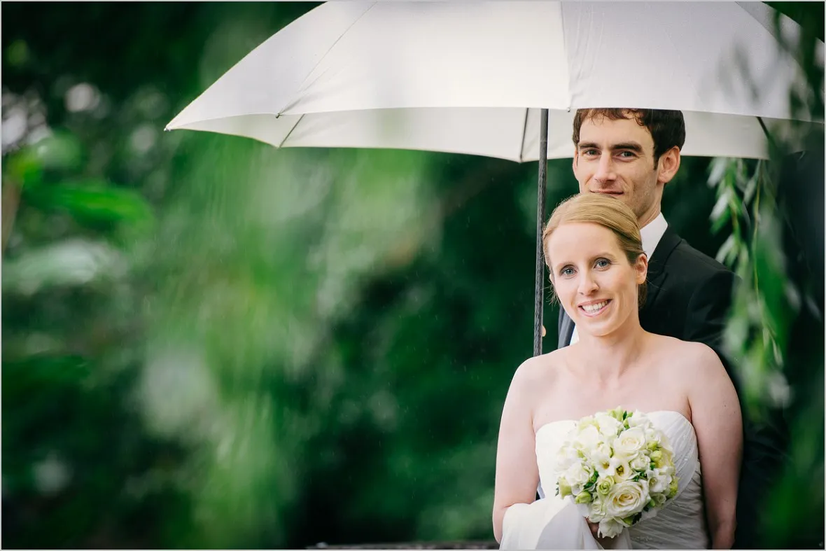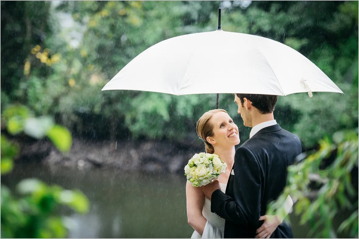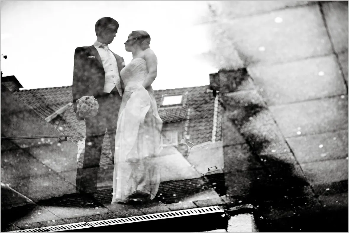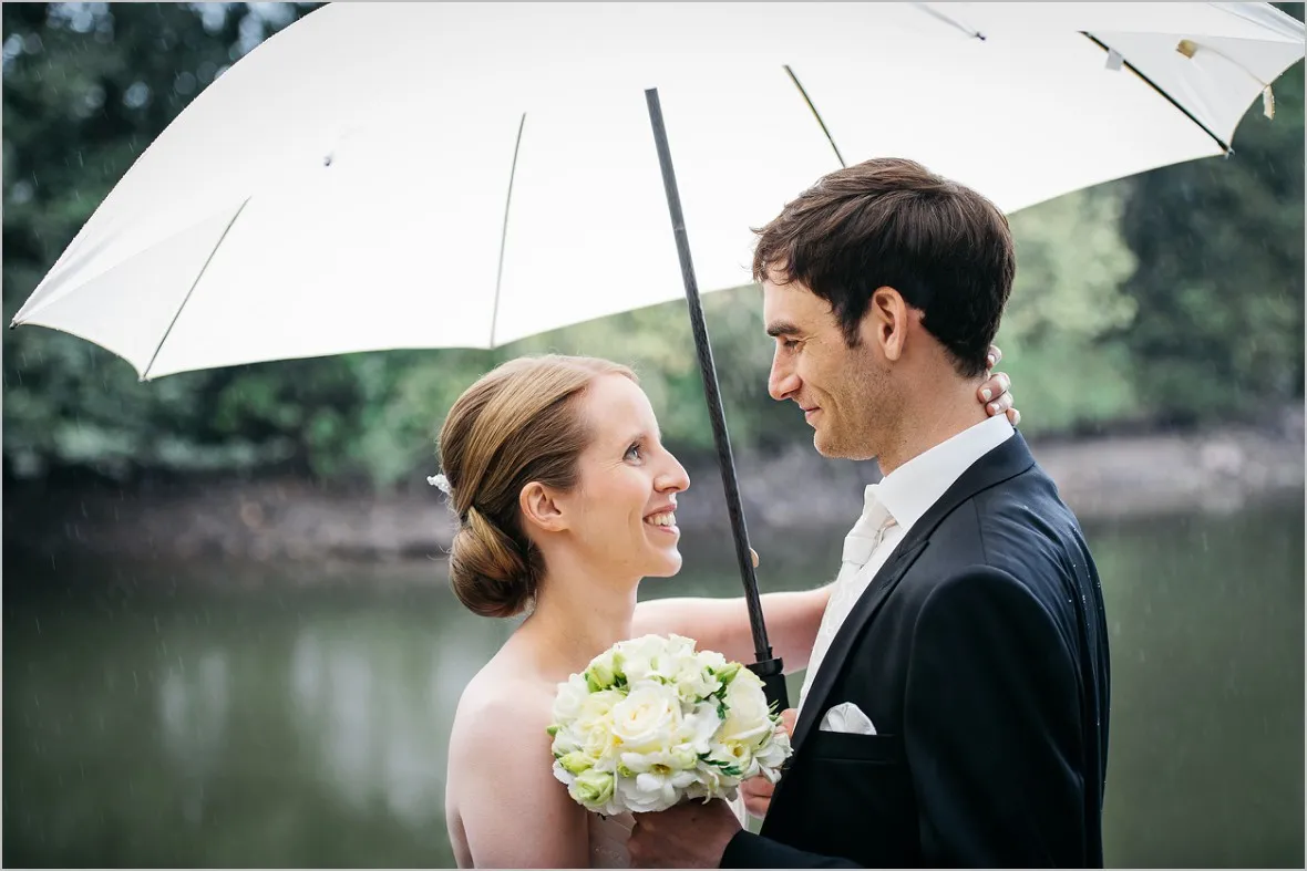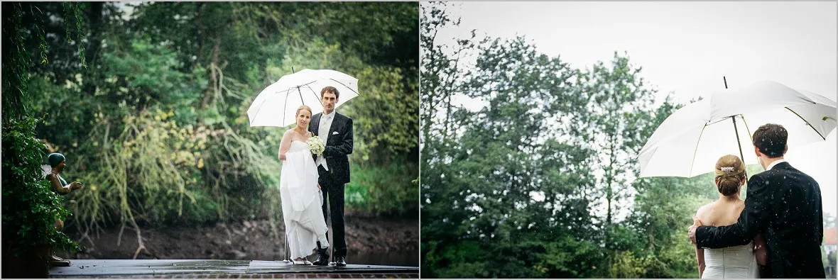 Ja, ich sollte das Wetter mal kennen lernen. Bei kaltem Schrägregen entstanden unterm Regenschirm wundervoll enge, vertraute Bilder. Einfach toll, wie mein grandioses Brautpaar alles um sich herum vergessen hat und nur noch sich fühlte.