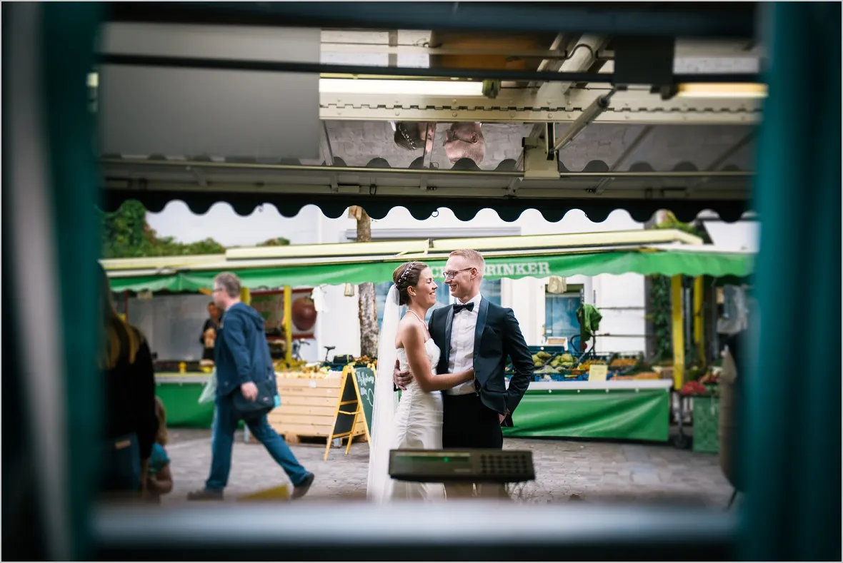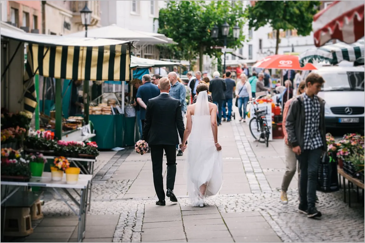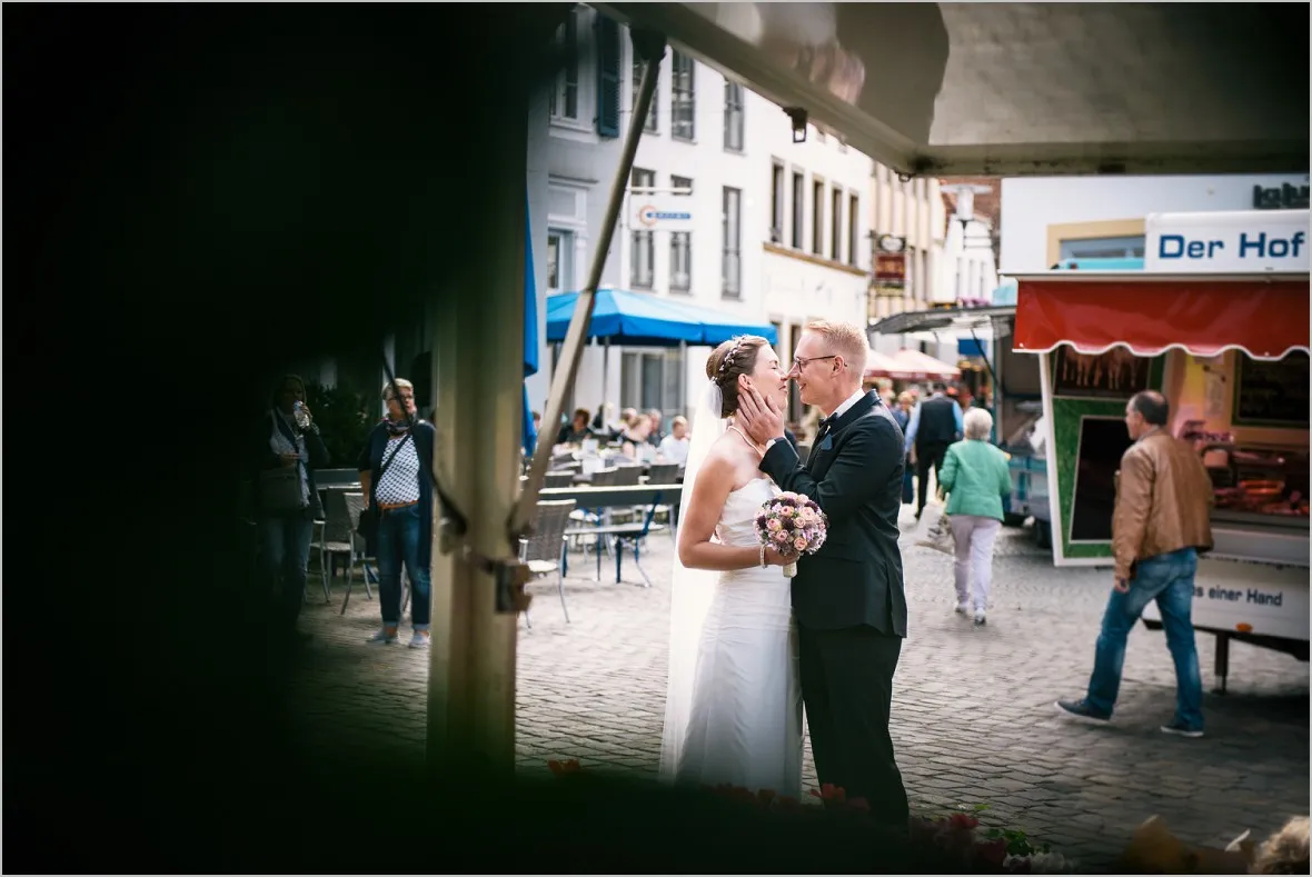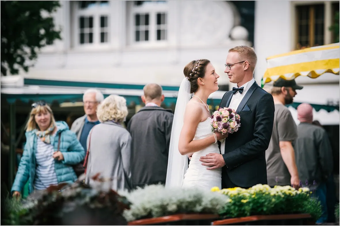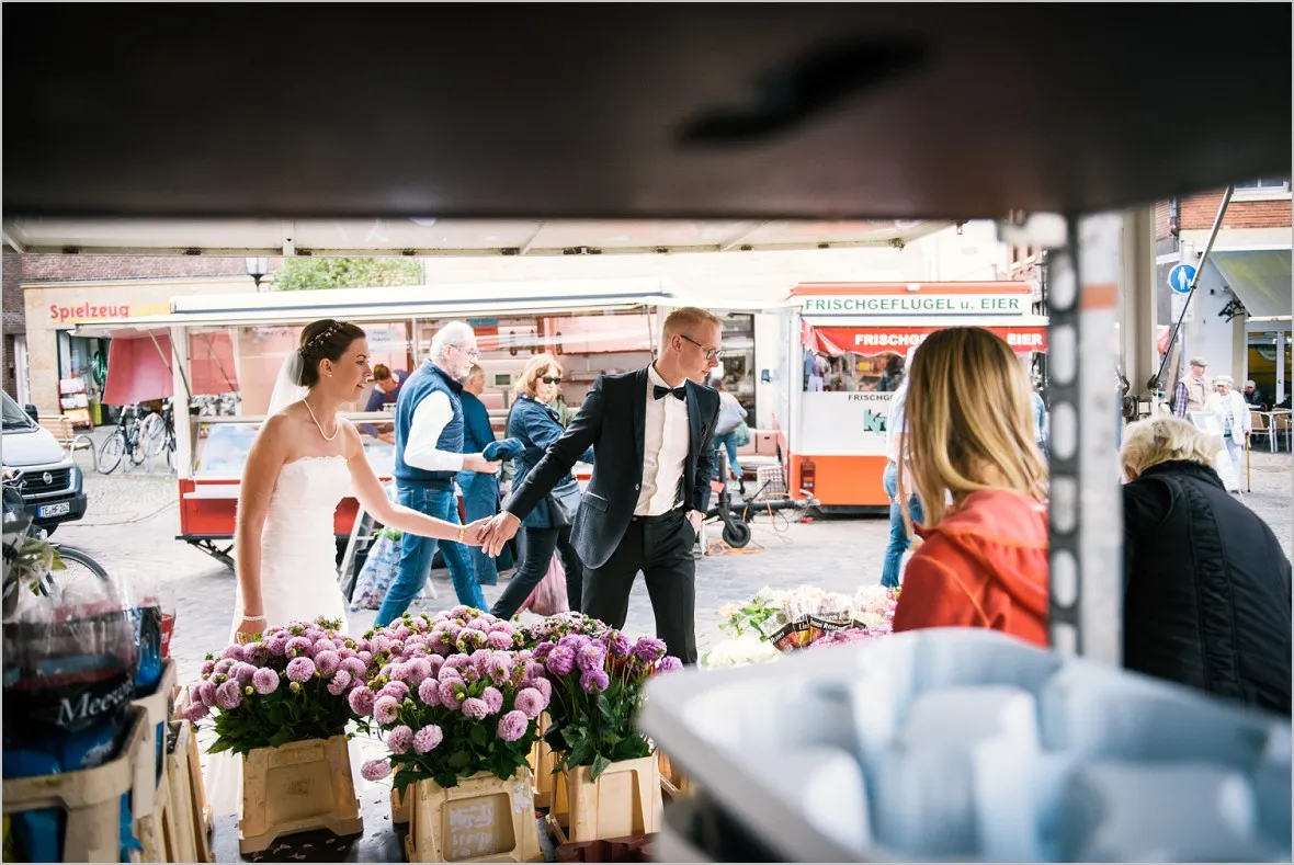 Beim Vortreffen sagte mein Brautpaar, sie wollen zum Wochenmarkt in Rheine an ihrem Hochzeitstag um Bilder zu machen. Sie verbinden was aus ihrem Leben mit dem Markt und wollten meine Meinung zu der Idee hören. Ich war begeistert! Reportagefotografie mit einem wunderbaren Brautpaar auf dem Markt. Das ist mutig, fürs Paar und auch für mich. Unvorhersehbar zauberhaft, echt und schön!