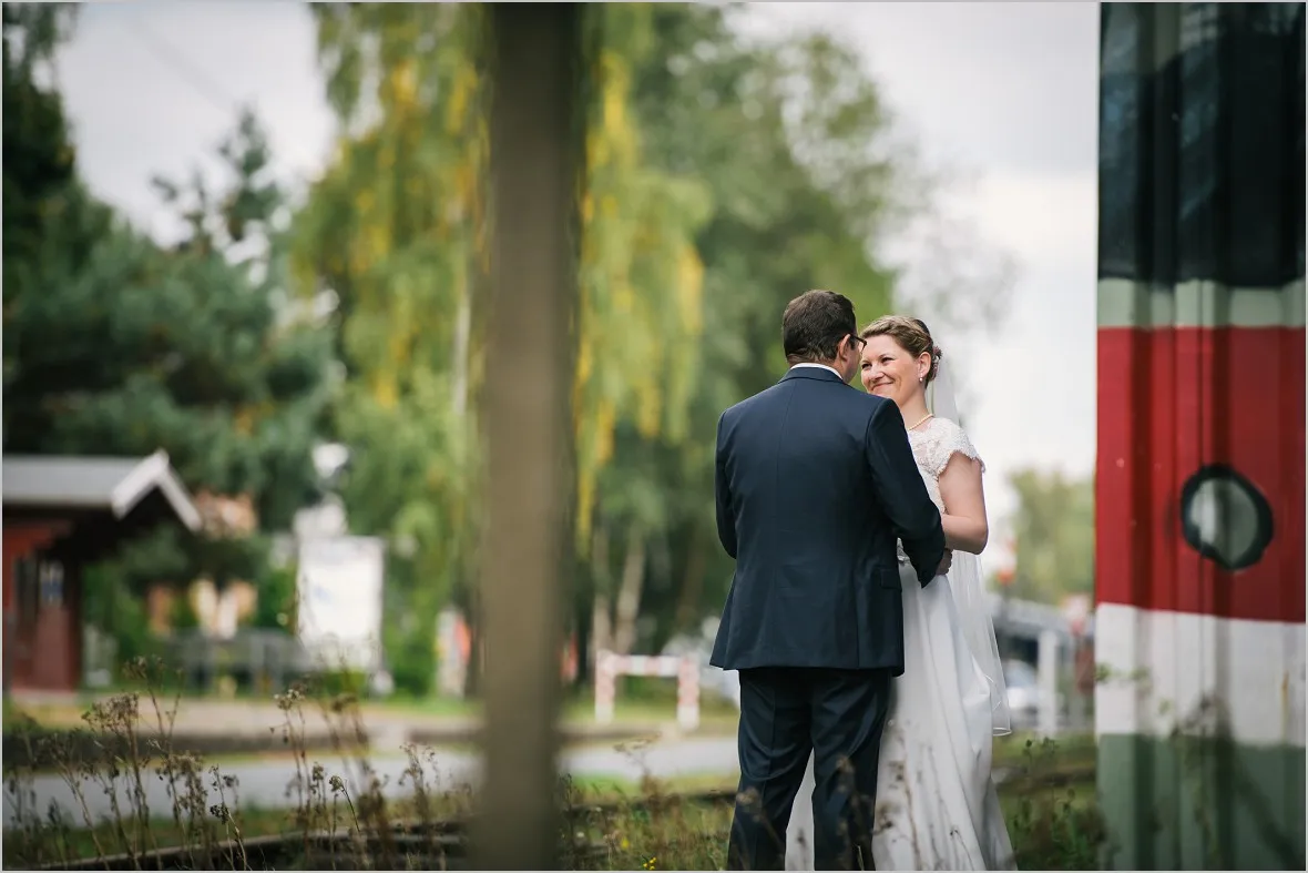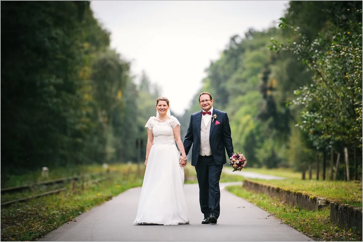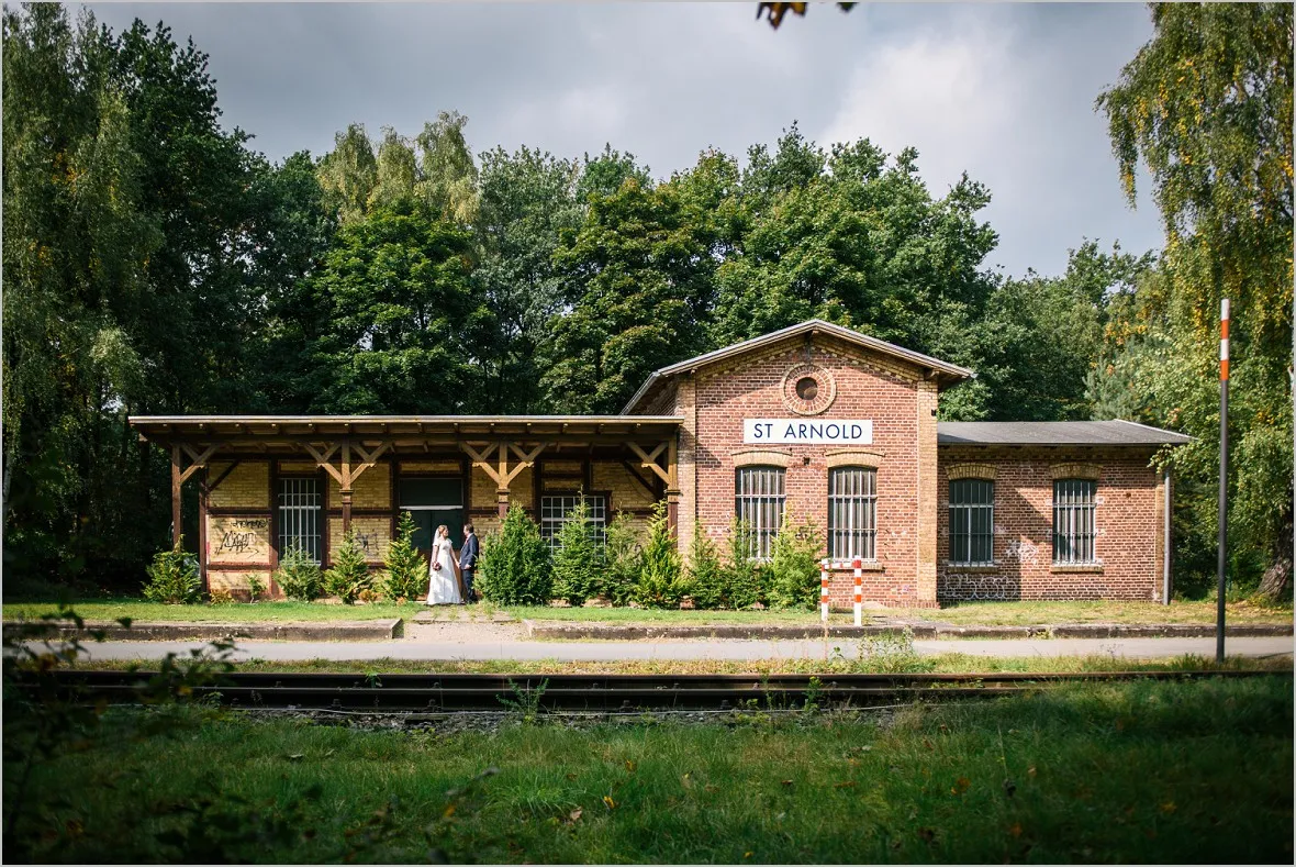 Eine Fahrradtourtruppe begrüßte uns beim St. Arnolder Bahnhof. Ja, der Brautwaagen zog schon so seine Aufmerksamkeit auf sich. Dass sollte ich später auf einer anderen Hochzeit mehrmals erzählt bekommen. ???? Mein Brautpaar aus Frankfurt an einen so kleinen Bahnhof. Das hat was mit eigenen Wurzeln und Verbundenheit zu tun. Paarbilder mit ganz viel Emotionen und wilden Erdbeeren entstanden.