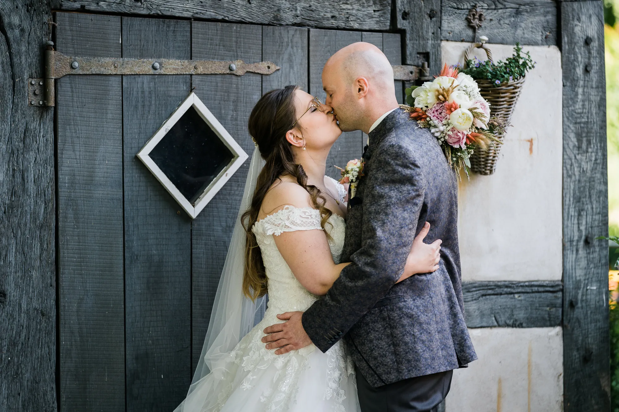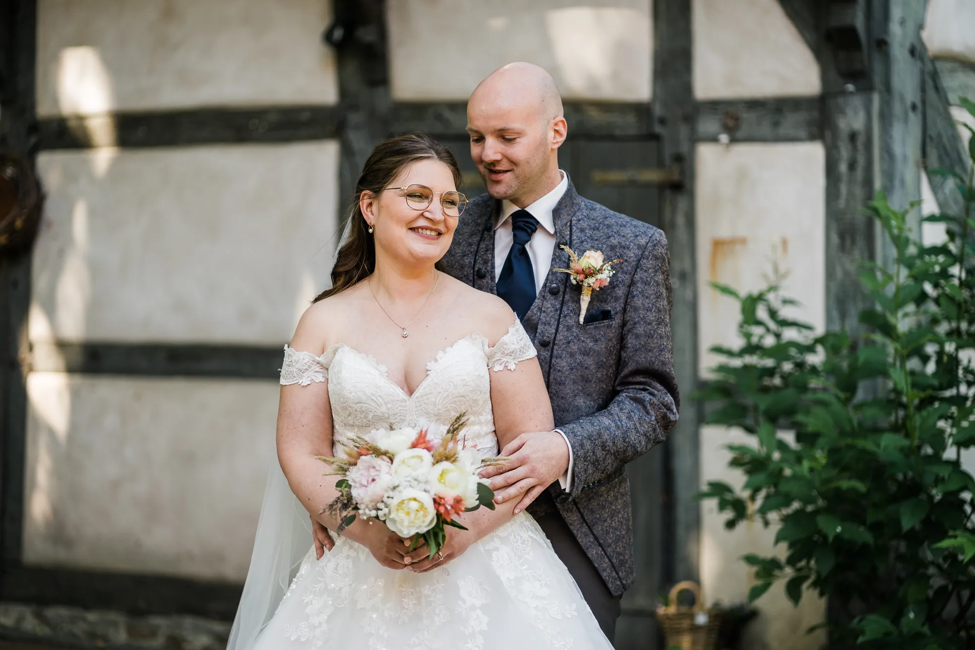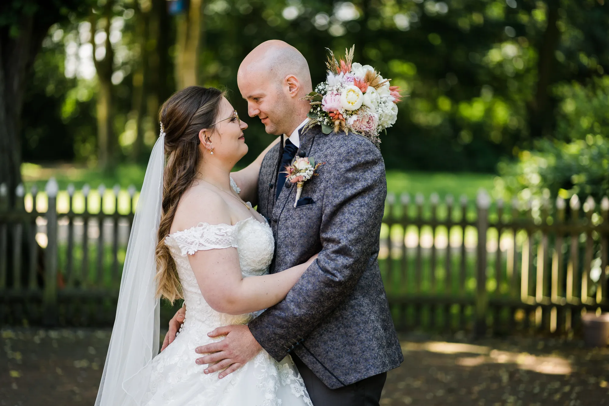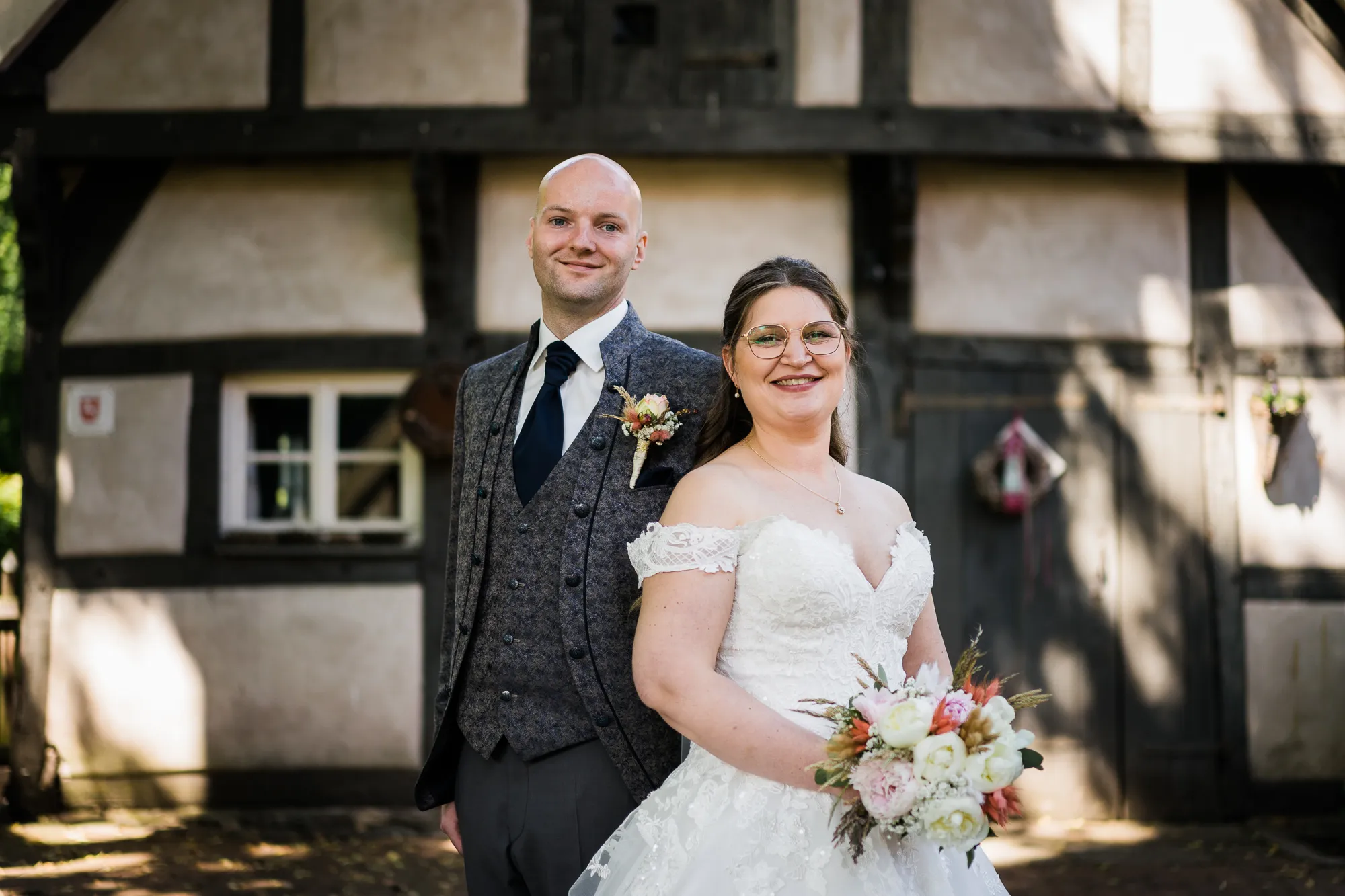 Nach dem Ersten Sehen zu Hause unterm Hochzeitsbogen fuhren wir zum Bürgerpark in Schapen. Das ist ein Park mit alten Fachwerkhäusern, altem Pfarrhaus und einem Backhaus. Hier haben sie auch standesamtlich geheiratet und einen Pflasterstein mit Namen und Datum dort verewigt. Grund genug auch hier die Paarbilder der kirchlichen Hochzeit zu machen. Wunderbare Hochzeitspaarbilder entstanden.