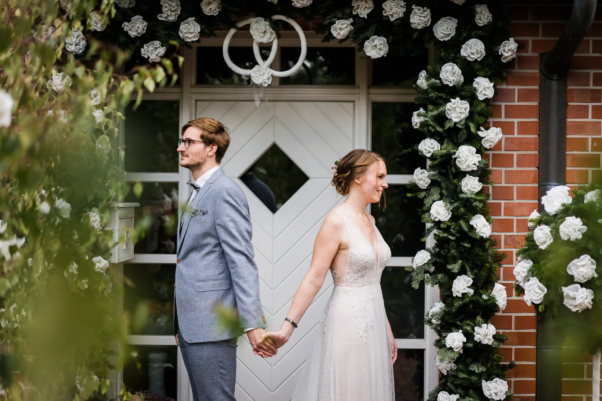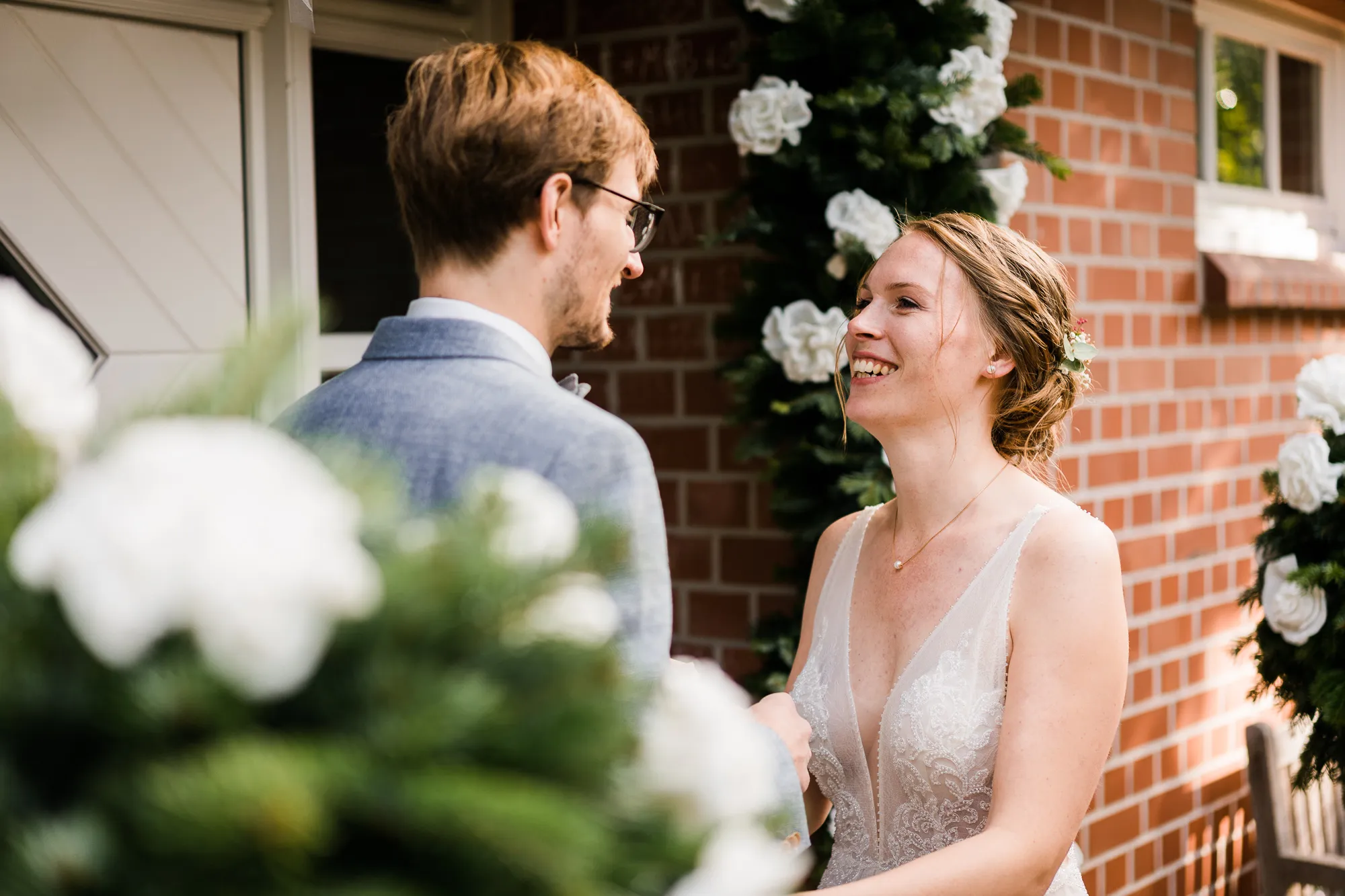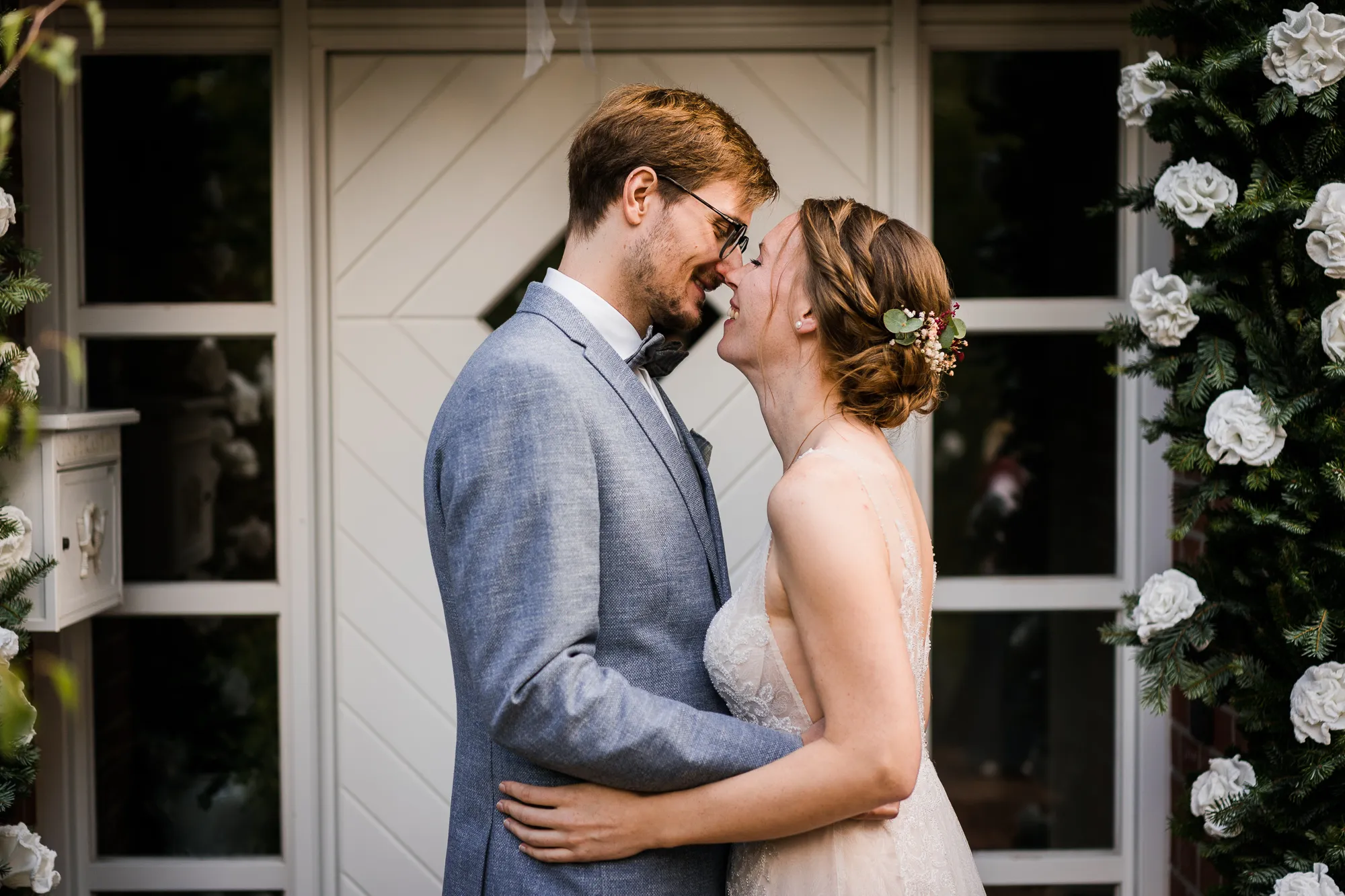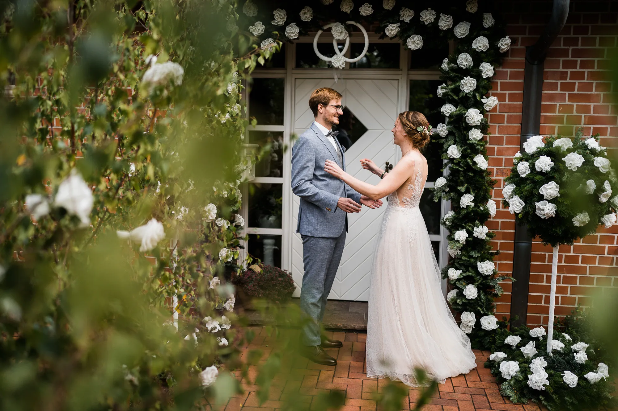 Doch es kam alles ganz anders und viel, viel besser. Es wurde nämlich von dem Brautpaar und mir nicht das Schloss als Location für Hochzeitsbilder ausgewählt, sondern das Elternhaus des Bräutigams. Warum? Darum: Der Bräutigam ist in diesem Haus groß geworden. Er hat dort viele Momente erlebt, geweint, gelacht und sicherlich auch seine zukünftige Braut irgendwann dort vorgestellt. Es ist also seine Heimat, deren Zuhause und Umfeld. Sie sind da sicherlich oft ein und ausgegangen. Darum war dieser Ort besser als das ihnen eigentlich fremde Schloss. Das Elternhaus hat ein schnuckeliges blaues Holzgartentor, viele Bäume und die kleine verträumte alte Schoppe. Nicht zu vergessen, und typisch münsterländisch, der durch die Nachbarn mit einem Hochzeitsbogen geschmückte Hauseingang.