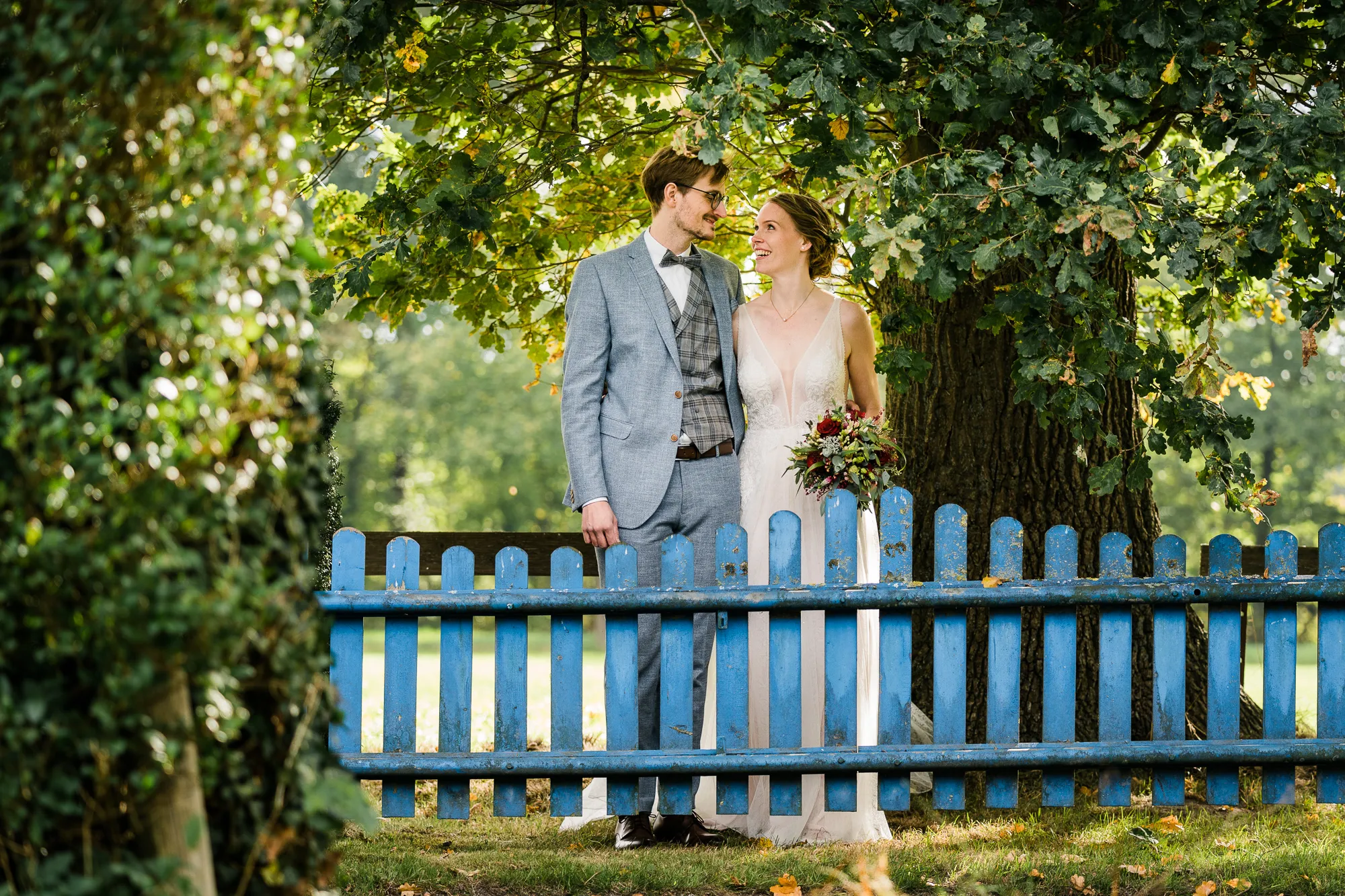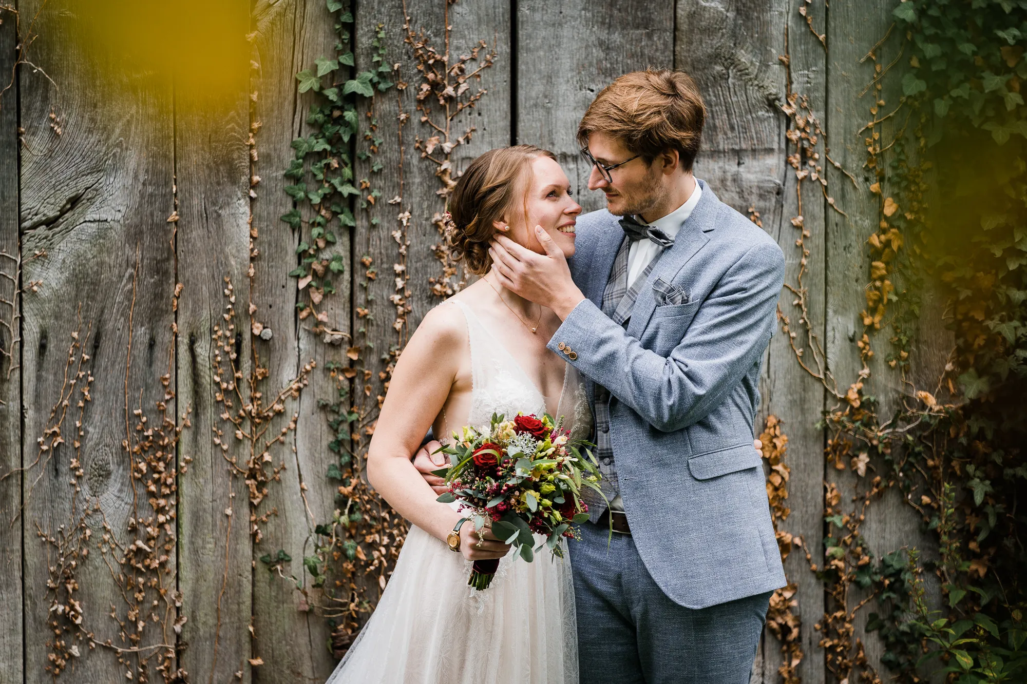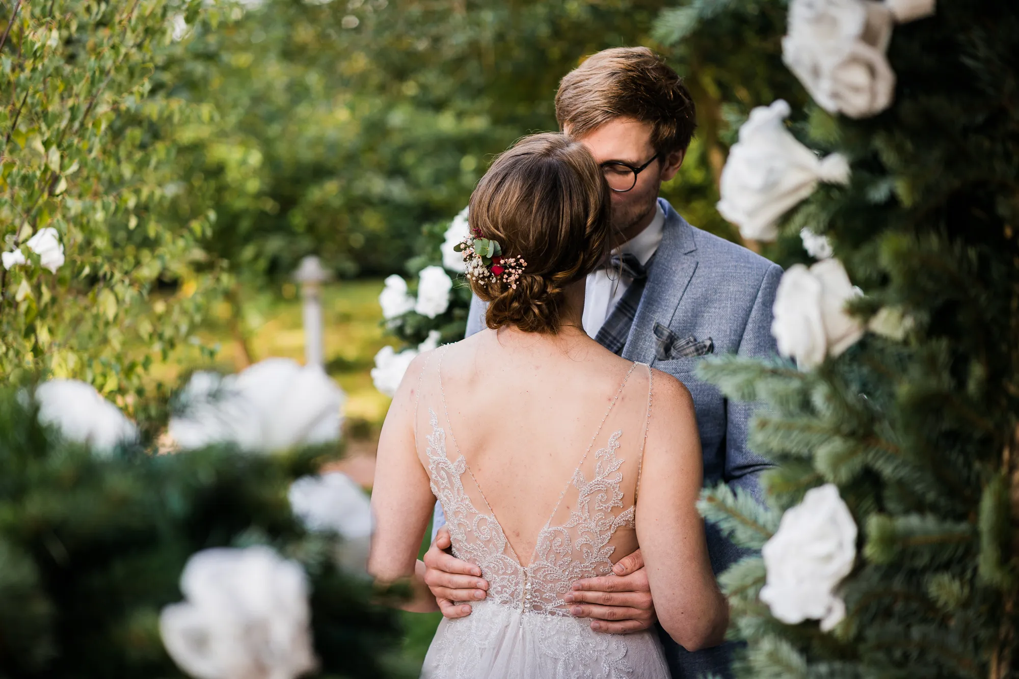 Doch es kam alles ganz anders und viel, viel besser. Es wurde nämlich von dem Brautpaar und mir nicht das Schloss als Location für Hochzeitsbilder ausgewählt, sondern das Elternhaus des Bräutigams. Warum? Darum: Der Bräutigam ist in diesem Haus groß geworden. Er hat dort viele Momente erlebt, geweint, gelacht und sicherlich auch seine zukünftige Braut irgendwann dort vorgestellt. Es ist also seine Heimat, deren Zuhause und Umfeld. Sie sind da sicherlich oft ein und ausgegangen. Darum war dieser Ort besser als das ihnen eigentlich fremde Schloss. Das Elternhaus hat ein schnuckeliges blaues Holzgartentor, viele Bäume und die kleine verträumte alte Schoppe. Nicht zu vergessen, und typisch münsterländisch, der durch die Nachbarn mit einem Hochzeitsbogen geschmückte Hauseingang.