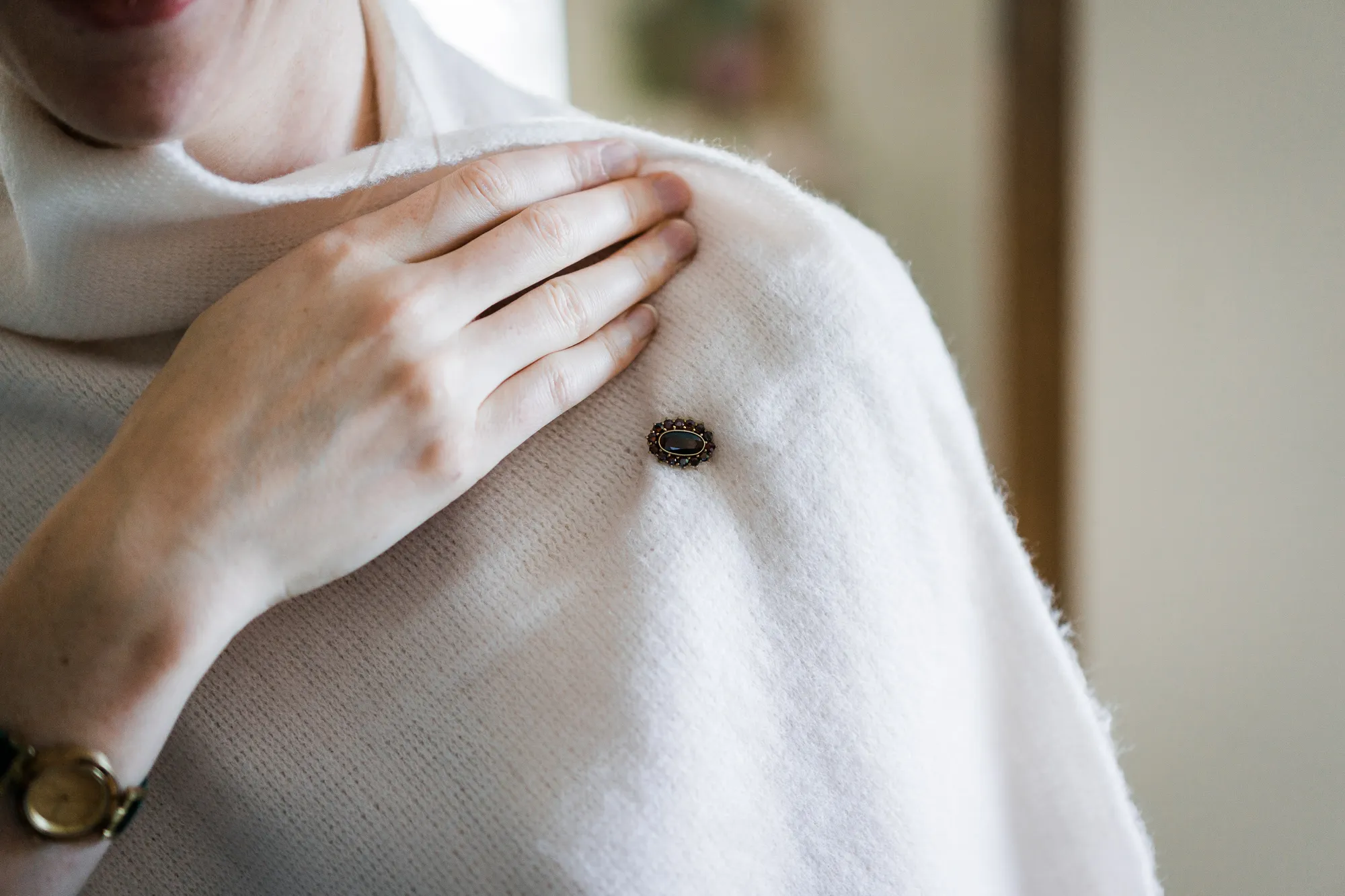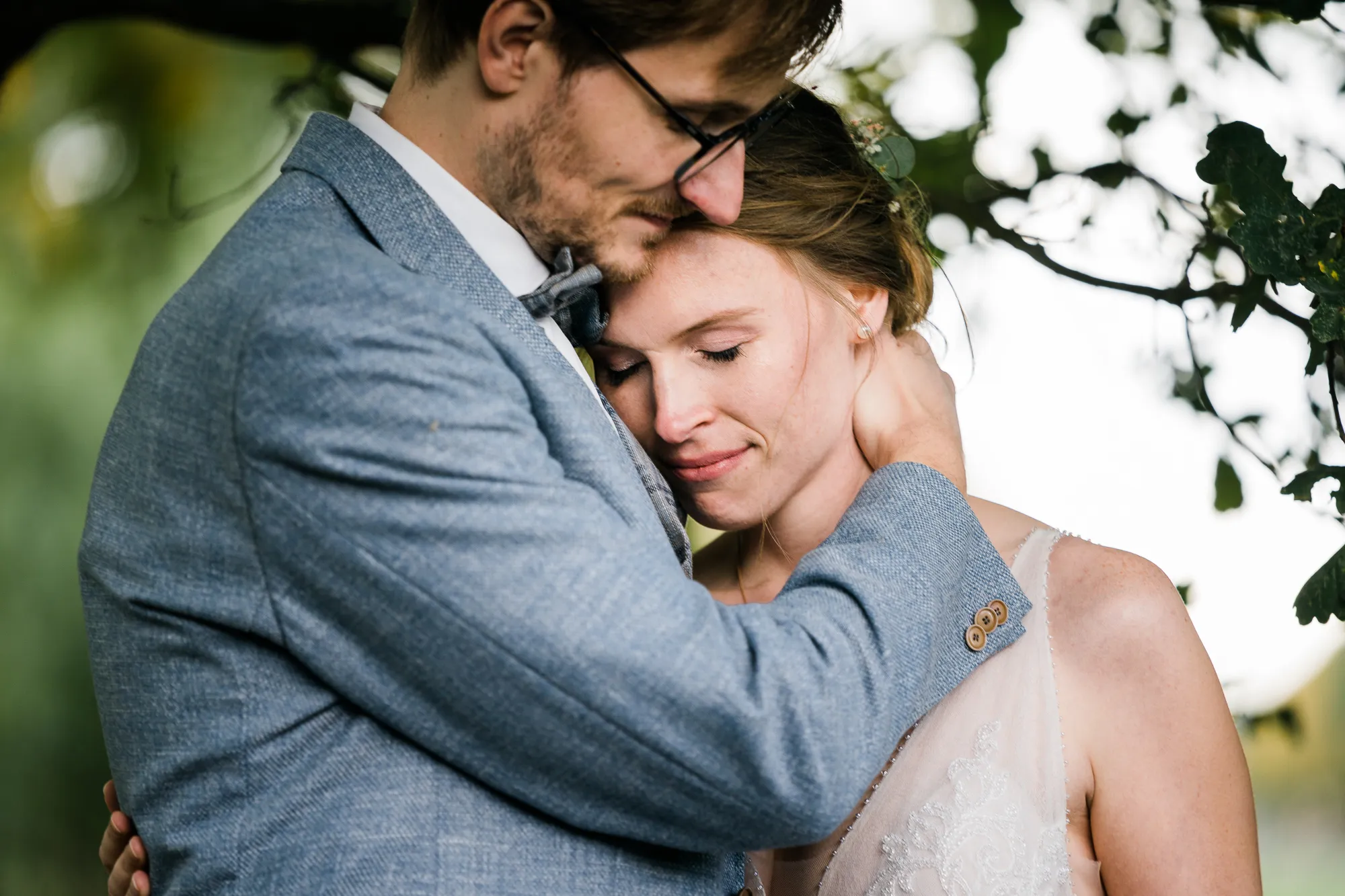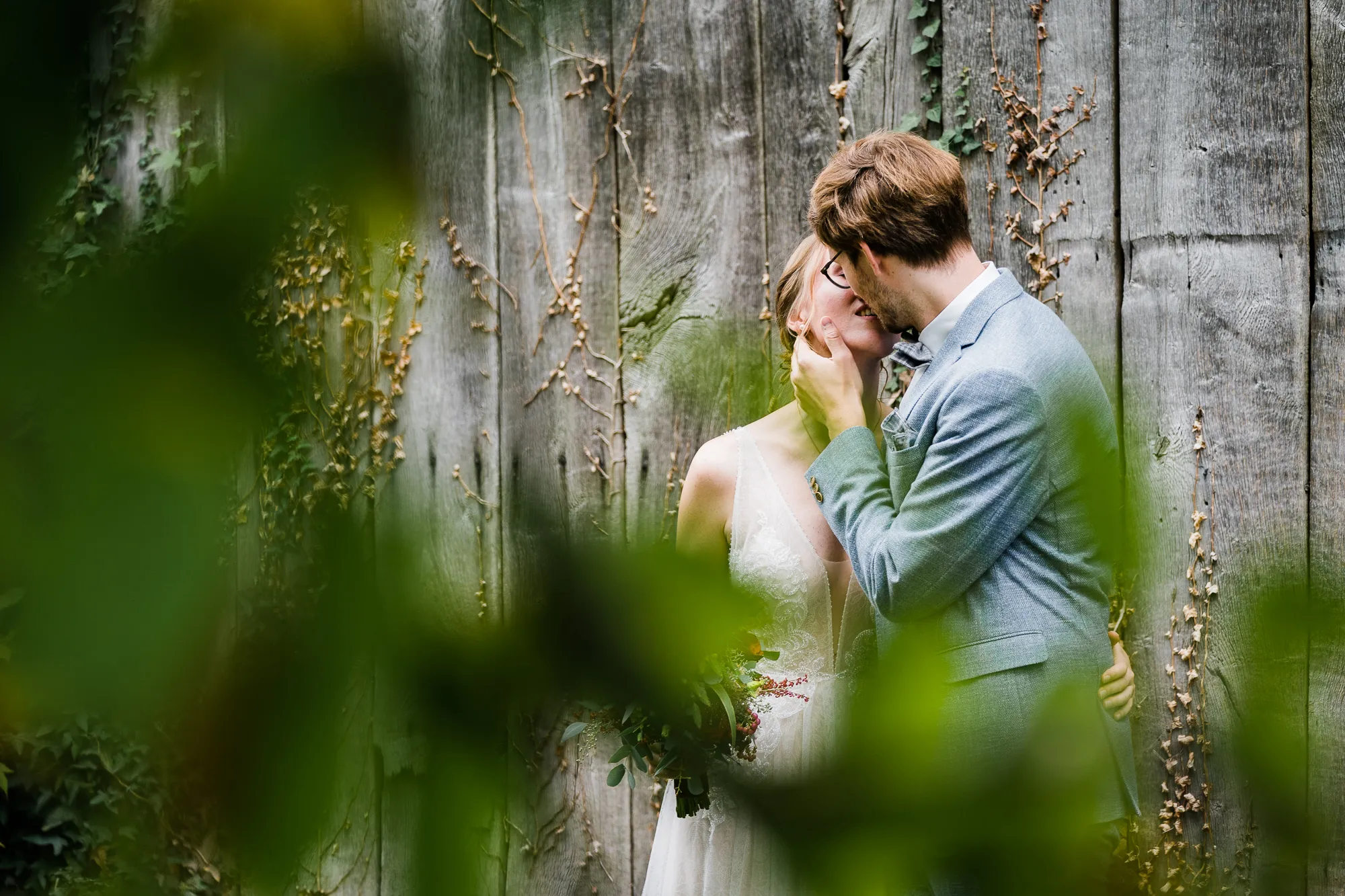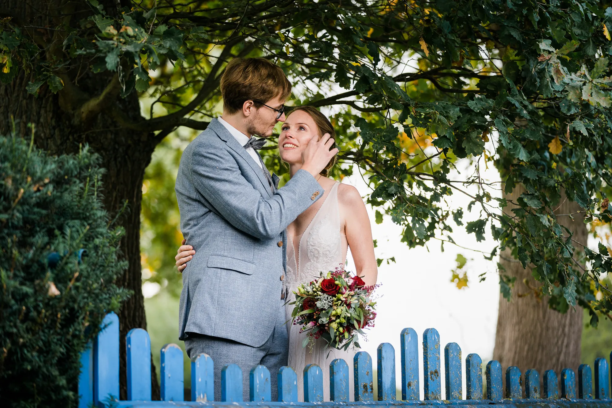 Doch es kam alles ganz anders und viel, viel besser. Es wurde nämlich von dem Brautpaar und mir nicht das Schloss als Location für Hochzeitsbilder ausgewählt, sondern das Elternhaus des Bräutigams. Warum? Darum: Der Bräutigam ist in diesem Haus groß geworden. Er hat dort viele Momente erlebt, geweint, gelacht und sicherlich auch seine zukünftige Braut irgendwann dort vorgestellt. Es ist also seine Heimat, deren Zuhause und Umfeld. Sie sind da sicherlich oft ein und ausgegangen. Darum war dieser Ort besser als das ihnen eigentlich fremde Schloss. Das Elternhaus hat ein schnuckeliges blaues Holzgartentor, viele Bäume und die kleine verträumte alte Schoppe. Nicht zu vergessen, und typisch münsterländisch, der durch die Nachbarn mit einem Hochzeitsbogen geschmückte Hauseingang.