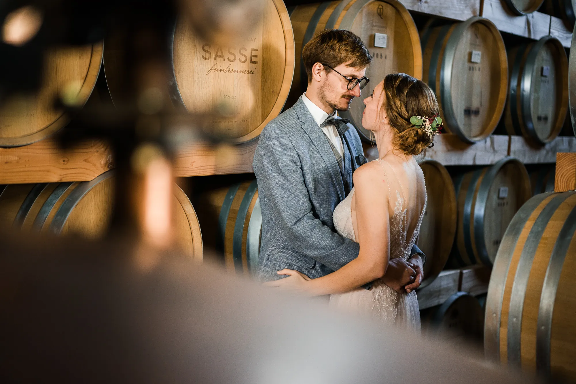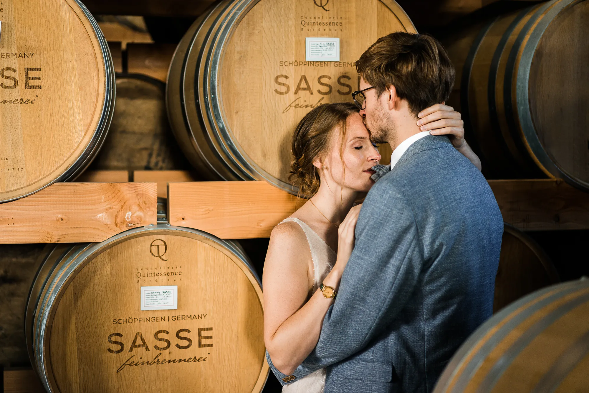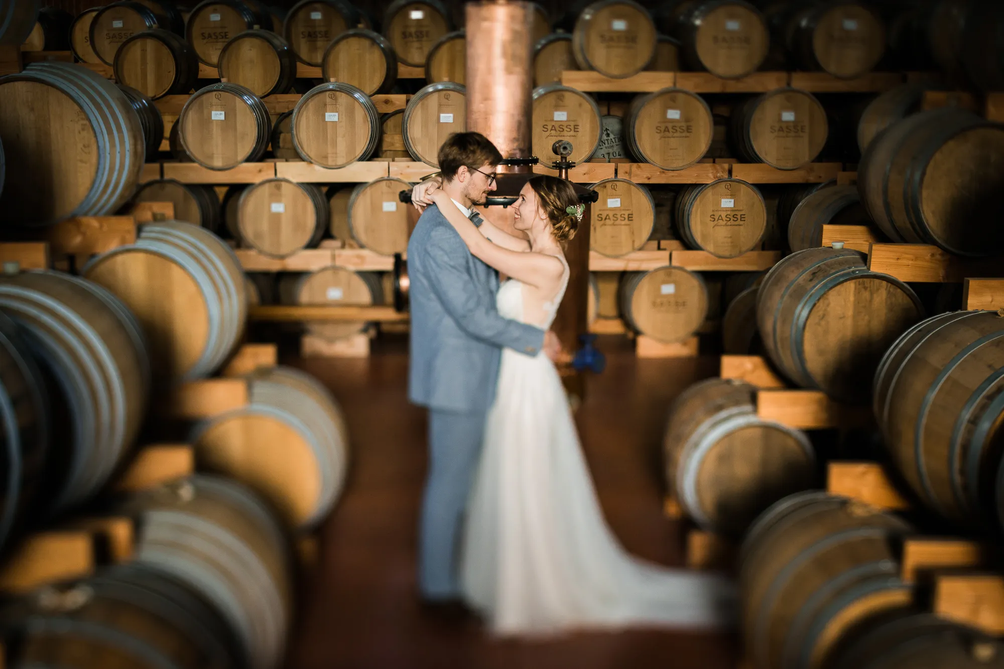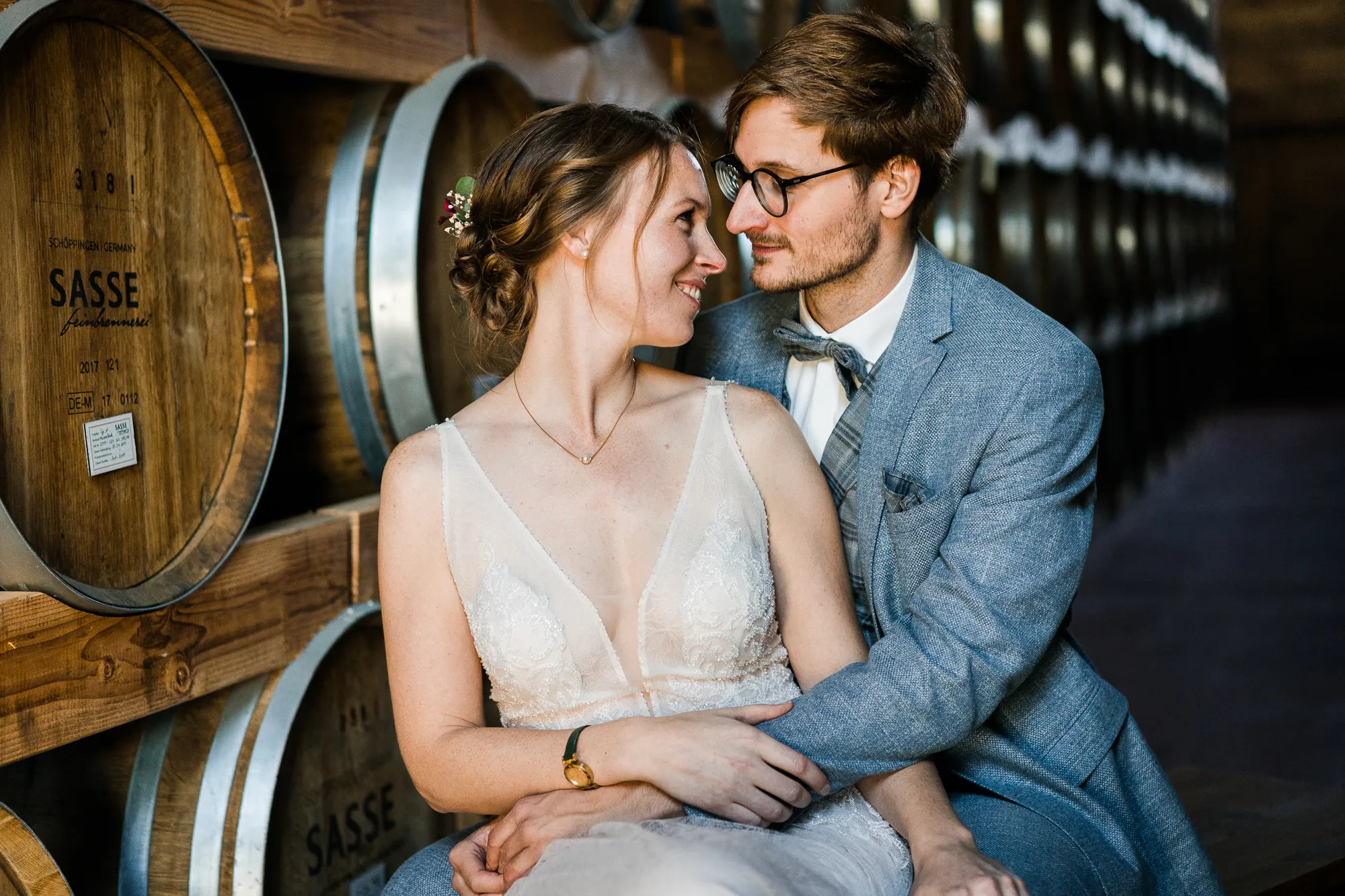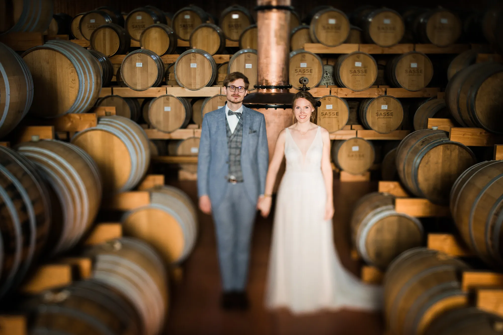 Bereits im Vorfeld, also Wochen vor der Hochzeit, machten wir uns Gedanken, wo wir Paarbilder und Familienbilder machen könnten, wenn es regnen würde. Schnell kam von meinem Brautpaar der Vorschlag bei Sasse http://www.sassekorn.de/ ,einer Kornbrennerei, Hochzeitsbilder zu machen. Als geborener Münsterländer ist mir Sasse natürlich ein Begriff und ich fand den Vorschlag super, ohne genau zu wissen was da auf uns zukommt. Wir besuchten zusammen Sasse, wurden sehr herzlich empfangen und konnten uns alles anschauen. Für mich war das so, als würde ich als kleiner Junge in einen Süßigkeitenladen gehen. Nicht nur wegen den Leckereien in den Flaschen. Ich war von der Location an sich total angetan und begeistert. Da waren zum einen die alten Holzfässer in einer Halle. Sehr schön gestapelt und mit tollem Licht von vorne. Hier haben wir sehr schöne Hochzeitbilder zwischen diesen alten Holzfässern gemacht.