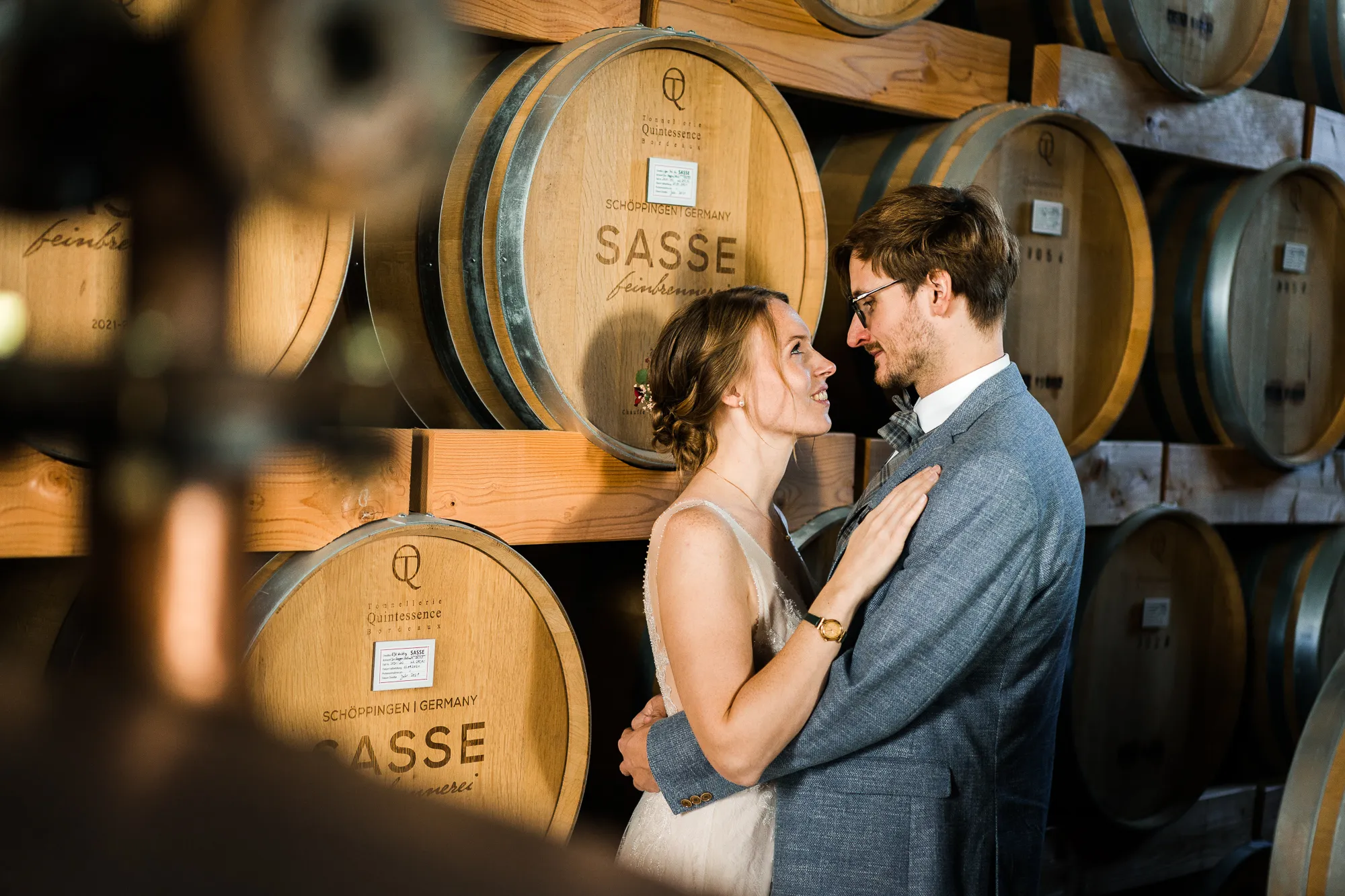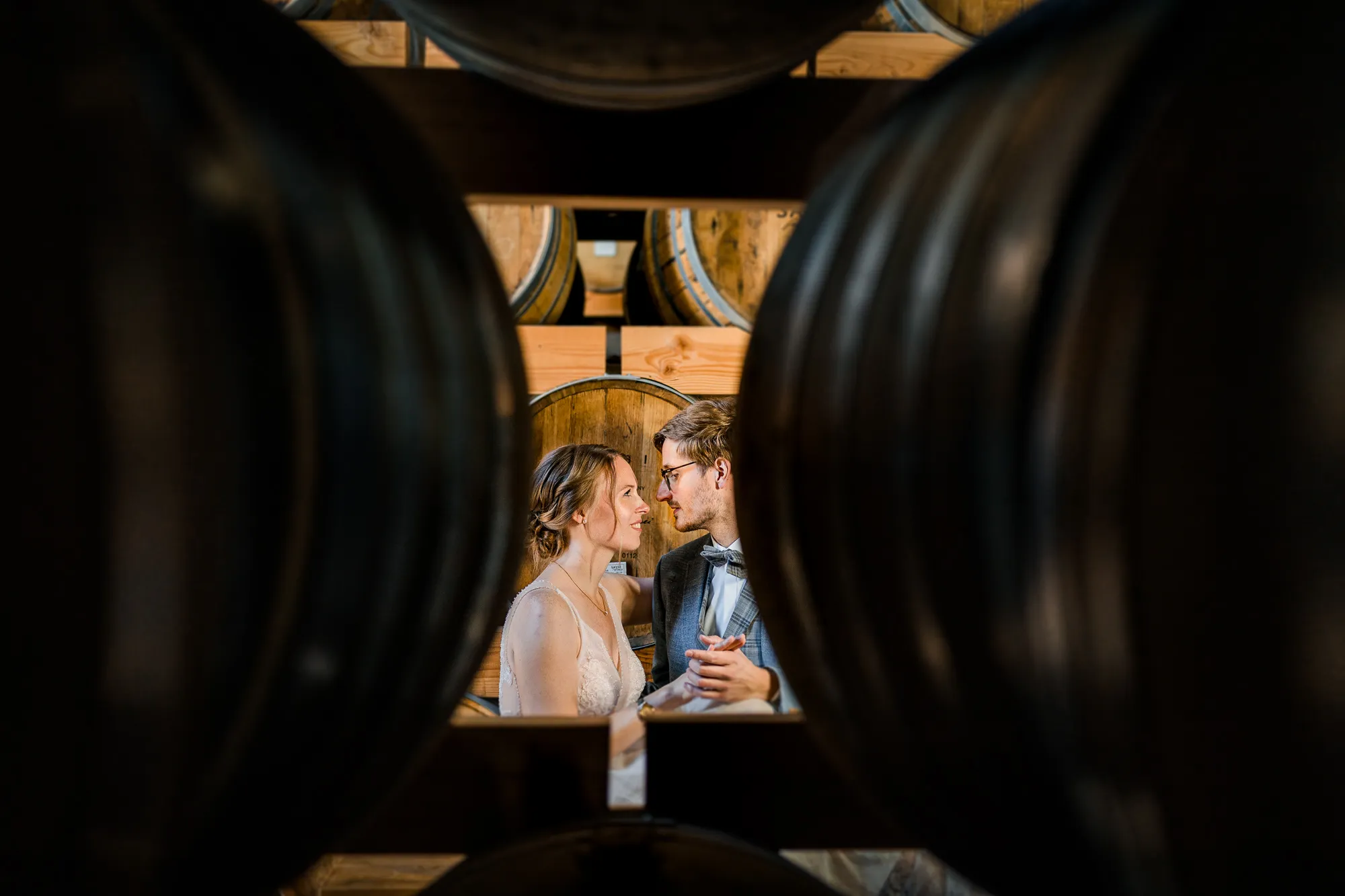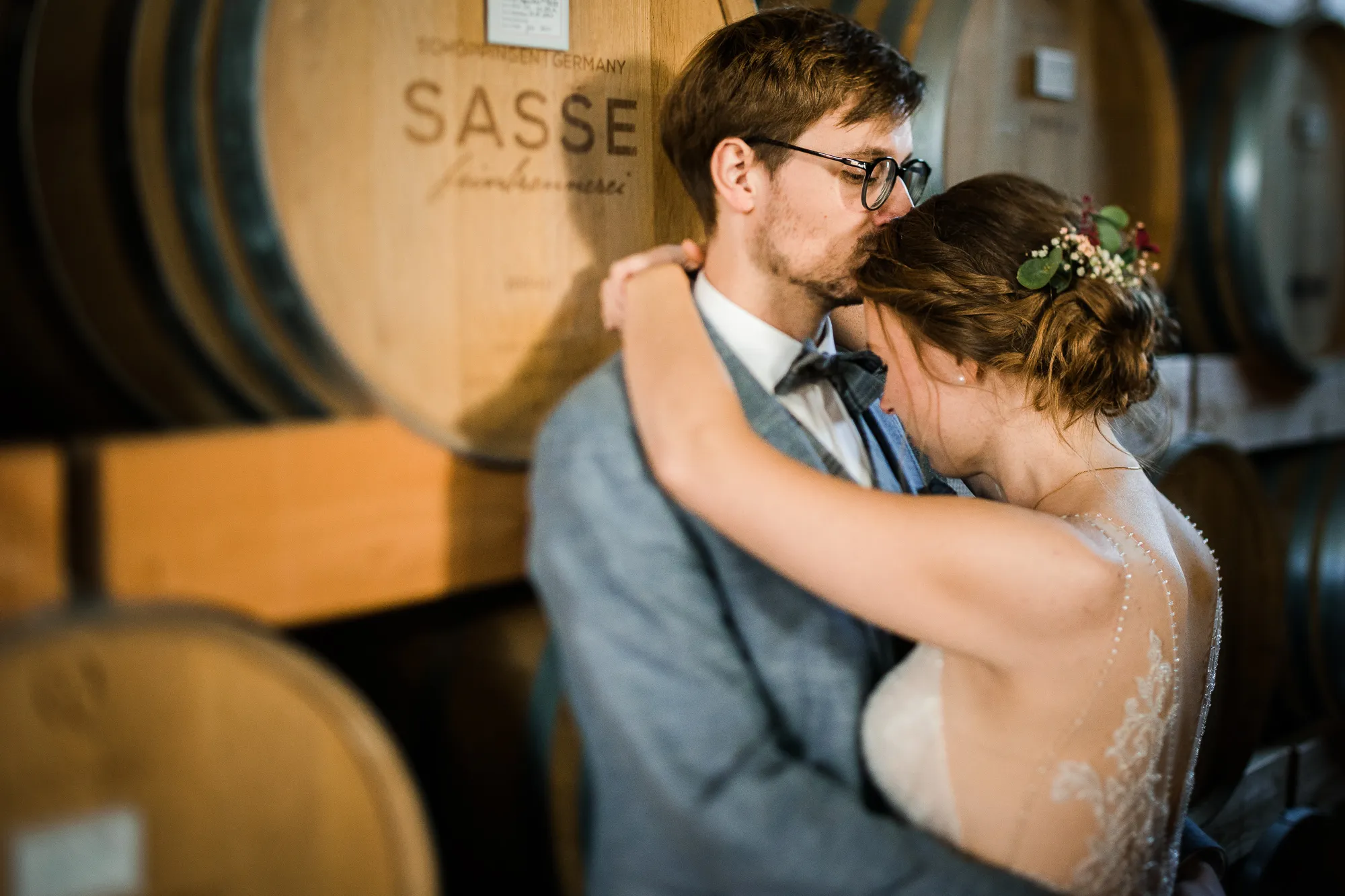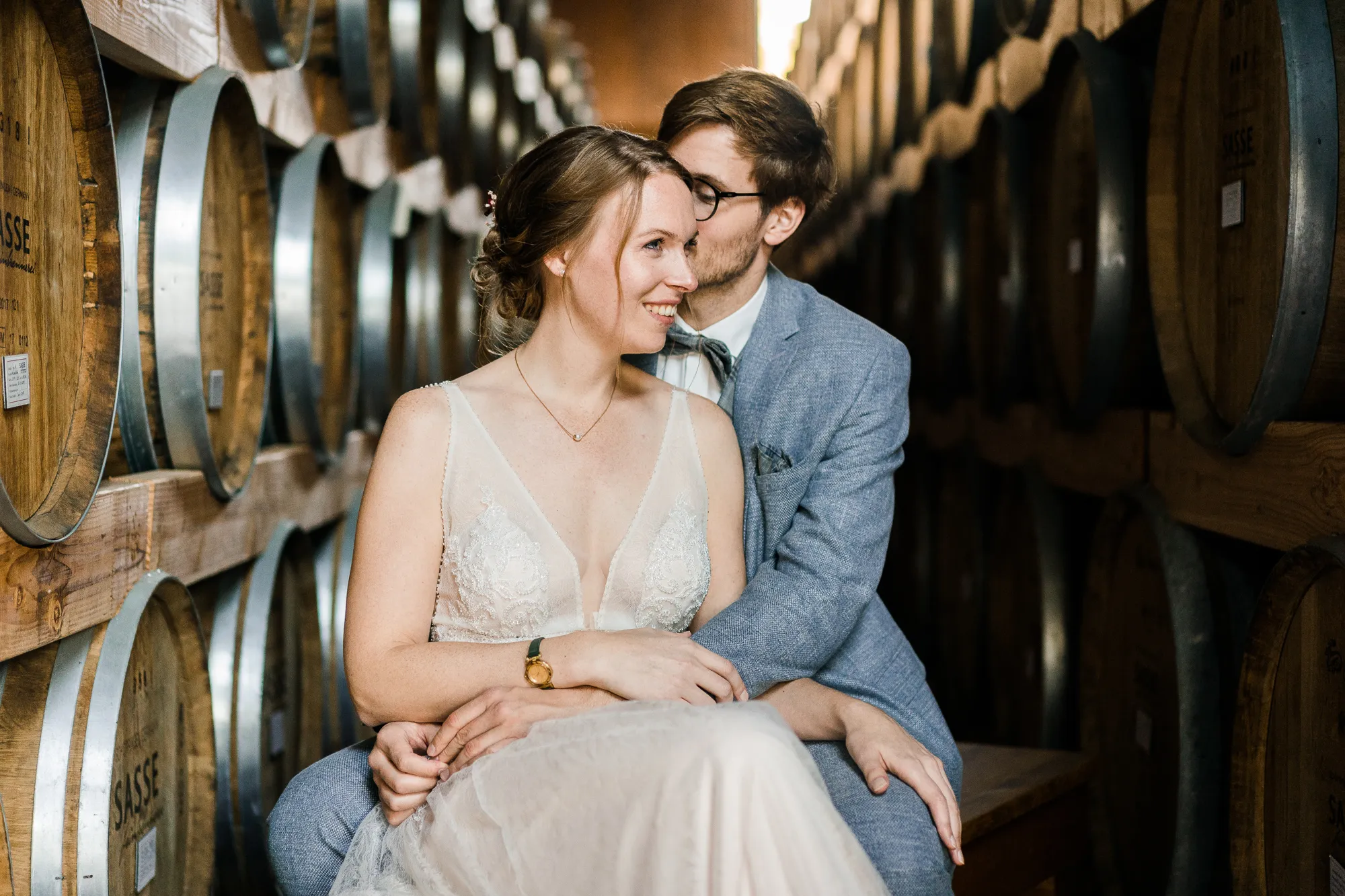 Bereits im Vorfeld, also Wochen vor der Hochzeit, machten wir uns Gedanken, wo wir Paarbilder und Familienbilder machen könnten, wenn es regnen würde. Schnell kam von meinem Brautpaar der Vorschlag bei Sasse http://www.sassekorn.de/ ,einer Kornbrennerei, Hochzeitsbilder zu machen. Als geborener Münsterländer ist mir Sasse natürlich ein Begriff und ich fand den Vorschlag super, ohne genau zu wissen was da auf uns zukommt. Wir besuchten zusammen Sasse, wurden sehr herzlich empfangen und konnten uns alles anschauen. Für mich war das so, als würde ich als kleiner Junge in einen Süßigkeitenladen gehen. Nicht nur wegen den Leckereien in den Flaschen. Ich war von der Location an sich total angetan und begeistert. Da waren zum einen die alten Holzfässer in einer Halle. Sehr schön gestapelt und mit tollem Licht von vorne. Hier haben wir sehr schöne Hochzeitbilder zwischen diesen alten Holzfässern gemacht.