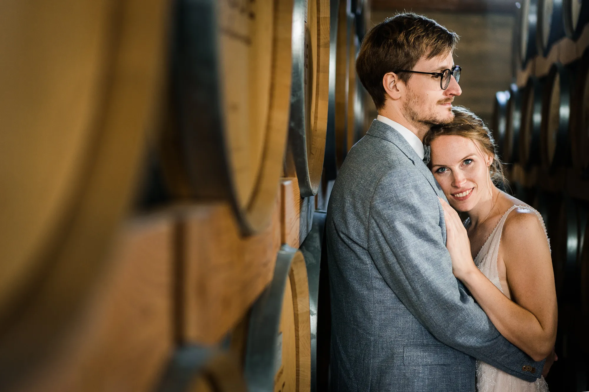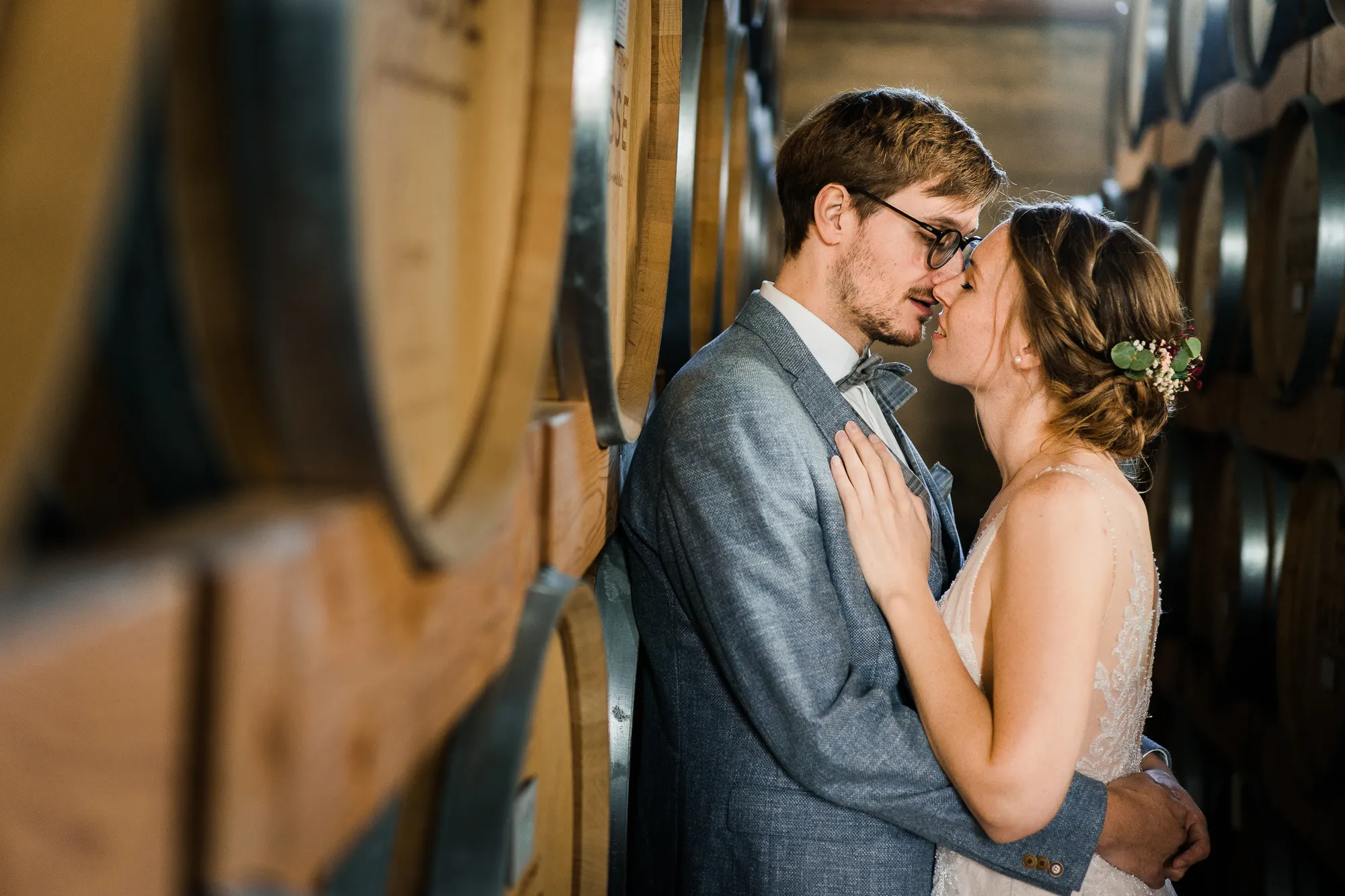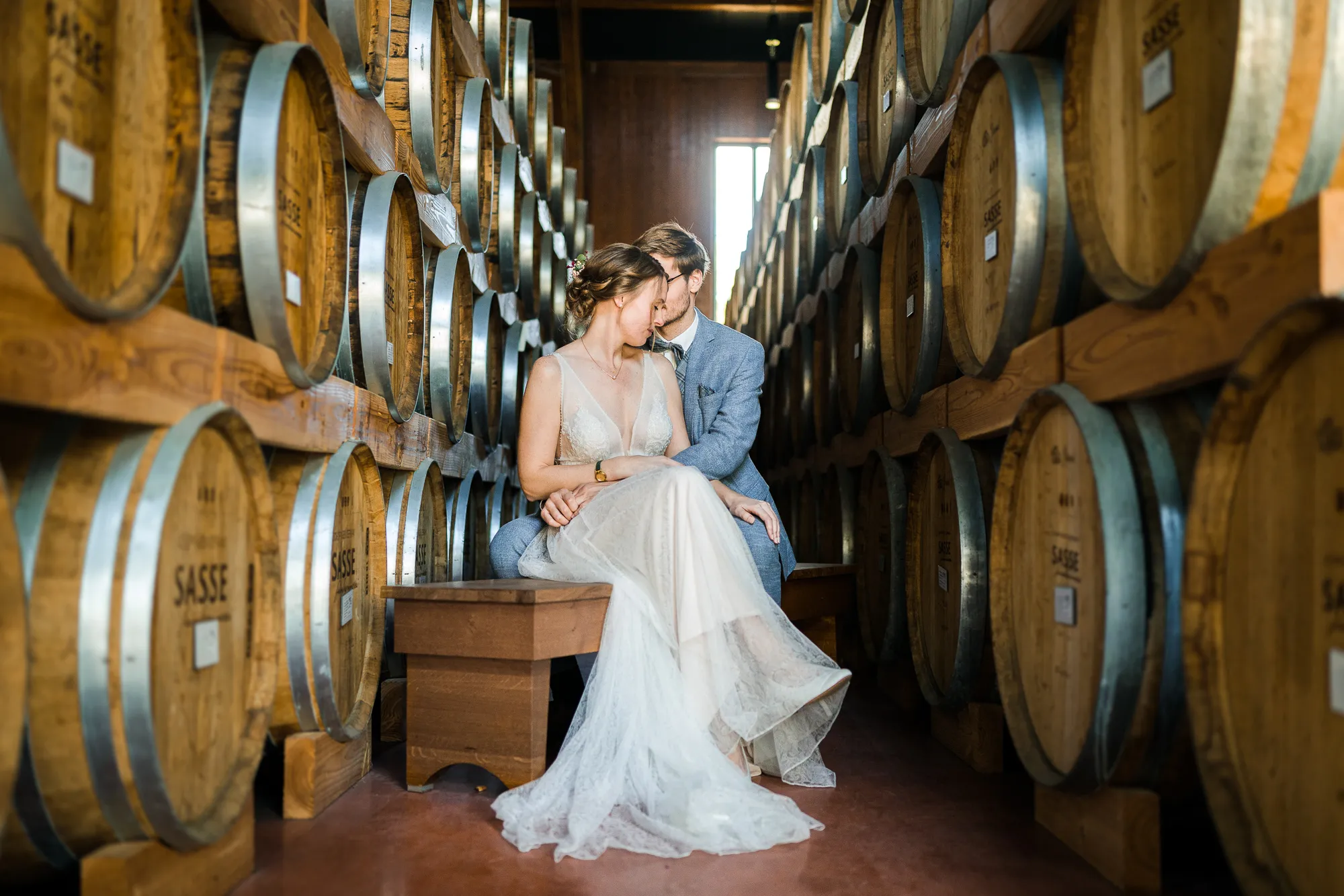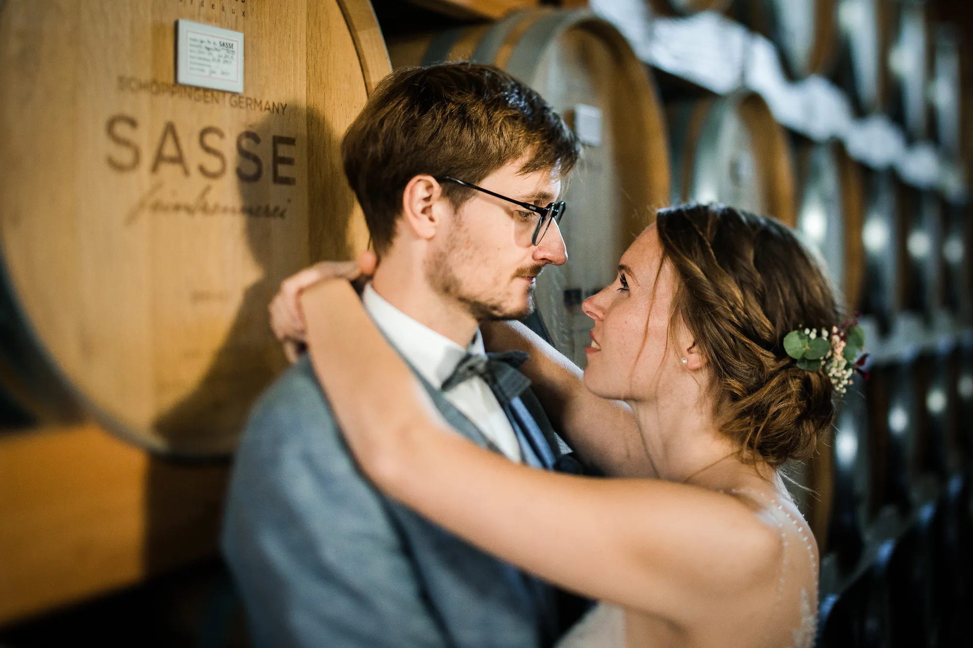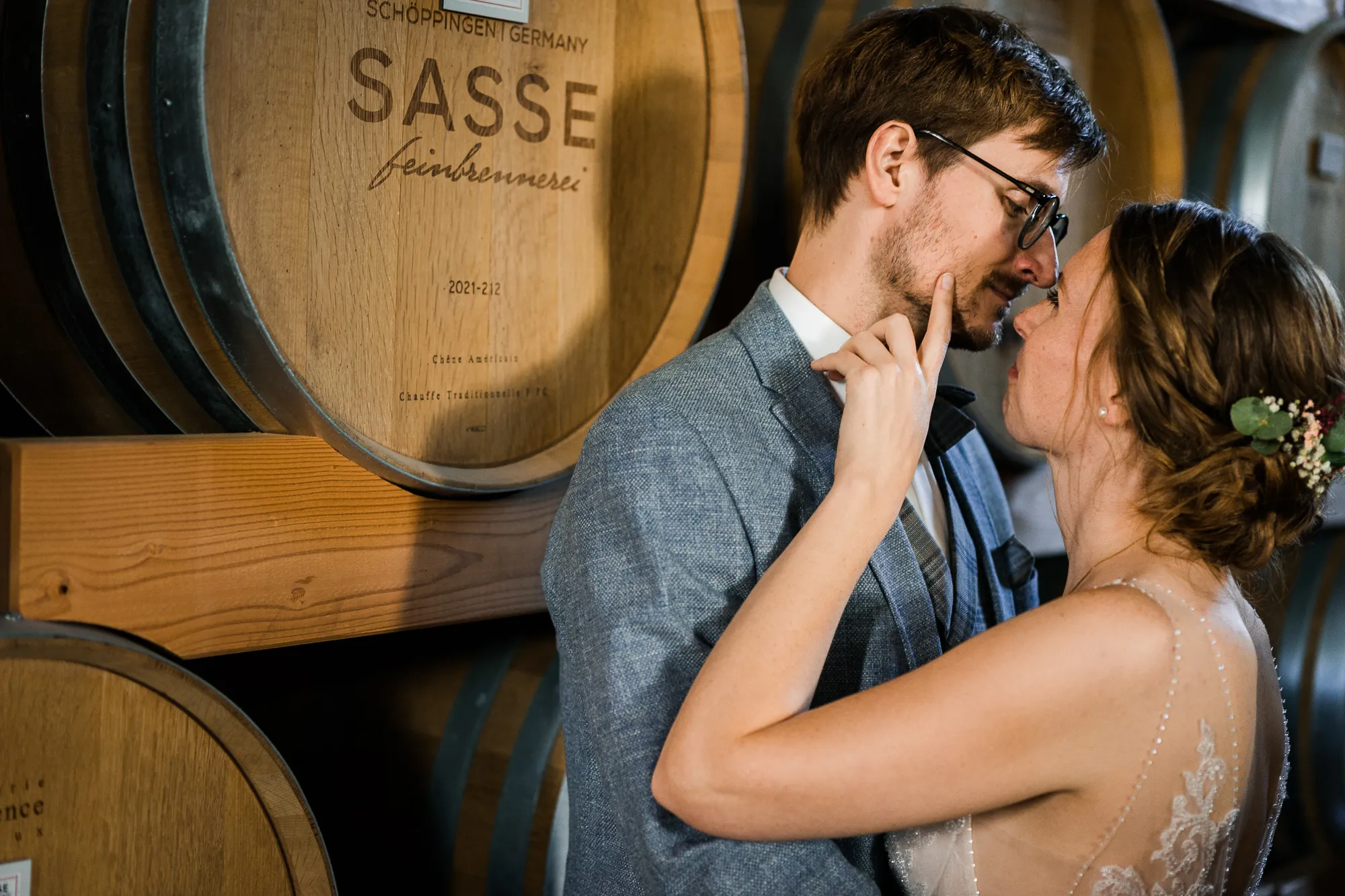 Bereits im Vorfeld, also Wochen vor der Hochzeit, machten wir uns Gedanken, wo wir Paarbilder und Familienbilder machen könnten, wenn es regnen würde. Schnell kam von meinem Brautpaar der Vorschlag bei Sasse http://www.sassekorn.de/ ,einer Kornbrennerei, Hochzeitsbilder zu machen. Als geborener Münsterländer ist mir Sasse natürlich ein Begriff und ich fand den Vorschlag super, ohne genau zu wissen was da auf uns zukommt. Wir besuchten zusammen Sasse, wurden sehr herzlich empfangen und konnten uns alles anschauen. Für mich war das so, als würde ich als kleiner Junge in einen Süßigkeitenladen gehen. Nicht nur wegen den Leckereien in den Flaschen. Ich war von der Location an sich total angetan und begeistert. Da waren zum einen die alten Holzfässer in einer Halle. Sehr schön gestapelt und mit tollem Licht von vorne. Hier haben wir sehr schöne Hochzeitbilder zwischen diesen alten Holzfässern gemacht.