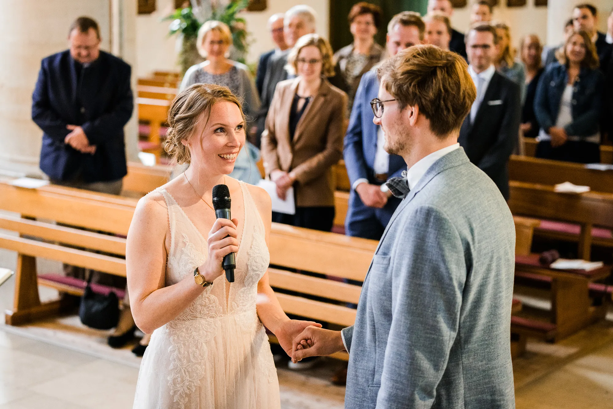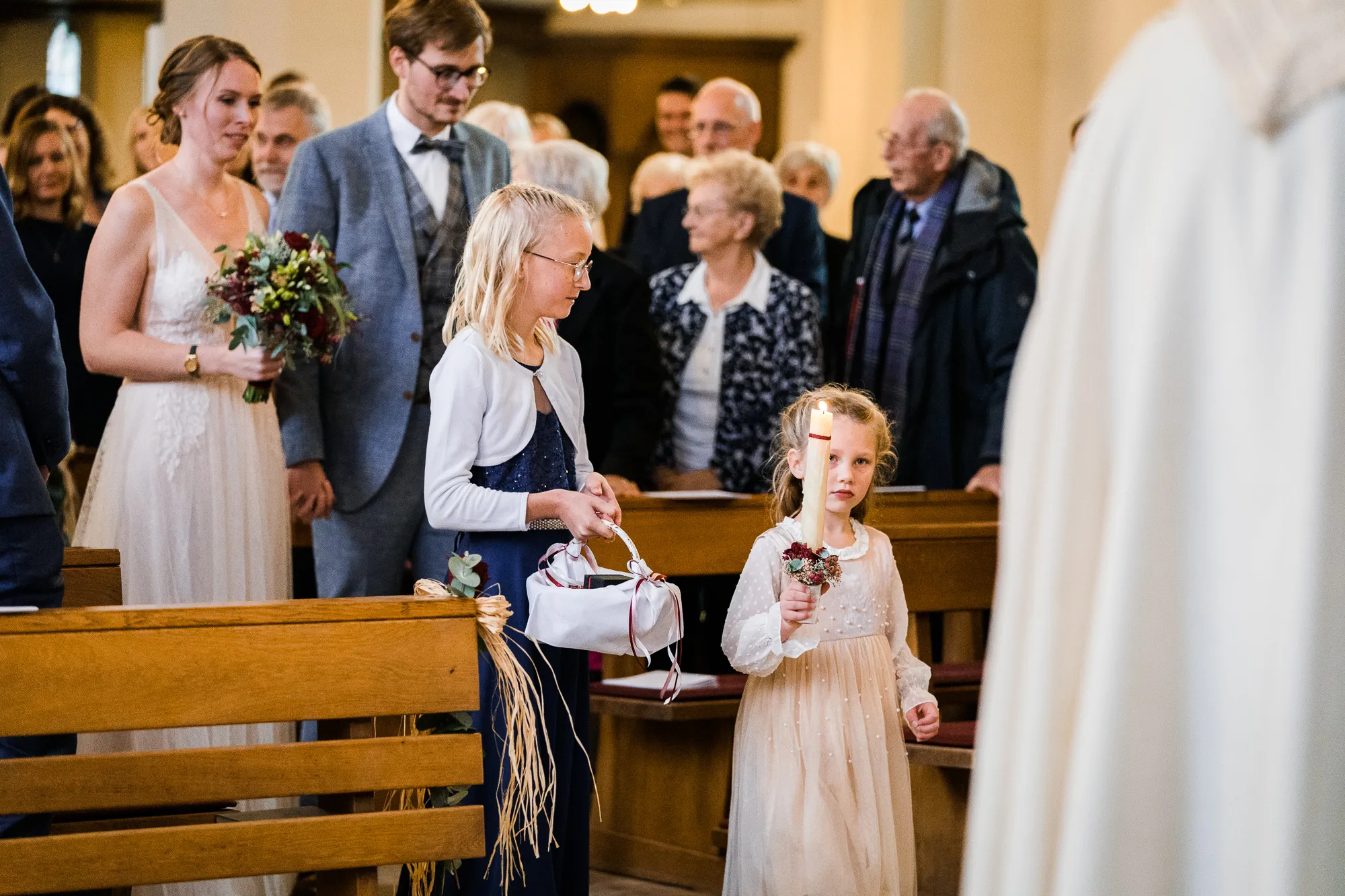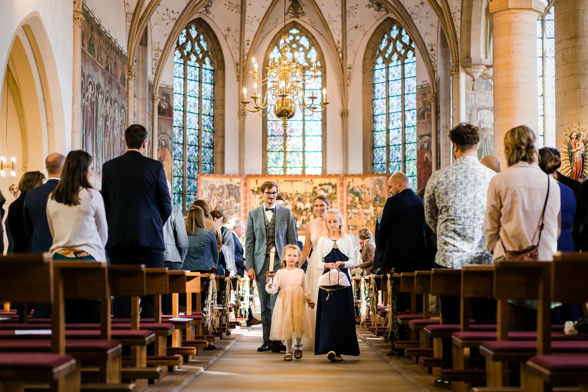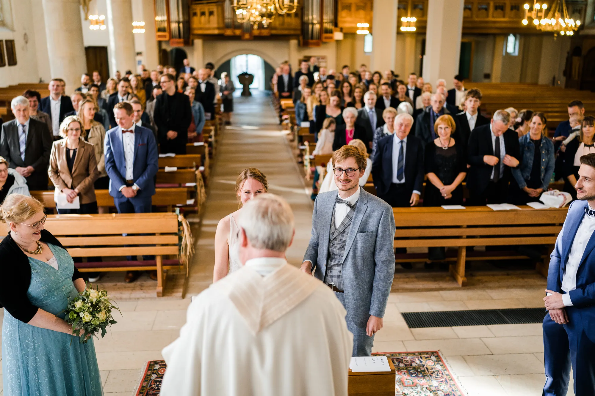 Die Trauung fand in der Kirche der Kath. Kirchengemeinde St. Brictius Schöppingen https://www.st-brictius.de/ statt. Ich machte meine Bilder und irgendwas irritierte mich. Dann plötzlich fiel es mir wie Schuppen von den Augen. Es war die Bank des Brautpaares. Sie stand nicht mittig zwischen den Seitenschiffen der Kirche. Ich dachte: Verdammt was machst du nun, wenn du später die Bilder bearbeiten wirst und ich jedes dieser Bilder seltsam finde. Gott sei Dank war ich nicht ganz alleine bei dieser Hochzeit unterwegs. Meine Tochter (13) begleitete mich. Sie ist mittlerweile eine begeisterte Fotografin und unterstützte mich an dem Tag.