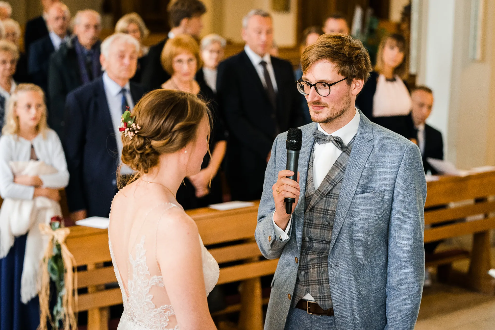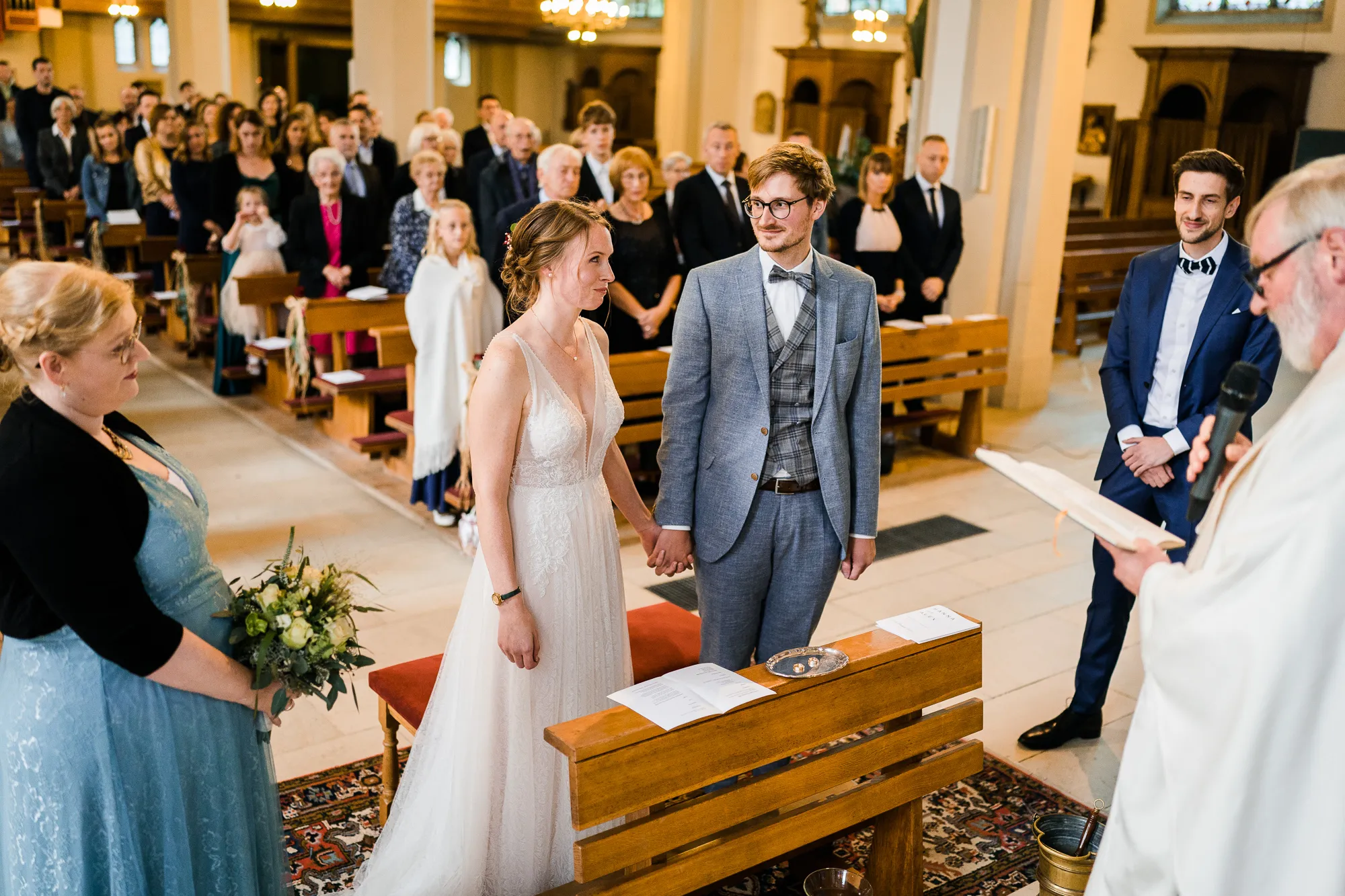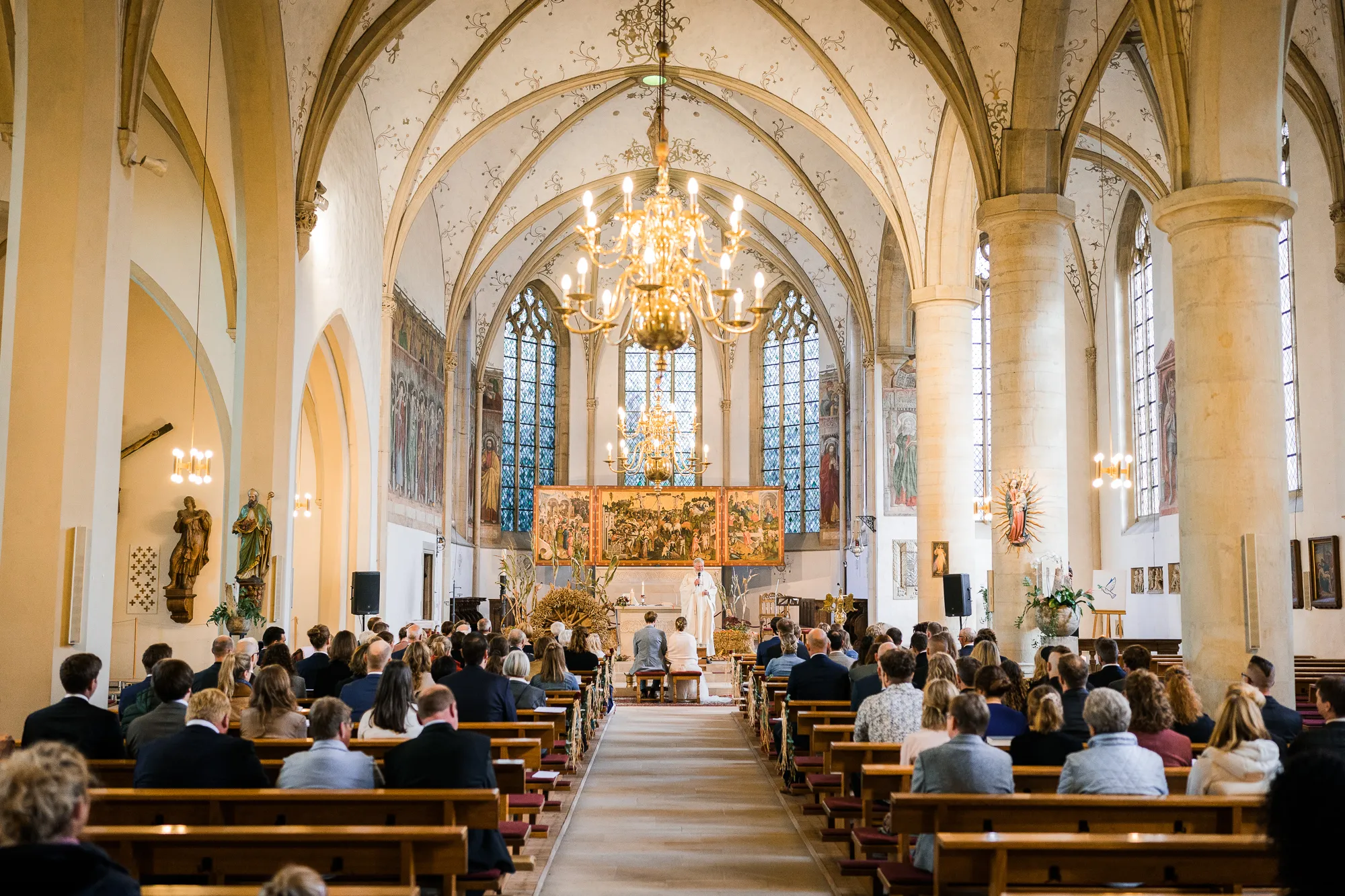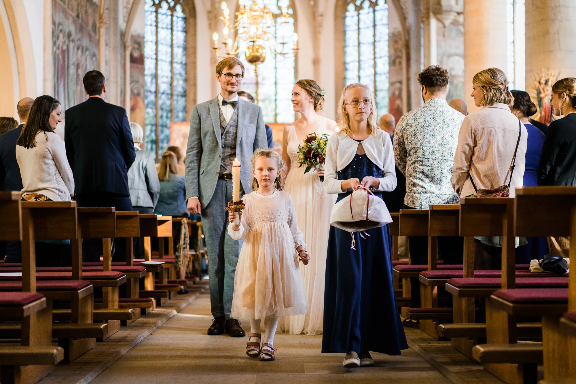 Die Trauung fand in der Kirche der Kath. Kirchengemeinde St. Brictius Schöppingen https://www.st-brictius.de/ statt. Ich machte meine Bilder und irgendwas irritierte mich. Dann plötzlich fiel es mir wie Schuppen von den Augen. Es war die Bank des Brautpaares. Sie stand nicht mittig zwischen den Seitenschiffen der Kirche. Ich dachte: Verdammt was machst du nun, wenn du später die Bilder bearbeiten wirst und ich jedes dieser Bilder seltsam finde. Gott sei Dank war ich nicht ganz alleine bei dieser Hochzeit unterwegs. Meine Tochter (13) begleitete mich. Sie ist mittlerweile eine begeisterte Fotografin und unterstützte mich an dem Tag.