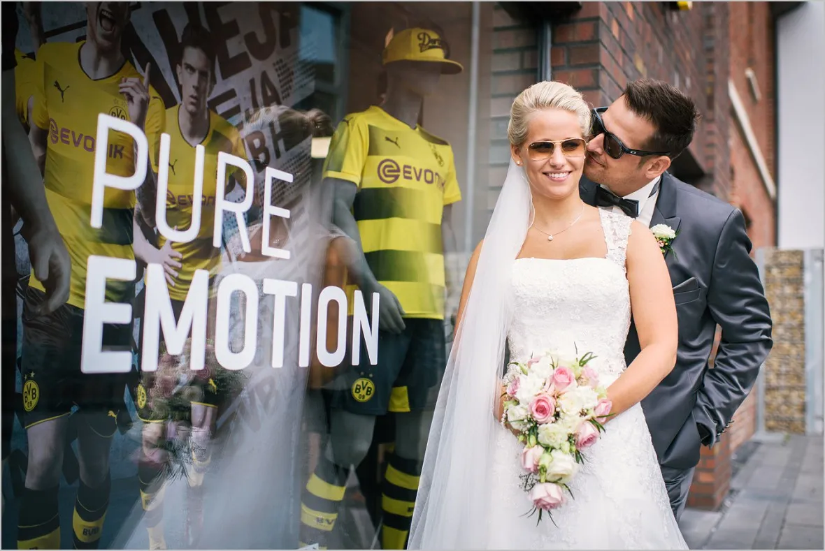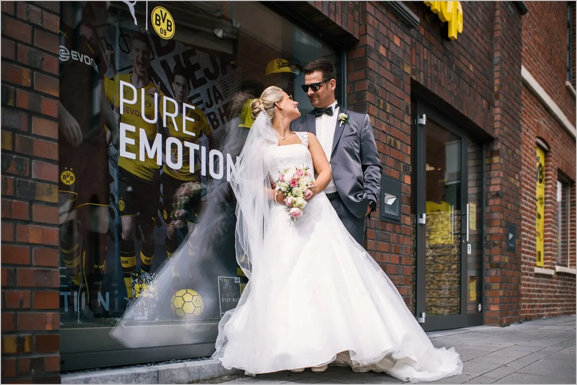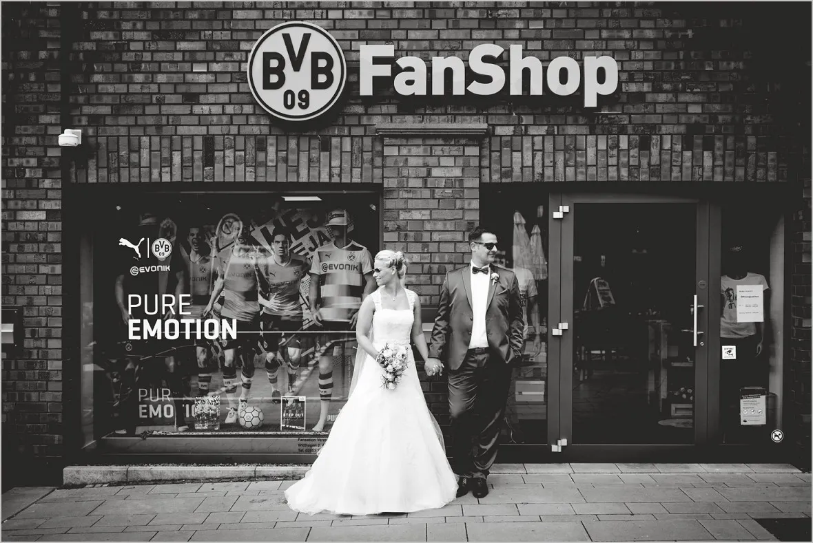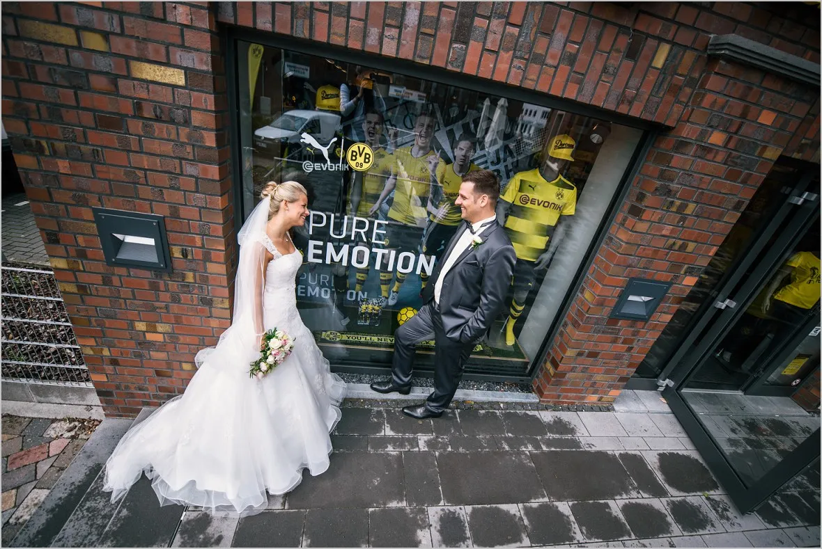 Regen. Ja und wie. Sprühregen von unten. Gott sei Dank ist mein Brautpaar ist aber wasserfest. Wir machten sehr tolle Bilder in der Natur und im BVB Fanshop in Ochtrup. Er ist in Dortmund aufgewachsen (welche Fangattung er angehört, muss ich, so glaube ich, nicht sagen 😉 ), hat sich in Sie verliebt, ist nach Ochtrup gezogen und hat irgendwie nun Beides.