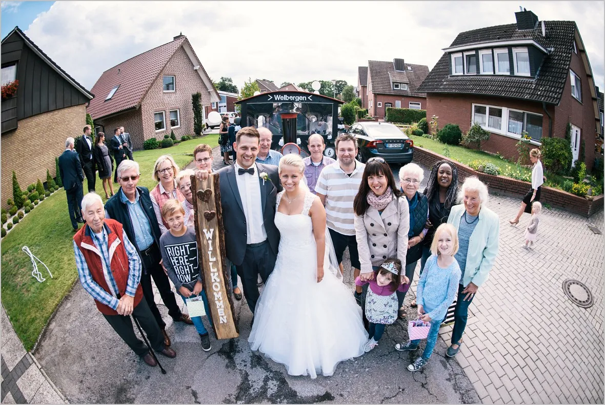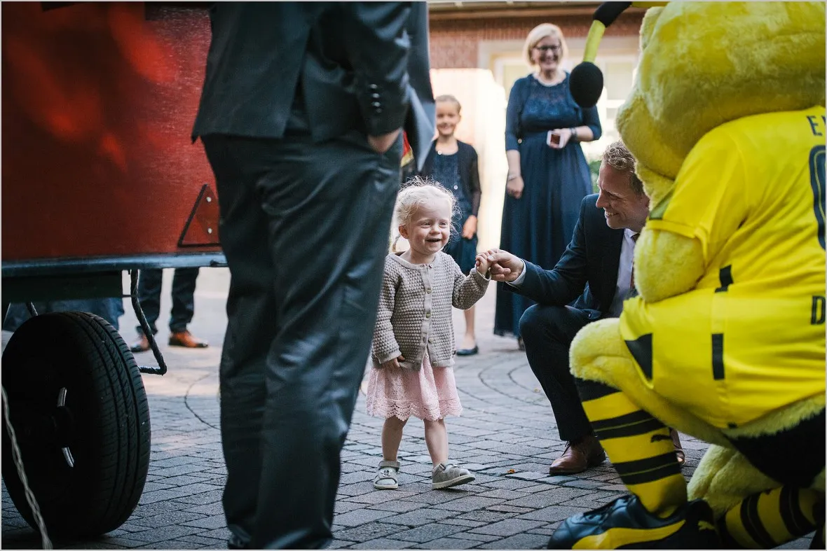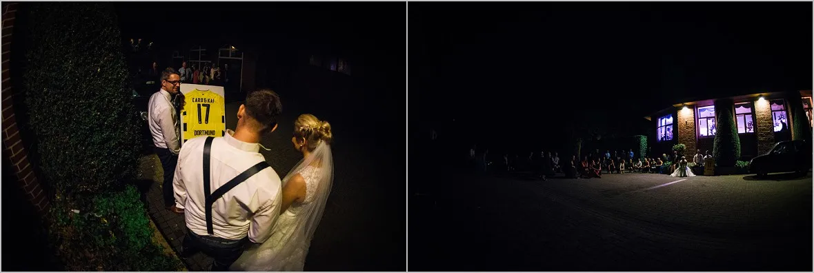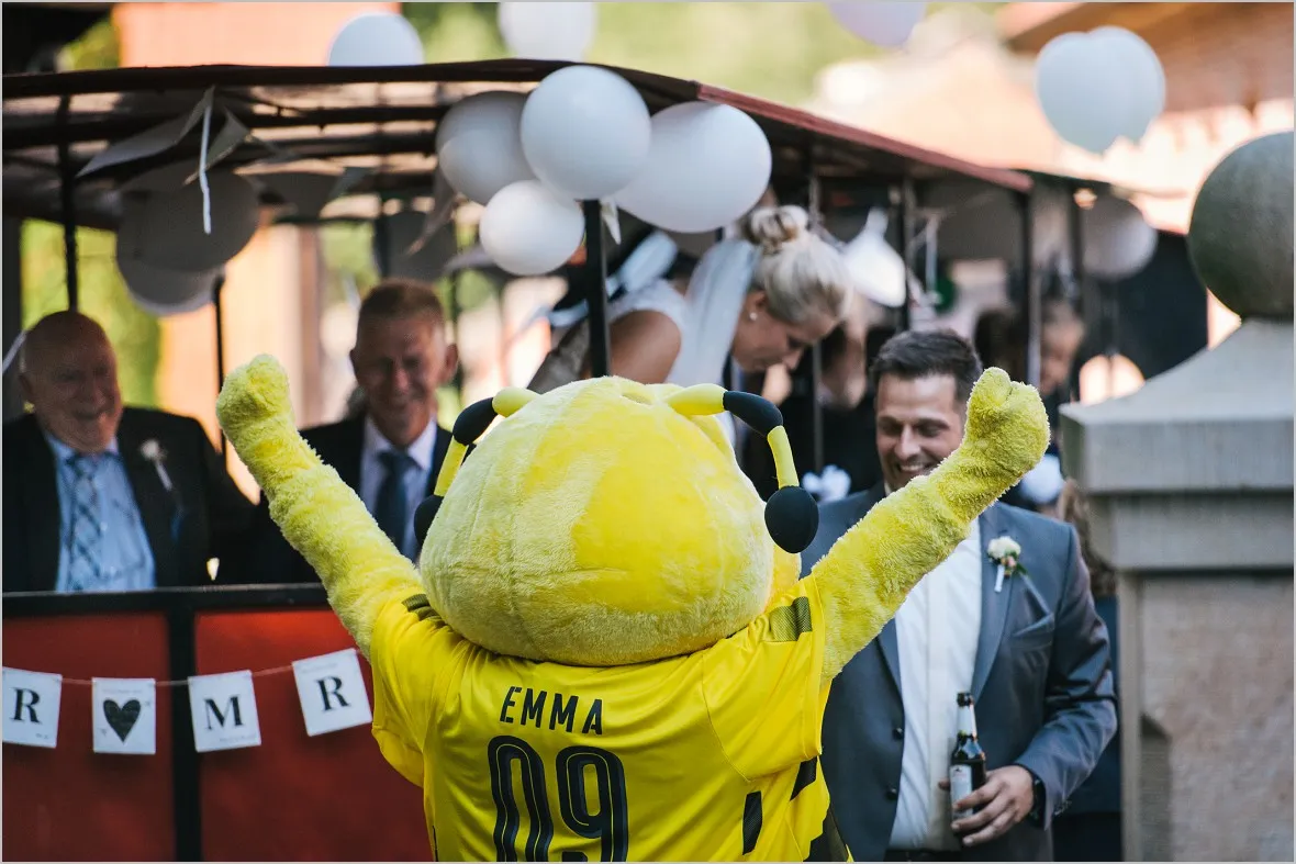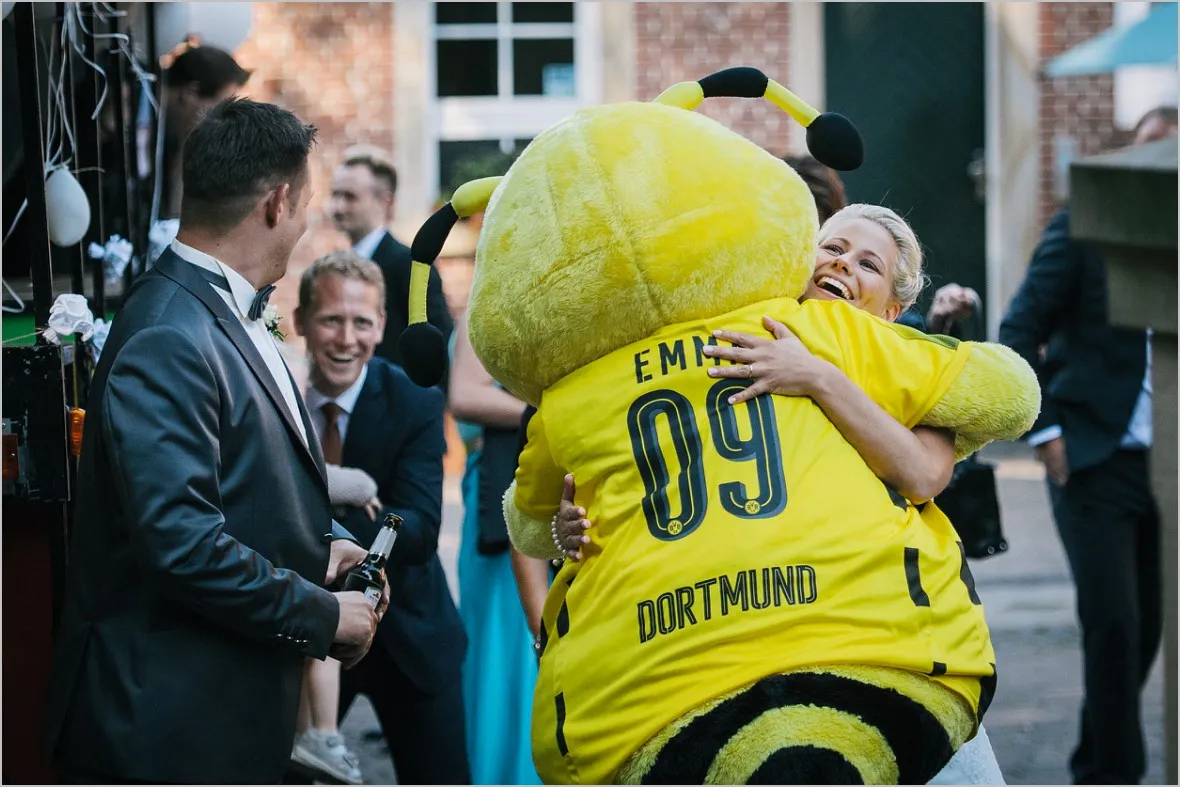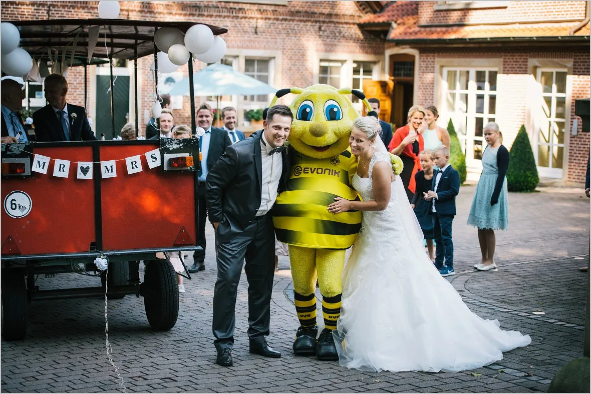 Die Trauung fand in der sehr heimeligen alten St. Johannis Kirche in Langenhorst statt. Bimmelbahn und Seilchenspannen der Nachbarn folgten. Typische münsterlandische Hochzeitsbräuche. Herrlich. Gefeiert wurde im Landgasthof Hagenhoff Rothenberge. Natürlich bis in den frühen Morgenstunden. Emma, original BVB Maskottchen war tatsächlich auch angeflogen um das Brautpaar zu knuddeln. Liebes Brautpaar, Ich sage Danke!