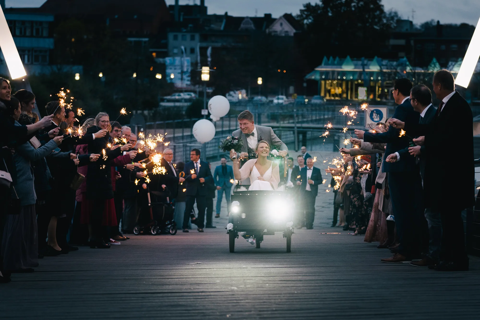 Nach der Trauung gab es für das Brautpaar einen zauberhaften Spalier auf dem Fußweg zur Feierlocation. Traulocation und Feierlocation sind nicht weit voneinander entfernt und alle Hochzeitsgäste waren eingeladen, zusammen mit dem Brautpaar, rüber zu laufen. Rüber, ist gut, eine Brücke gab es wirklich! Die Beiden mussten aber nicht laufen, sondern hatten ein Lastenrad gestellt bekommen. Sie durfte Platz nehmen und er durfte treten. Herrliche Bilder!