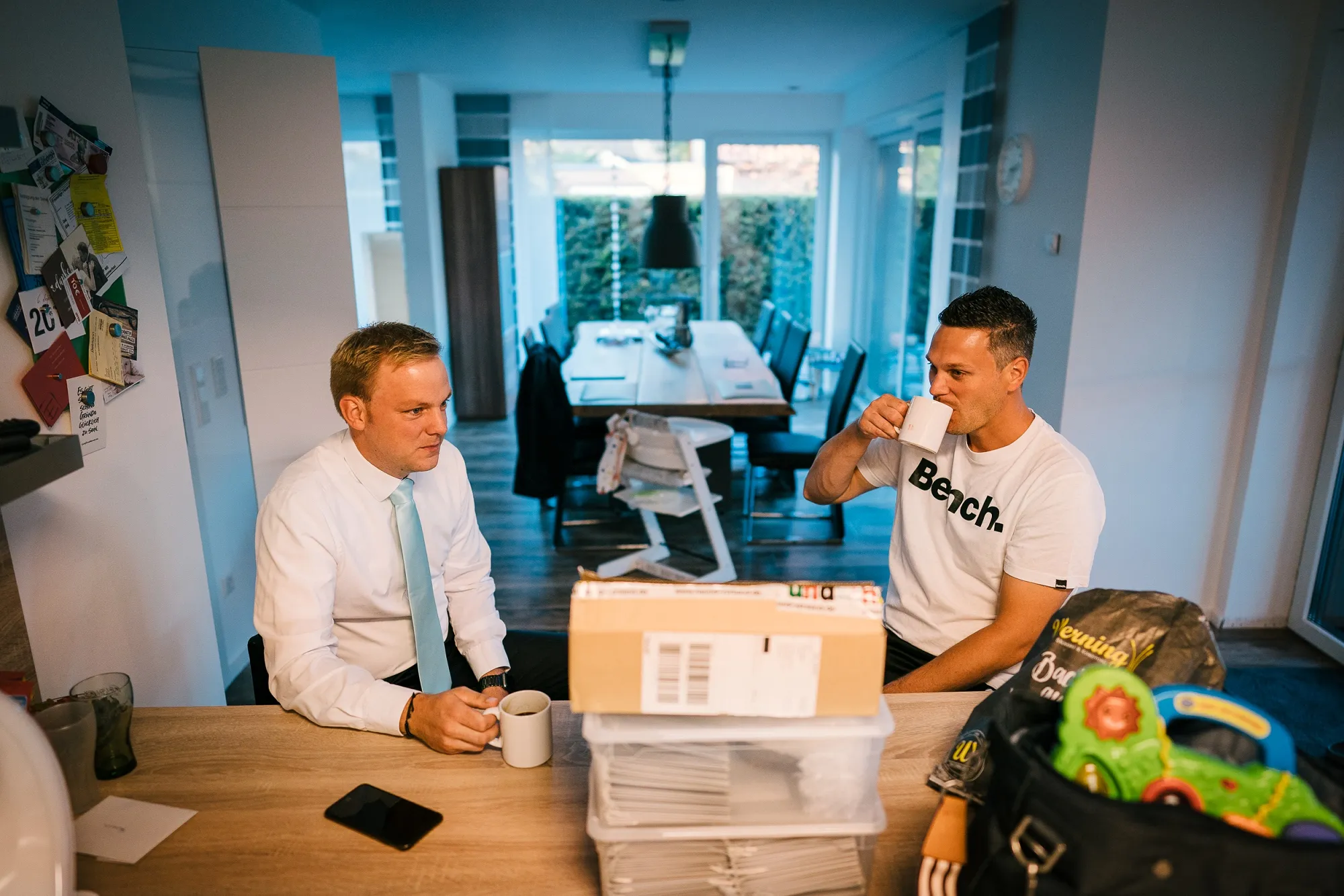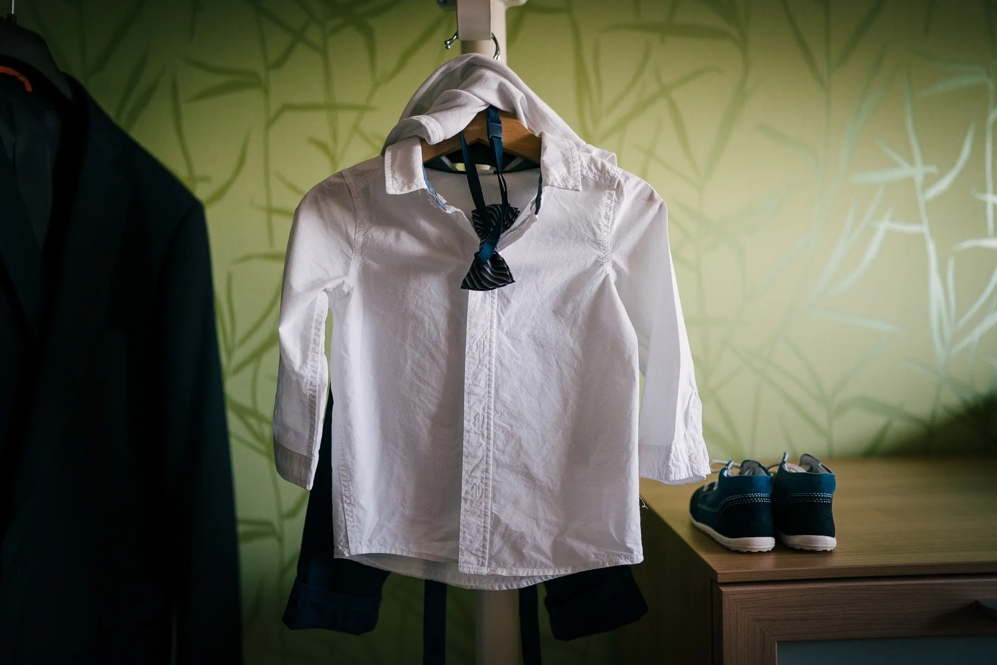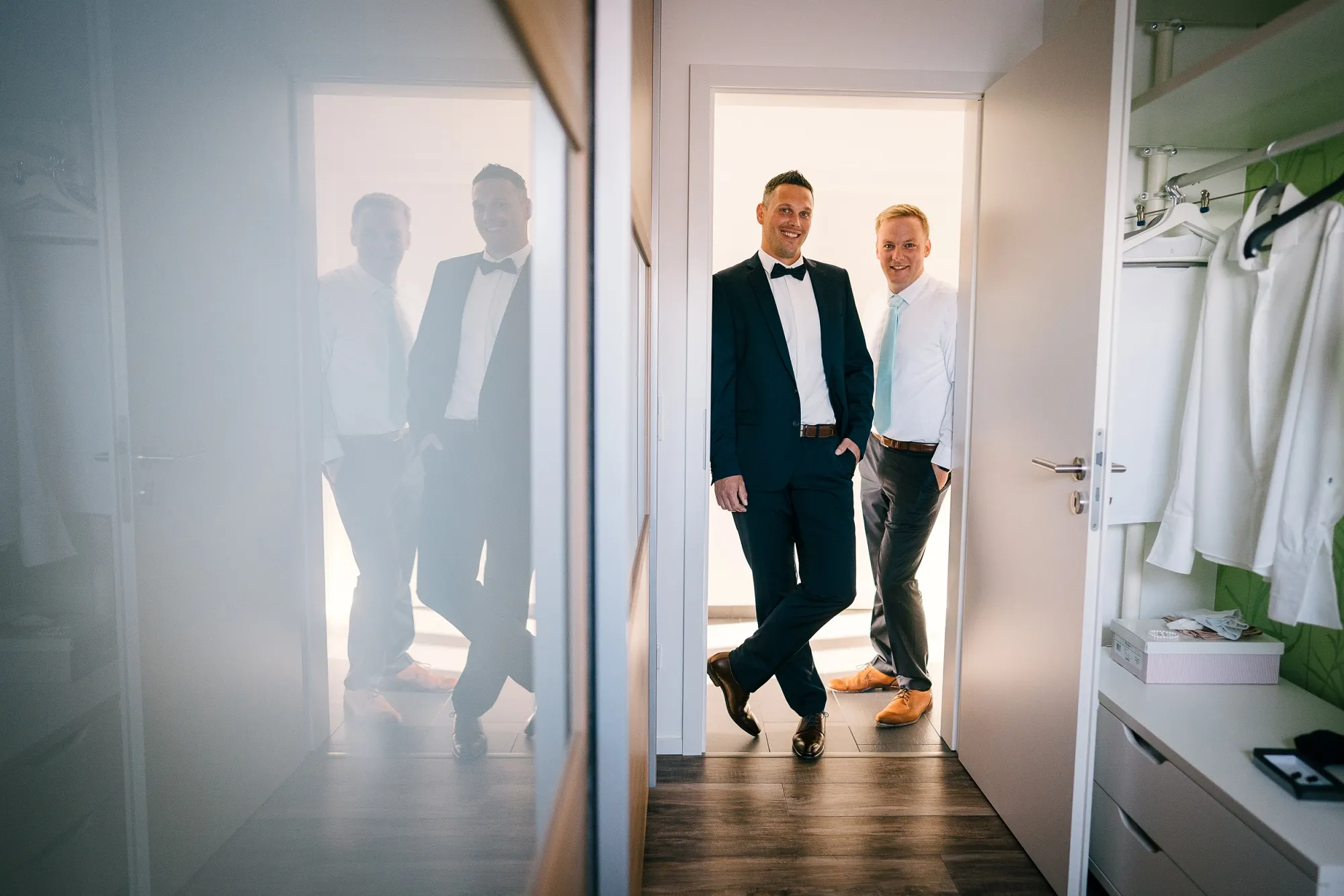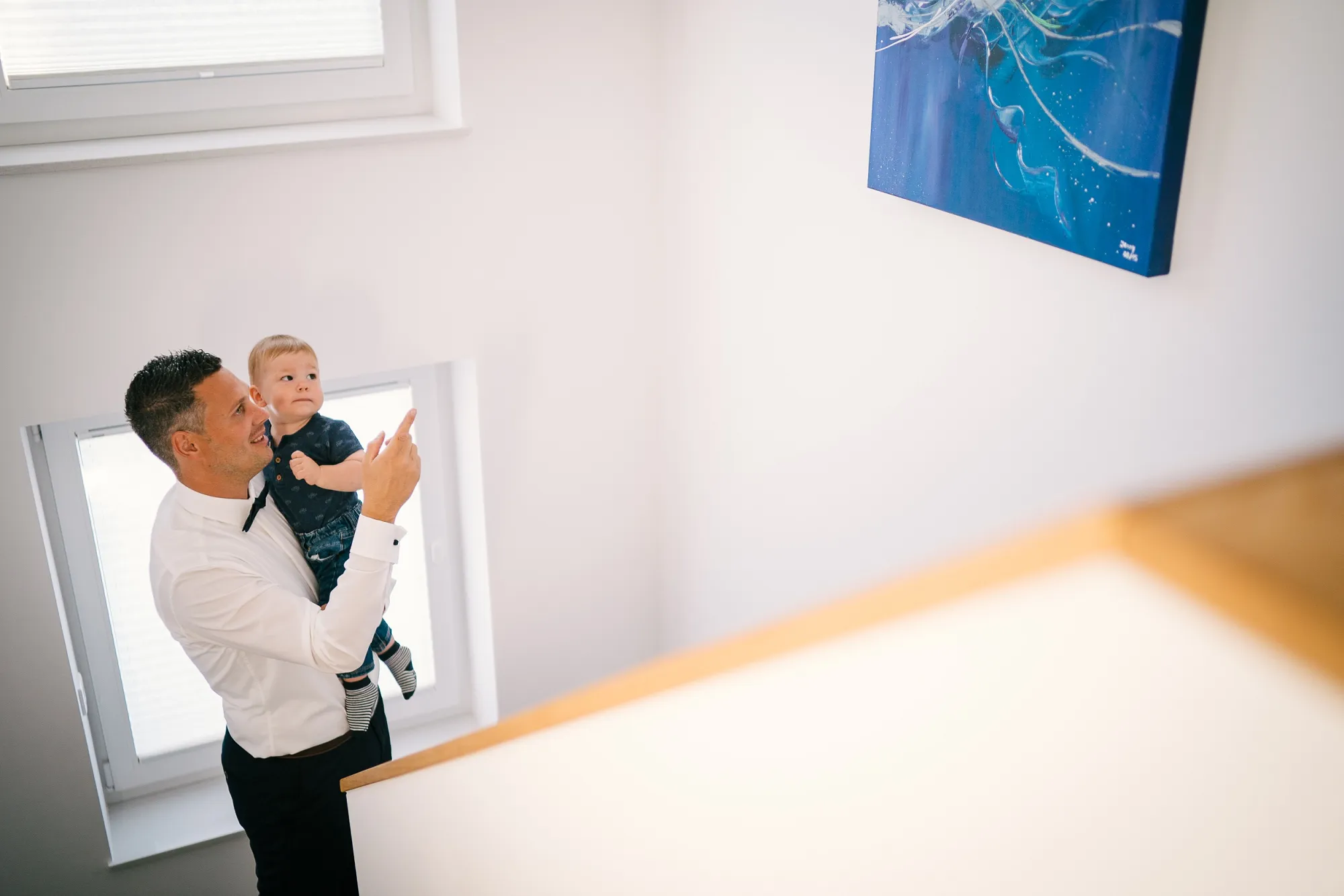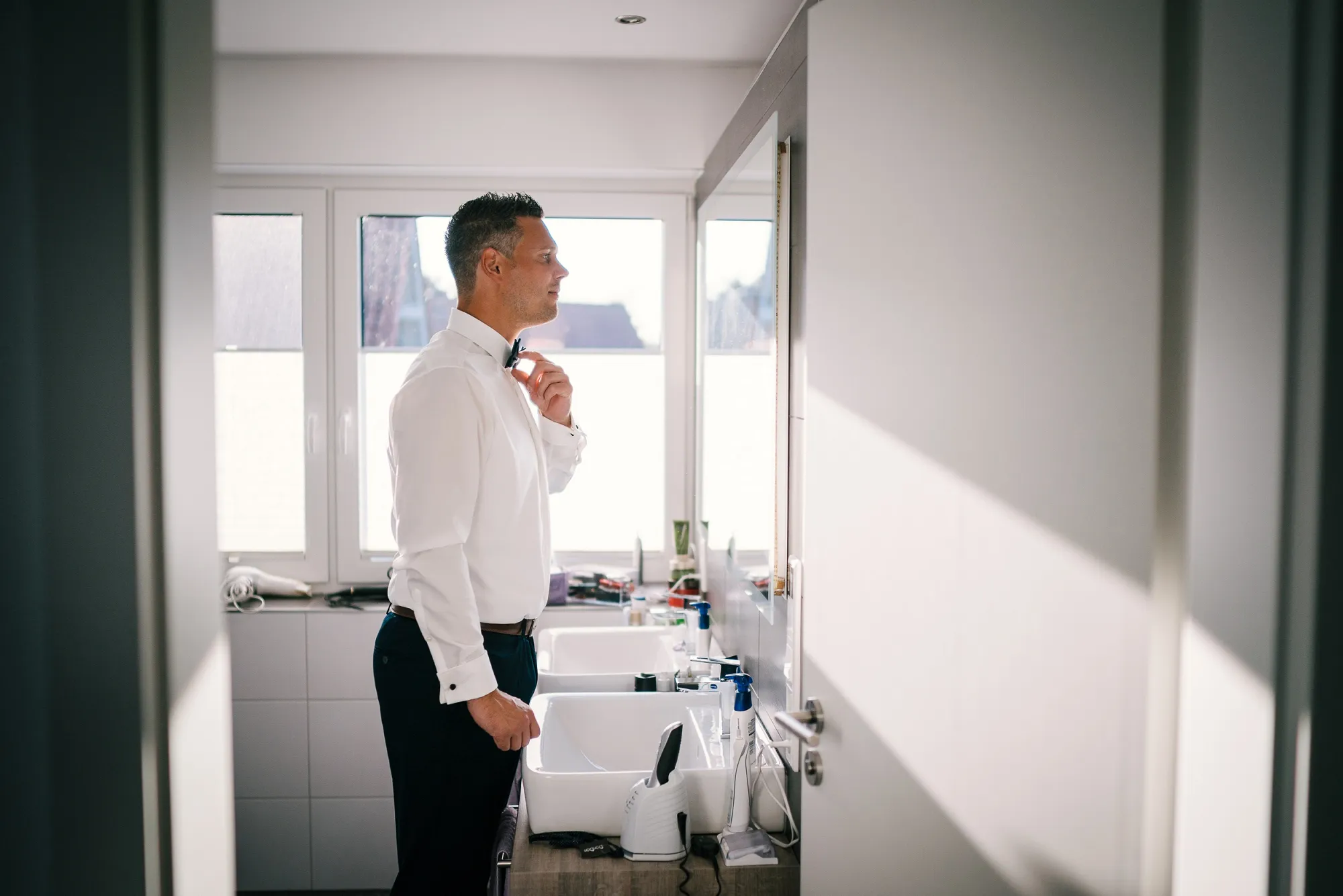 Mich führte die Hochzeitsfotografie dieses Mal nach Leer. Früh morgens startete ich mit dem Getting Ready vom Bräutigam. Doch dann meldete sich noch jemand! Ben, wollte auch aufstehen! Herrlich, was dann passierte. Der Bräutigam also der Papa, kümmerte sich rührend und machte ihn zuerst fertig. Danach ging es mit ihm selbst weiter. Einfach toll und es entstanden wunderbare Bilder vom kleinen Sohnemann. Es war ja auch ganz sicher sein Tag, denn an diesem Tag wurde er nach der Trauung seiner Eltern getauft!