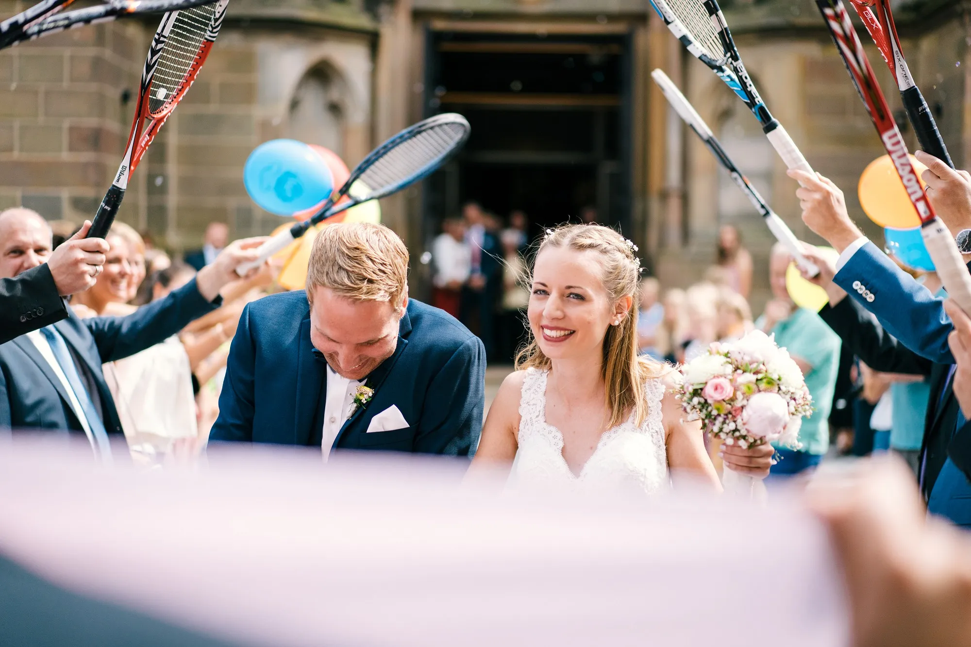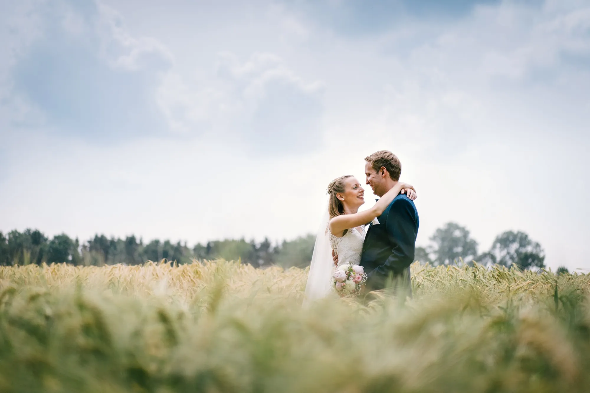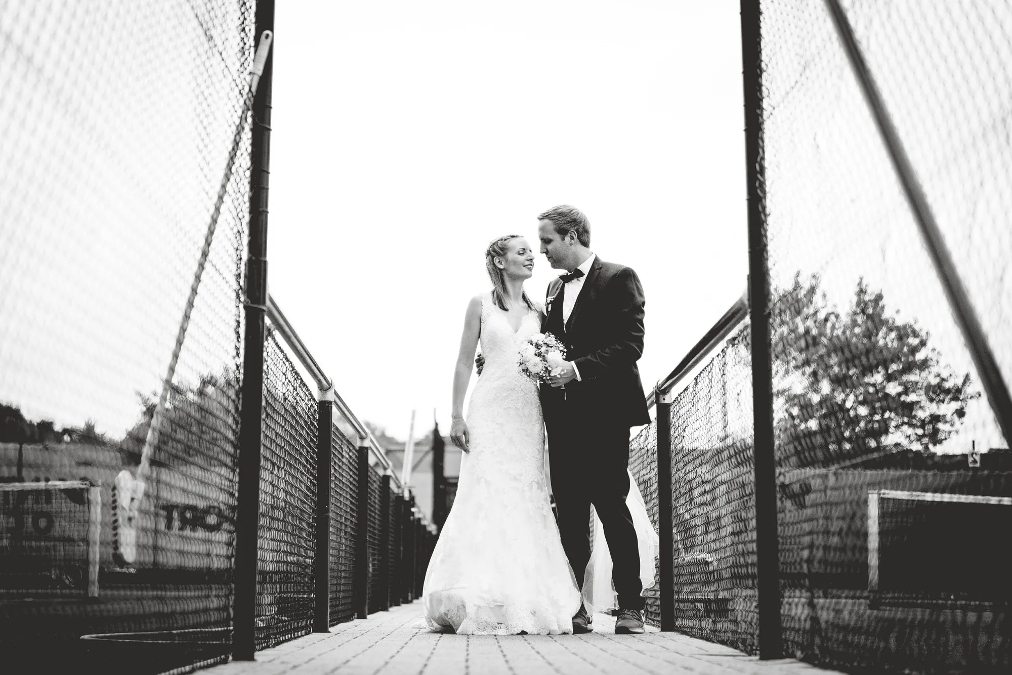 Danach zum Tennisplatz mit Zwischenstopp im Kornfeld und dann zum Hochzeitsbogen an der Wohnung. Traumhafte Paarbilder!