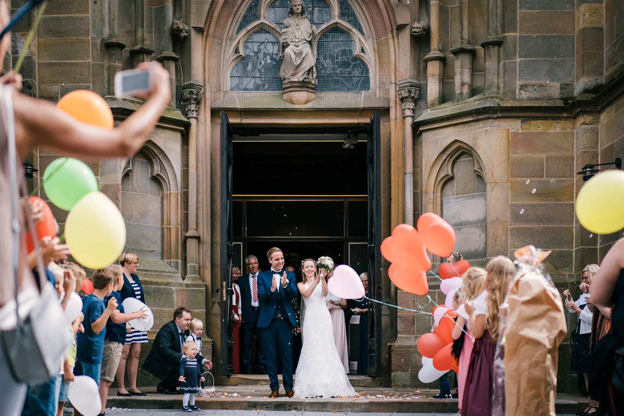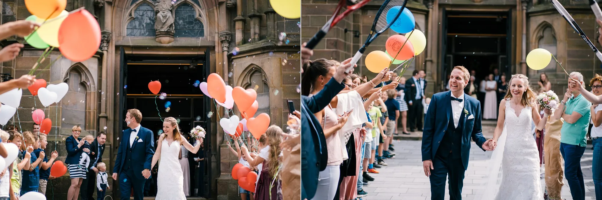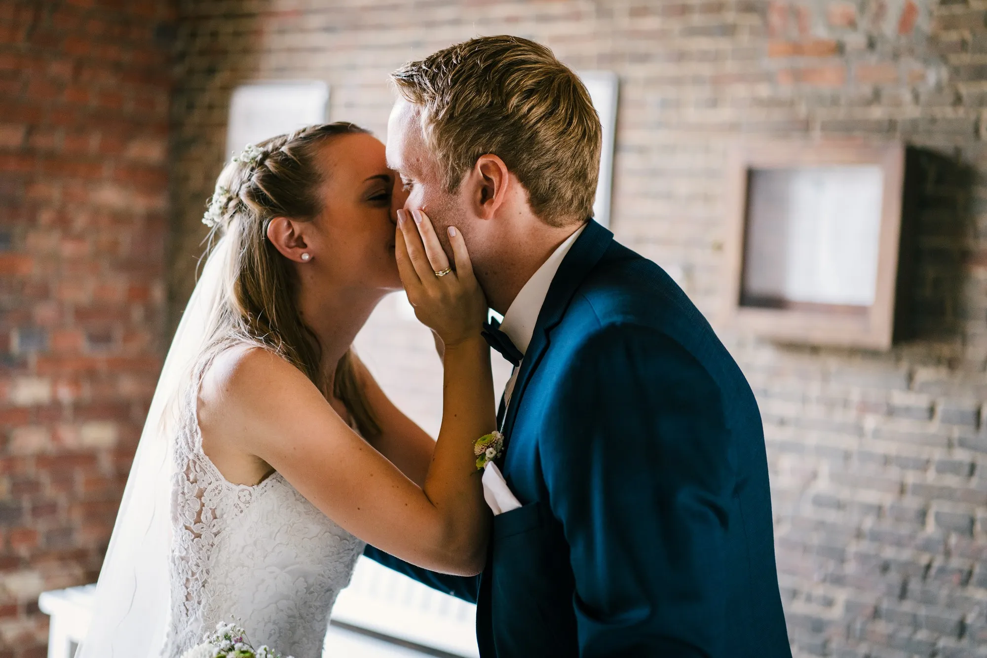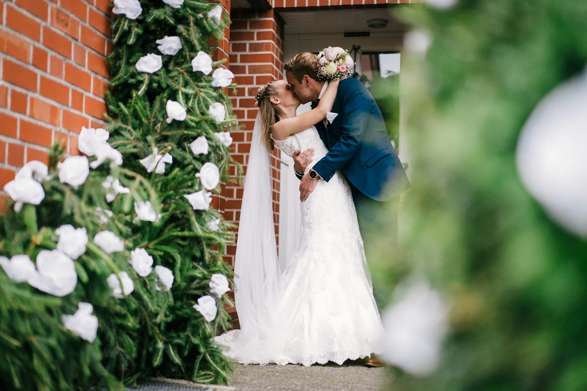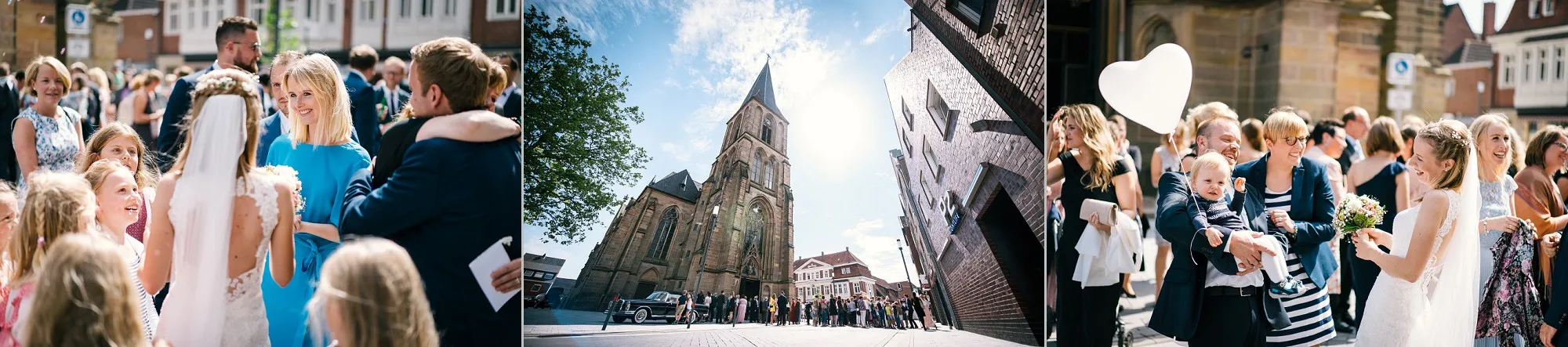 Die Trauung war in der St. Lamberti Kirche in Ochtrup. Da gibt es dieses eine Bild kurz nach der Trauung. Er schaut den Pastor an und fragt: Darf ich sie jetzt küssen? Und dreht sich zu seiner Braut. Beide Pastöre lachen und wissen erst nicht so richtig zu antworten. Aber dann: Das müsst ihr entscheiden. Alle lachen noch herzlicher und es kommt der Hochzeitskuss. Wunderbar. Ich werde da immer dran denken, wenn ich das Bild sehe.